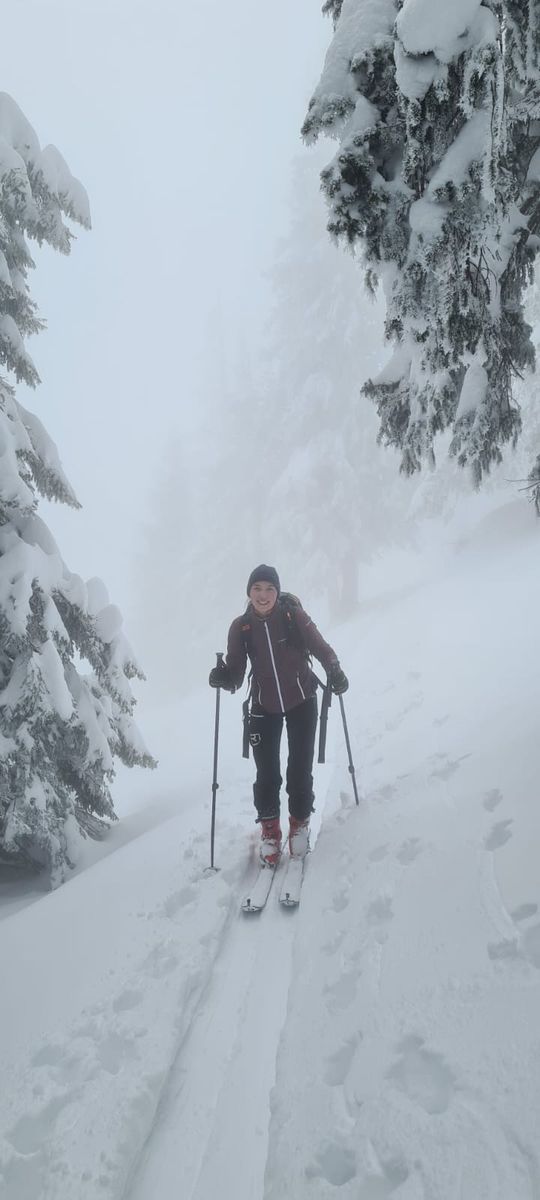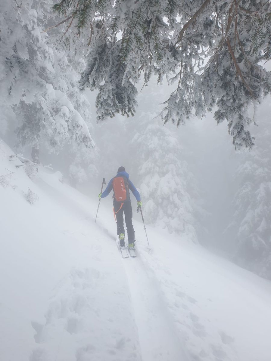 Bis zum Morgen gab es ca. 15 cm fluffigen Neuschnee ohne jeglichen Wind gefallen. Darunter eine nach wie vor feuchte, aber recht kompakte Altschneedecke. Richtung Tanzeck war außer einer 4köpfigen Gruppe niemand unterwegs; und die haben auch an der Schnittlauchmoosalm Schluss gemacht. (Richtung Taubenstein Bergstation sind etwas mehr Leute aufgestiegen.) Entsprechend unverspurt war das Gelände im oberen Bereich unserer Route; der Untere Lochgraben ist freilich ganz gut eingespurt, aber im Augenblick noch super zu fahren, weil pulvrig. Die freien Hänge im oberen Teil boten perfekten Schnee, allerdings bei 0,0 Sicht. Selbst die Alm war erst auf 10 m zu erkennen. Der Schnee war aber dermaßen fehlerverzeihend, dass es trotzdem Spaß gemacht hat.