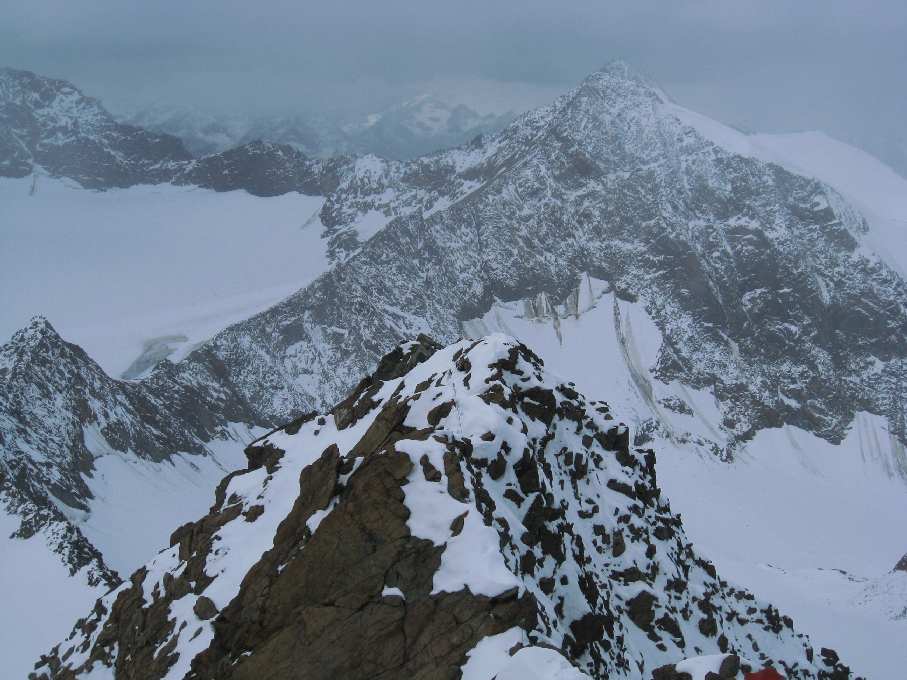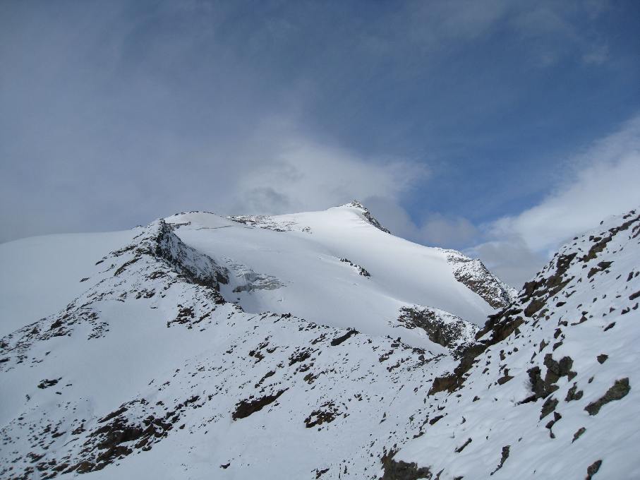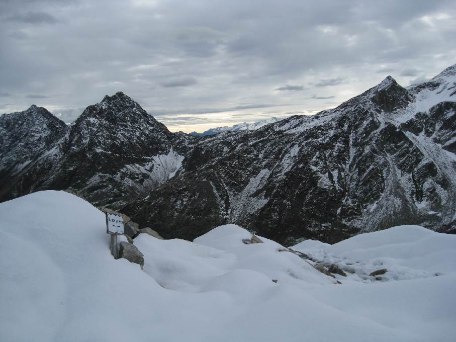 Tourenverhältnisse: Letzte Woche hat es in den Hochlagen bis zu 50cm Neuschnee gegeben.Ab 2800m war geschlossene Schneedecke. Der Weg war teilweise schon gespurt. Ab der Seescharte ist das Blockgelände ziemlich verschneit und es ist Vorsicht beim Gehen geboten. Ansonsten ist schnell mal ein Knie verdreht. Ab dem Gamsspitzl umgedreht und selber den linken Rücken gespurt, da die alte Spur über den scharfen und ausgesetzten Grat geht. Am großen Steinmann vorbei über den gut gehbaren Felsrücken, der auf 3222m den Grübelferner trifft. Hier anseilen, da es einige Spalten hat. Der Gletscher endet aber auch abrupt nach ca. 800m wieder und man kann über Schotter und den Grenzgrat problemlos auf den Gipfel gehen. Das Wetter war sehr gemischt. Von Weltuntergang, sprich Schneefall, und Sonne war alles geboten.