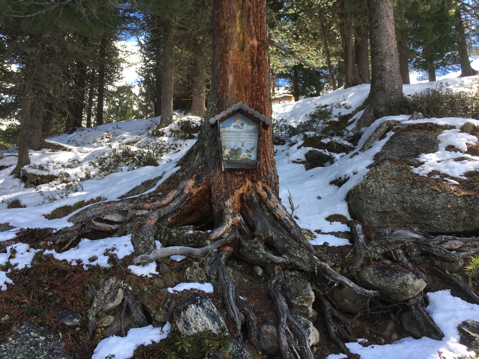 Heute konnte man mit den Skiern gerade noch ab kurz hinter dem Parkplatz über die Forststraße aufsteigen - die Abkürzer im Wald habe ich mir dieses Mal gespart. Allerdings liegt praktisch durchgehend bis zur Juifen-Alm (noch bis Mitte Mai geschlossen) nur sehr wenig Schnee / Eis auf der Straße bzw. an der Böschung. Beim Aufstieg und v.a. in der Abfahrt musste mehrfach abgeschnallt werden. Mit den warmen Temperaturen derzeit könnte die Straße in den kommenden Tagen bis weit hinauf aper werden bzw. zumindest längere Passagen. Ganz offensichtlich hat es hier auch deutlich weniger Neuschnee gegeben als etwa im Allgäu. Auch oberhalb der Alm liegt für diesen Winter überraschend wenig Schnee, die Almrosen und auch Felsen schauen schon häufig aus der Schneedecke. So schlecht, wie man auf den ersten Blick meinen würde (siehe Foto) war es dann aber nicht - man kann sich in Aufstieg und Abfahrt gut durchschlängeln und trotz relativ wenig Vorsicht habe ich auch nur zwei Mal Felskontakt in der Abfahrt gehabt.