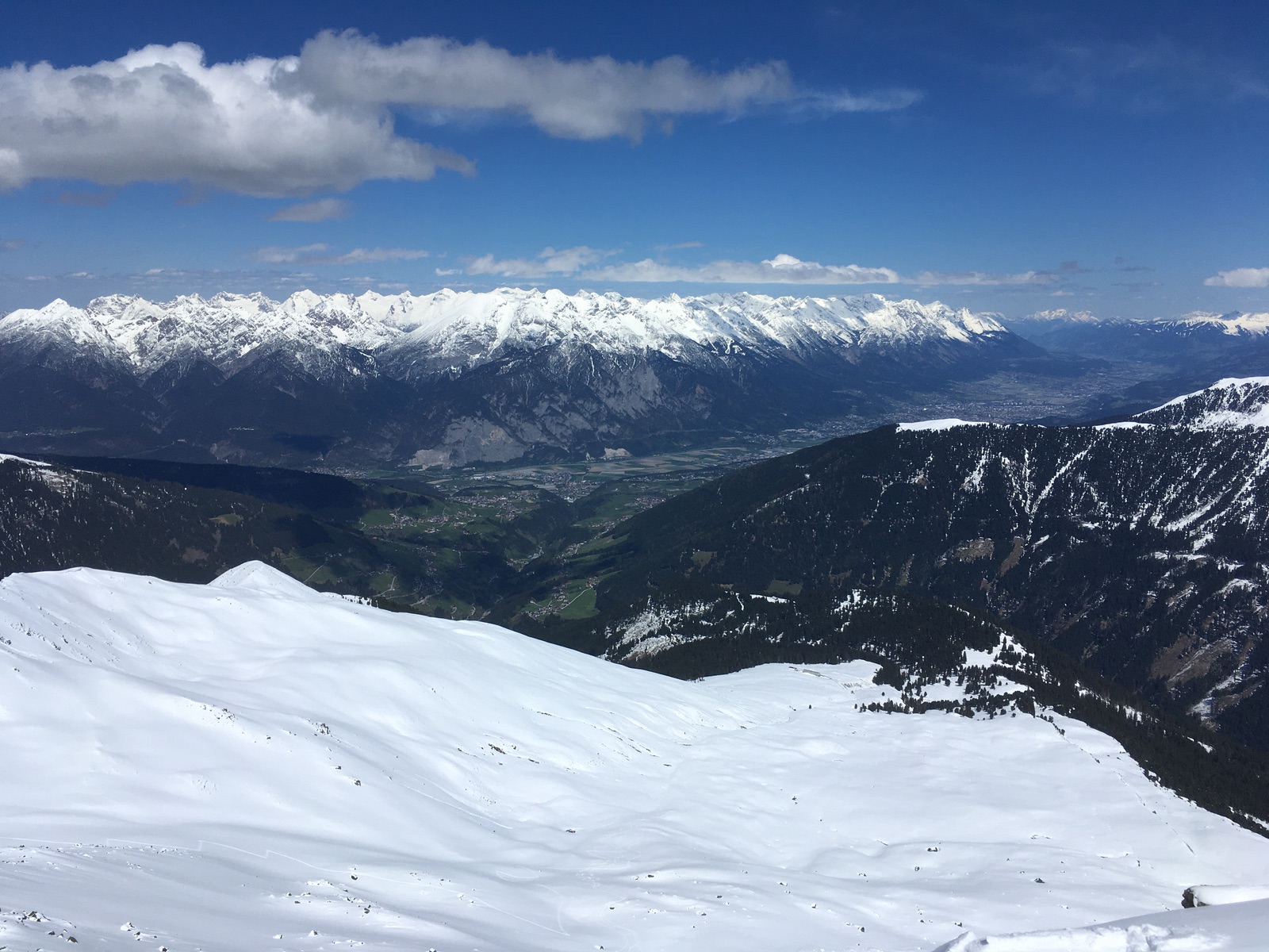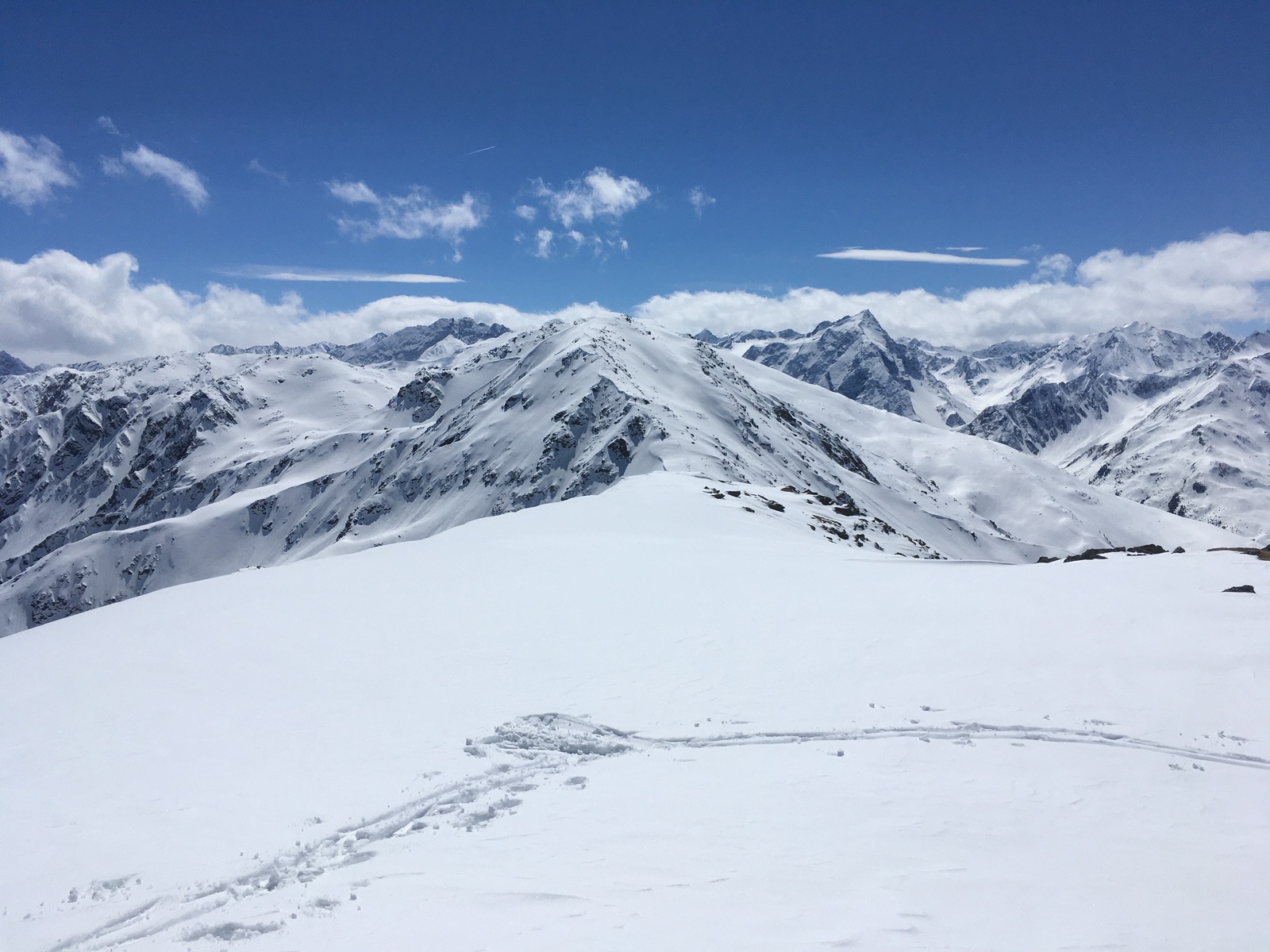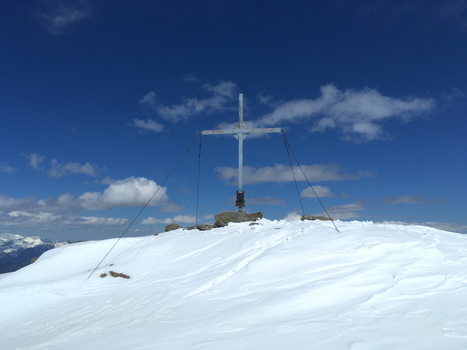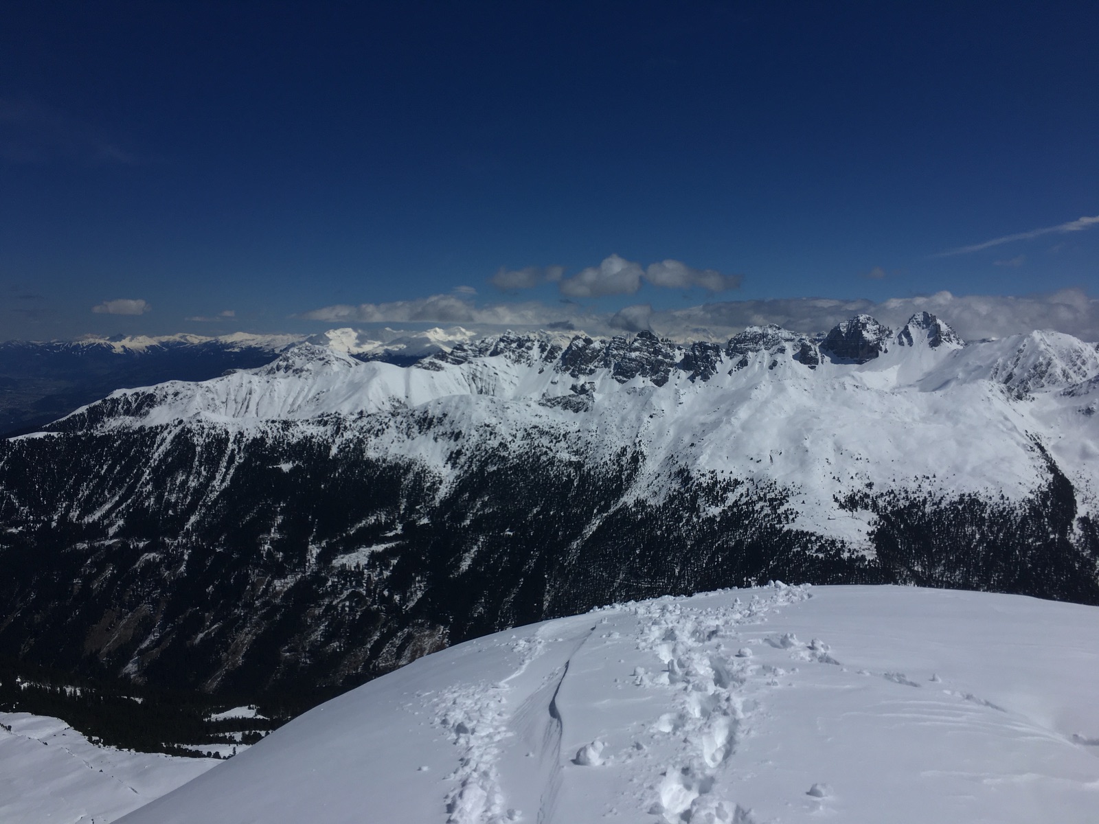Die Aussicht vom Gipfel ist hervorragend, heute habe ich sie aber wegen des (nur im Gipfelbereich) kalten Windes nicht zu ausgedehnt genossen. Ansonsten war es ziemlich warm. Vom Fotscher Tal kam auch eine Spur hoch, auf meinen Anstieg habe ich alles gespur - zum Gipfel "Auf den Sömen" gab es schon eine Spur. Gut zu sehen war der Hochbetrieb am Zischgeles. Da hat es offensichtlich deutlich mehr Schnee als am Windegg, aber da bin ich doch lieber alleine unterwegs. Letztlich war dann die Abfahrt auch deutlich besser als im Aufstieg angenommen - die Bruchharschpassagen konnten fast vollständig vermieden werden und so gab es eine Mischung aus einer Art Firn und Feuchtpulver.
