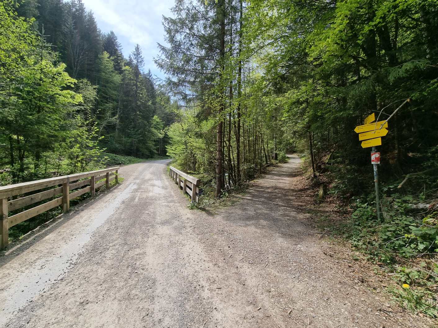 Von rechts kommt man aus dem Wald herunter und stößt auf die Forststraße am Breitenbach, der man bis zur Aueralm folgt