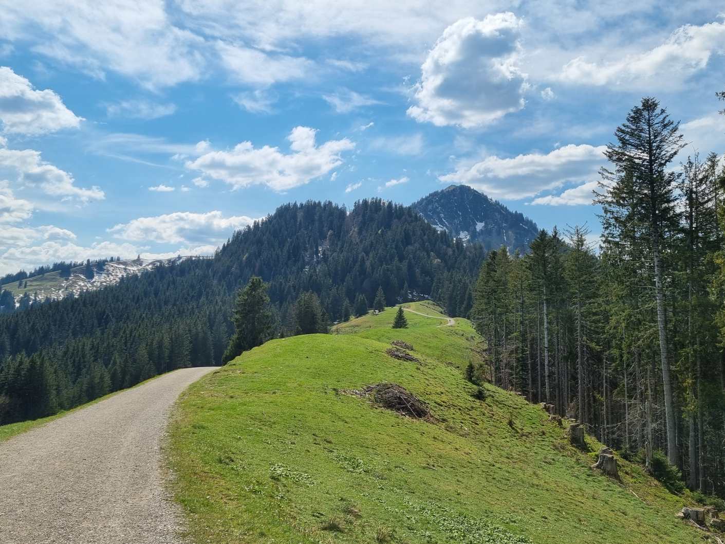 Bei der Aueralm auf unscheinbarer Spur die Wiese Richtung Waldrand überqueren (dort ein Schild Richtung Lenggries/Steinbachtal). Auf kurzem, bazigen Trail (ggfs. schieben) durch den Wald bis man auf die Forststraße stößt. Sehr schöne Abfahrt über 12 Km am Steinbach entlang, bis man am Sonntratn-Parkplatz nördlich von Lenggries im Tal rauskommt. Von dort in 10 Minuten zum Bahnhof Obergries.