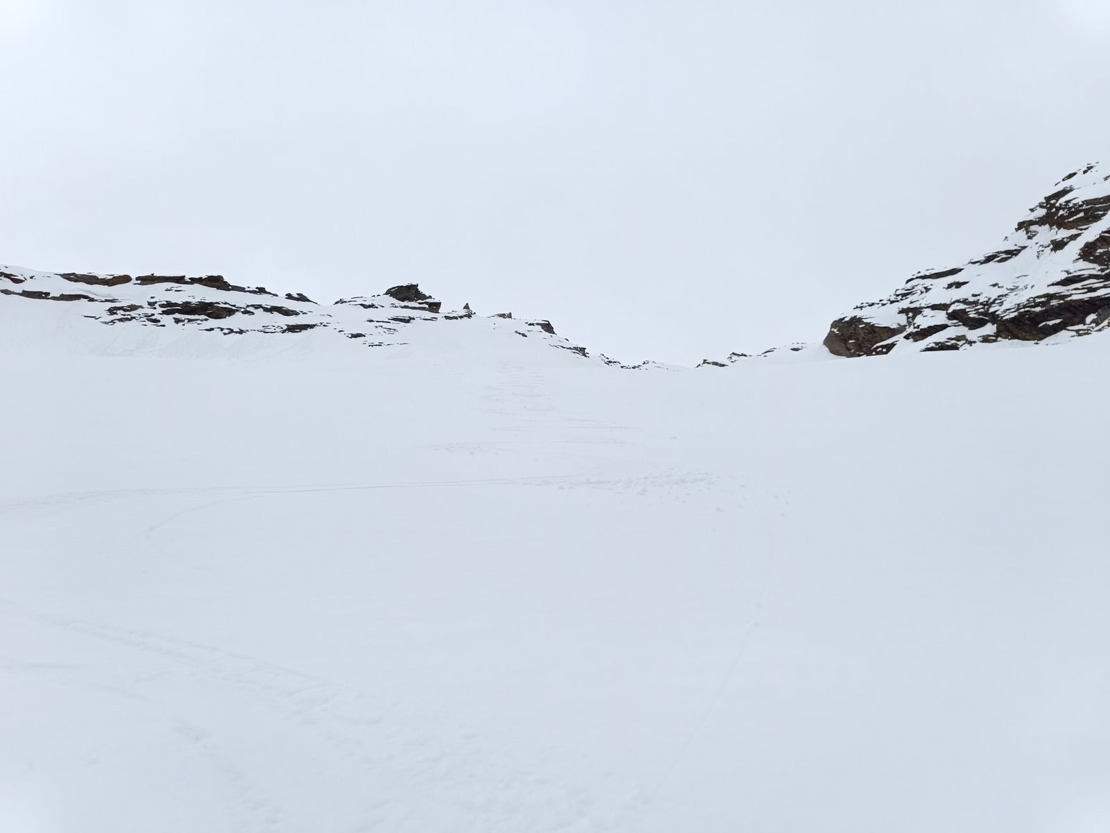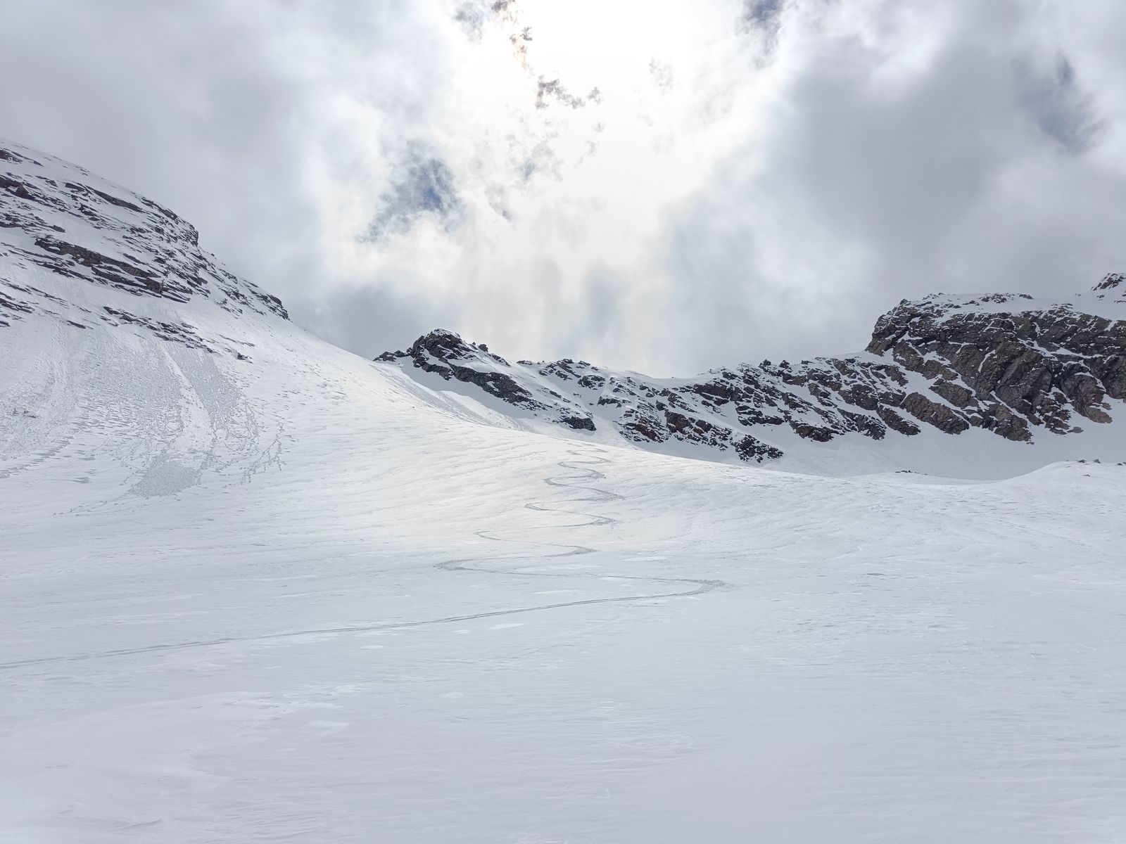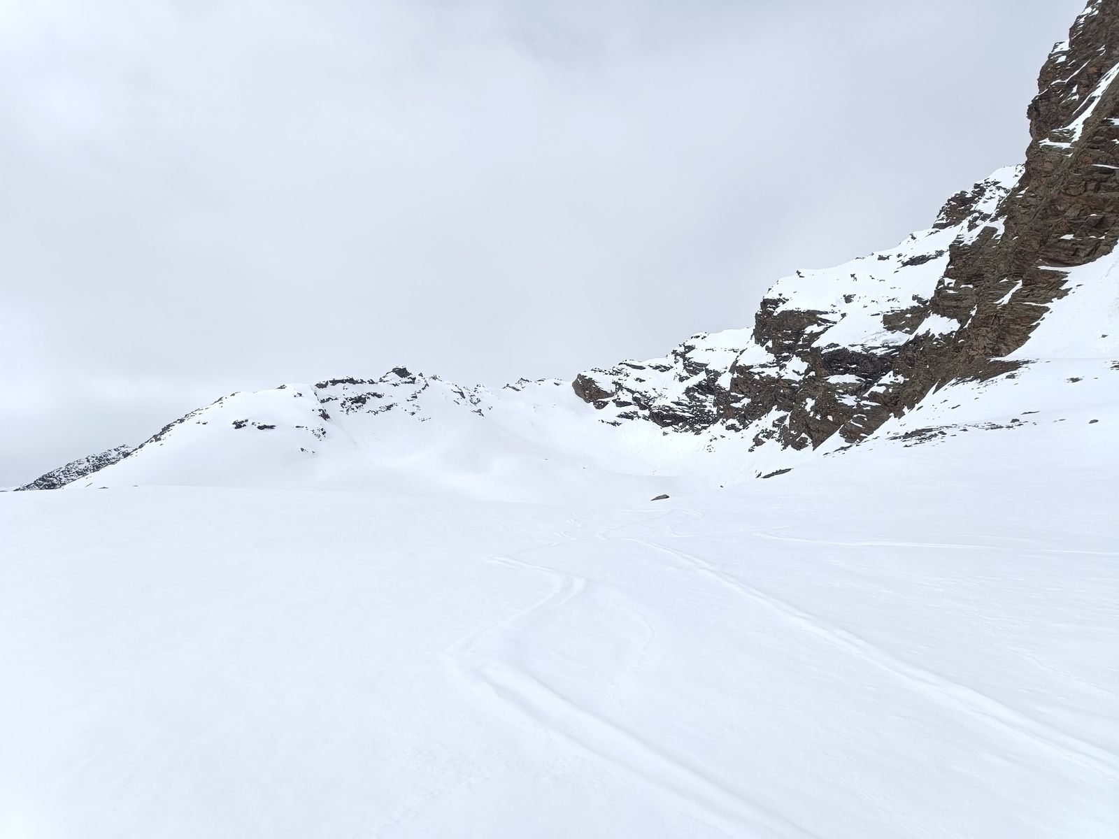 Nachdem ich mein Zeugs im Winterraum deponiert hatte, bin ich zum Gleirscher Fernerkogel aufgebrochen. Das zieht sich! Von der Hütte geht es mit wenig Höhengewinn mindestens 90 Minuten dahin, bis man an geeigneter Stelle (d.h ohne Höhenverlust) zum Vorfeld des (harmlosen) Gletschers kommt. Der Gipfel selbst kommt erst sehr spät ins Blickfeld. Als ich den Steilaufschwung zum Gipfel am Ende des Gletschers erreichte, war es bereits 14.15 Uhr und der Schnee hier (ostexponiert) so weich, dass ich ihm nicht mehr vertraute. Stattdessen bin ich zur Rosskarscharte hoch. "Die fehlte mir nämlich noch", würde Jonas wohl an dieser Stelle schreiben 😉. Die Abfahrt war oben gut, aber der lange, sehr flache untere Teil war schon zäh. Unterhalb der Hütte (Abfahrt am Anstiegsweg unsinnig) wieder auffellen und hoch.