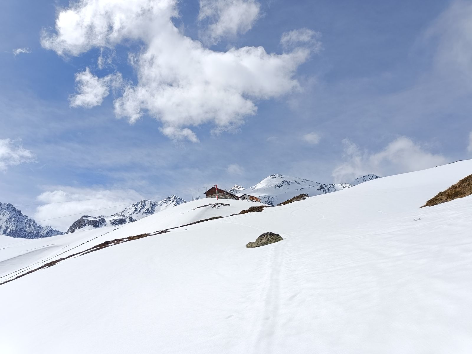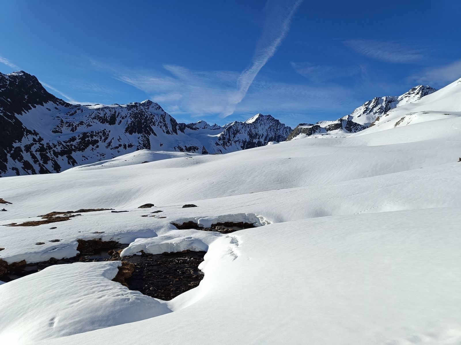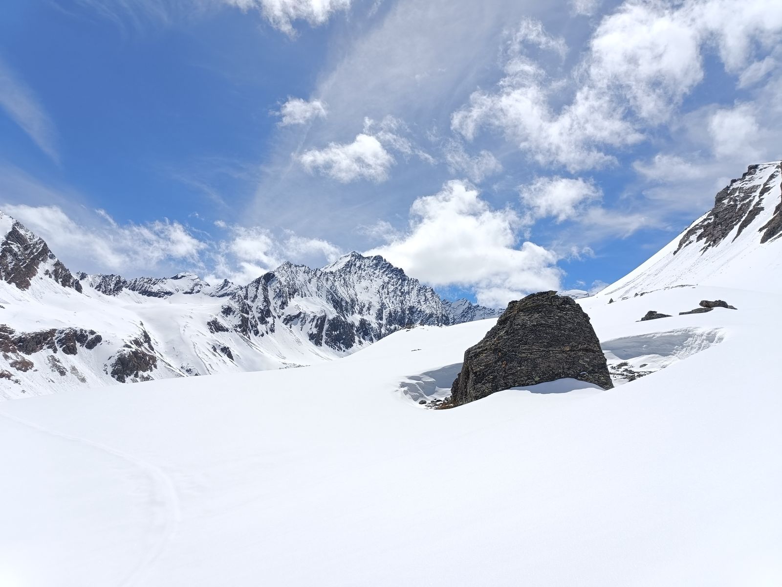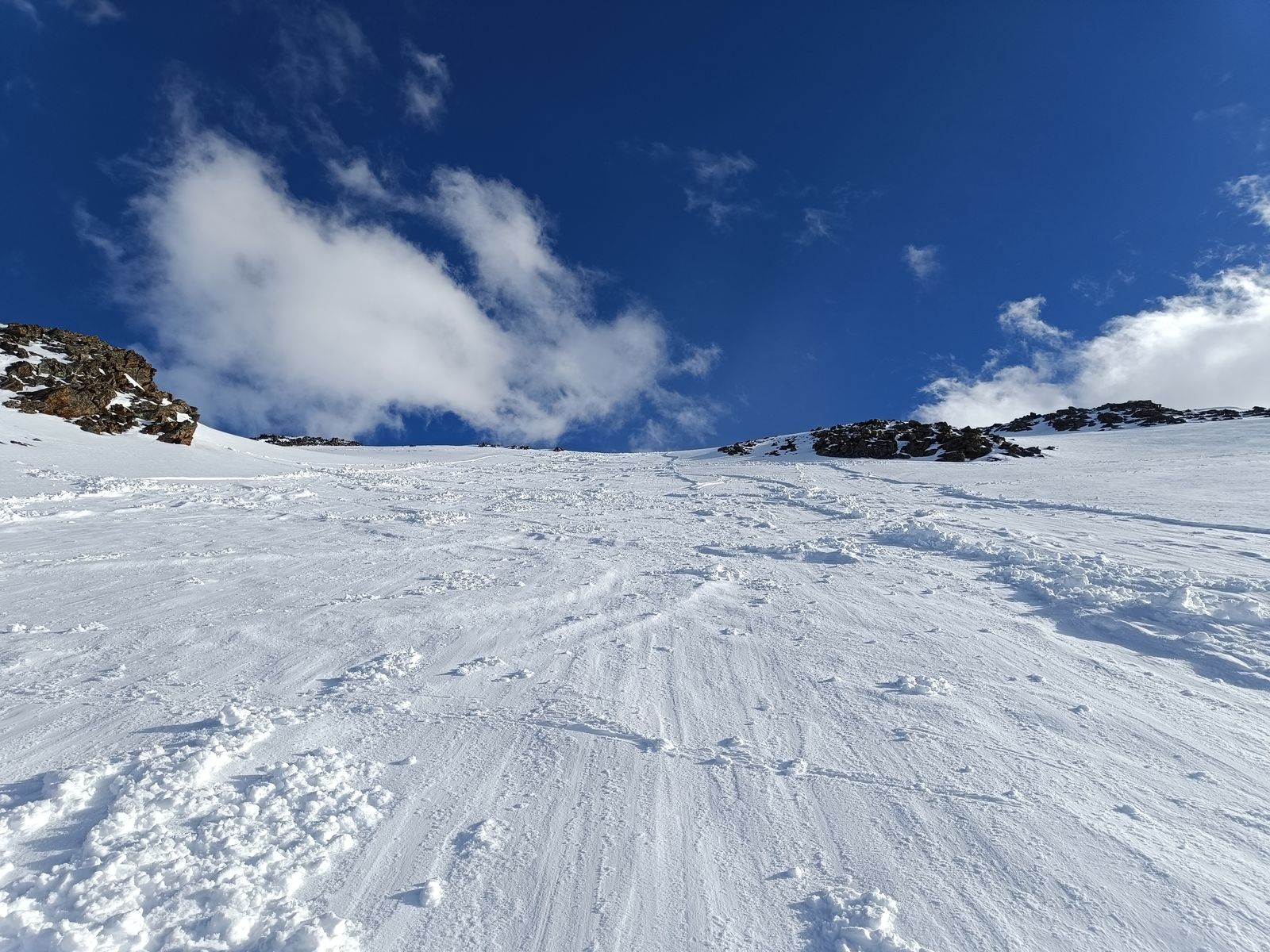 Nachdem ich mein Zeugs im Winterraum deponiert hatte, bin ich zum Gleirscher Fernerkogel aufgebrochen. Das zieht sich! Von der Hütte geht es mit wenig Höhengewinn mindestens 90 Minuten dahin, bis man an geeigneter Stelle (d.h ohne Höhenverlust) zum Vorfeld des (harmlosen) Gletschers kommt. Der Gipfel selbst kommt erst sehr spät ins Blickfeld. Als ich den Steilaufschwung zum Gipfel am Ende des Gletschers erreichte, war es bereits 14.15 Uhr und der Schnee hier (ostexponiert) so weich, dass ich ihm nicht mehr vertraute. Stattdessen bin ich zur Rosskarscharte hoch. "Die fehlte mir nämlich noch", würde Jonas wohl an dieser Stelle schreiben 😉. Die Abfahrt war oben gut, aber der lange, sehr flache untere Teil war schon zäh. Unterhalb der Hütte (Abfahrt am Anstiegsweg unsinnig) wieder auffellen und hoch.