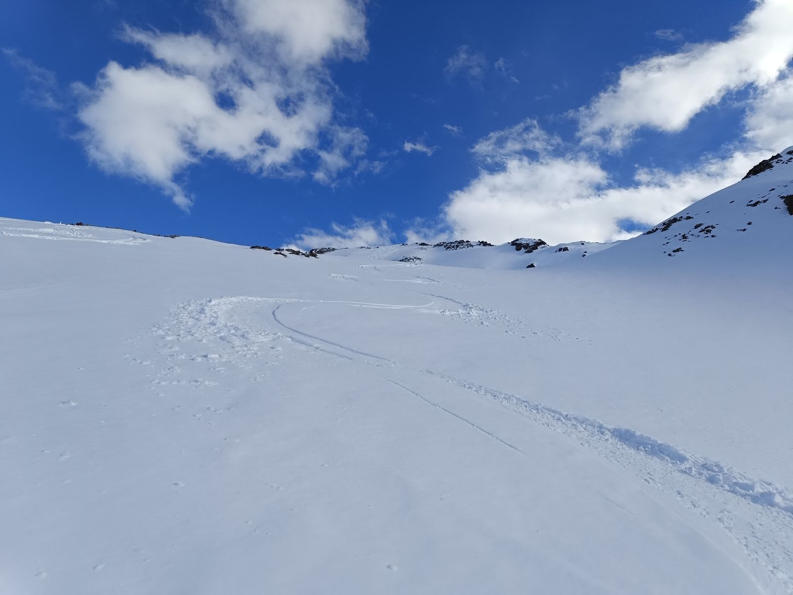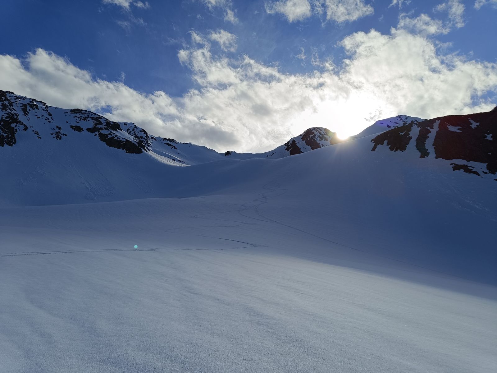 Anschließend bin ich meiner Spur vom Samstag ein Stück gefolgt, dieses Mal aber zur Hinteren Sonnenwand aufgestiegen, die ich noch nicht kannte. Eine wunderbare Tour, die über 800 Hm perfektes Skigelände bietet. Die oberen 300Hm nasser Pulver, darunter Firn.