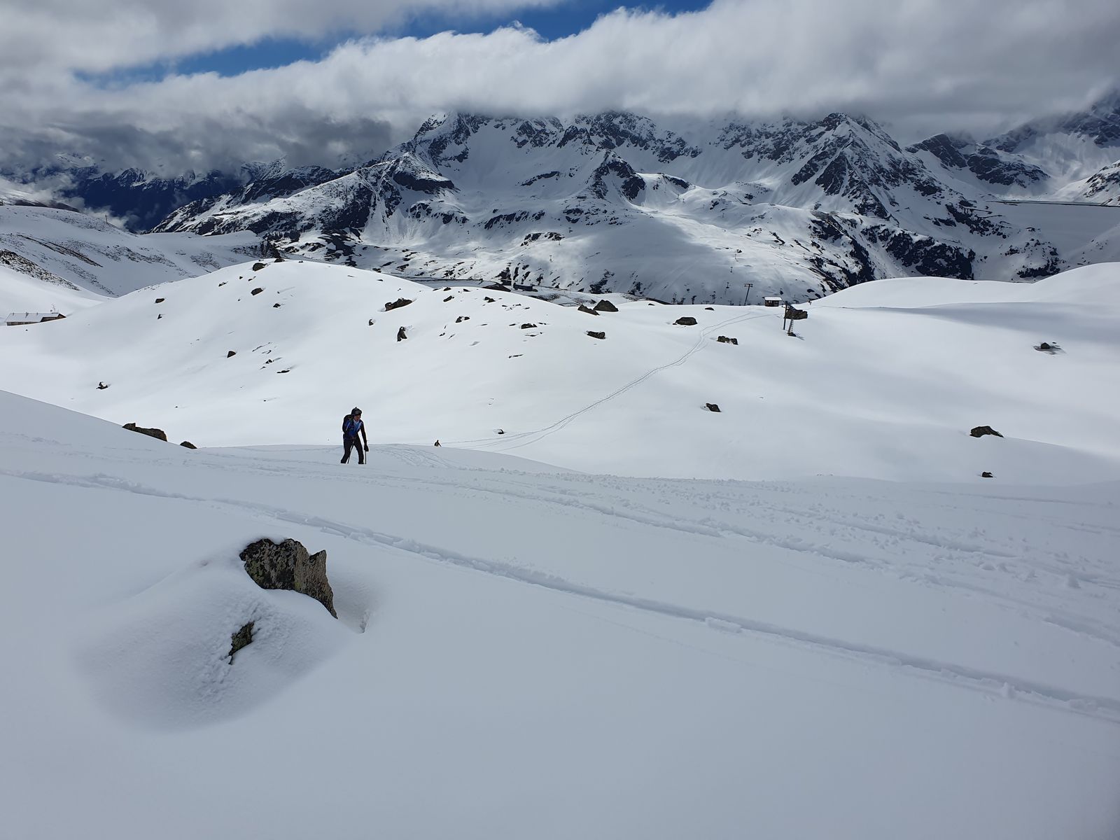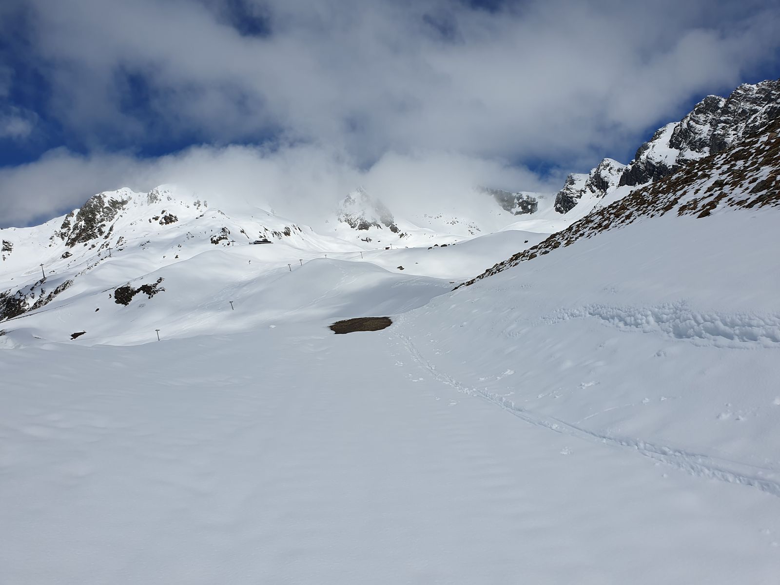 Bei der erste Abfahrt dann doch etwas white-out und schöne B-Noten - allerdings mit einem kleinen Schaden am Skischuh: die auch schon vorher etwas marode Schließbefestigung am Schuhschaft ging dabei kaputt und ich konnte notdürftig improvisieren, die Tape-Rolle im Auto war leider zu weit weg (kommt in Zukunft wieder in den Rucksack). So ging es dann "lockerer" weiter.