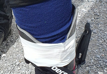 7: Schuh mit Tape, darunter die Improvisation mit Skiclip (Plan C: el. Binde aus 1.Hilfeset war nicht nötig)