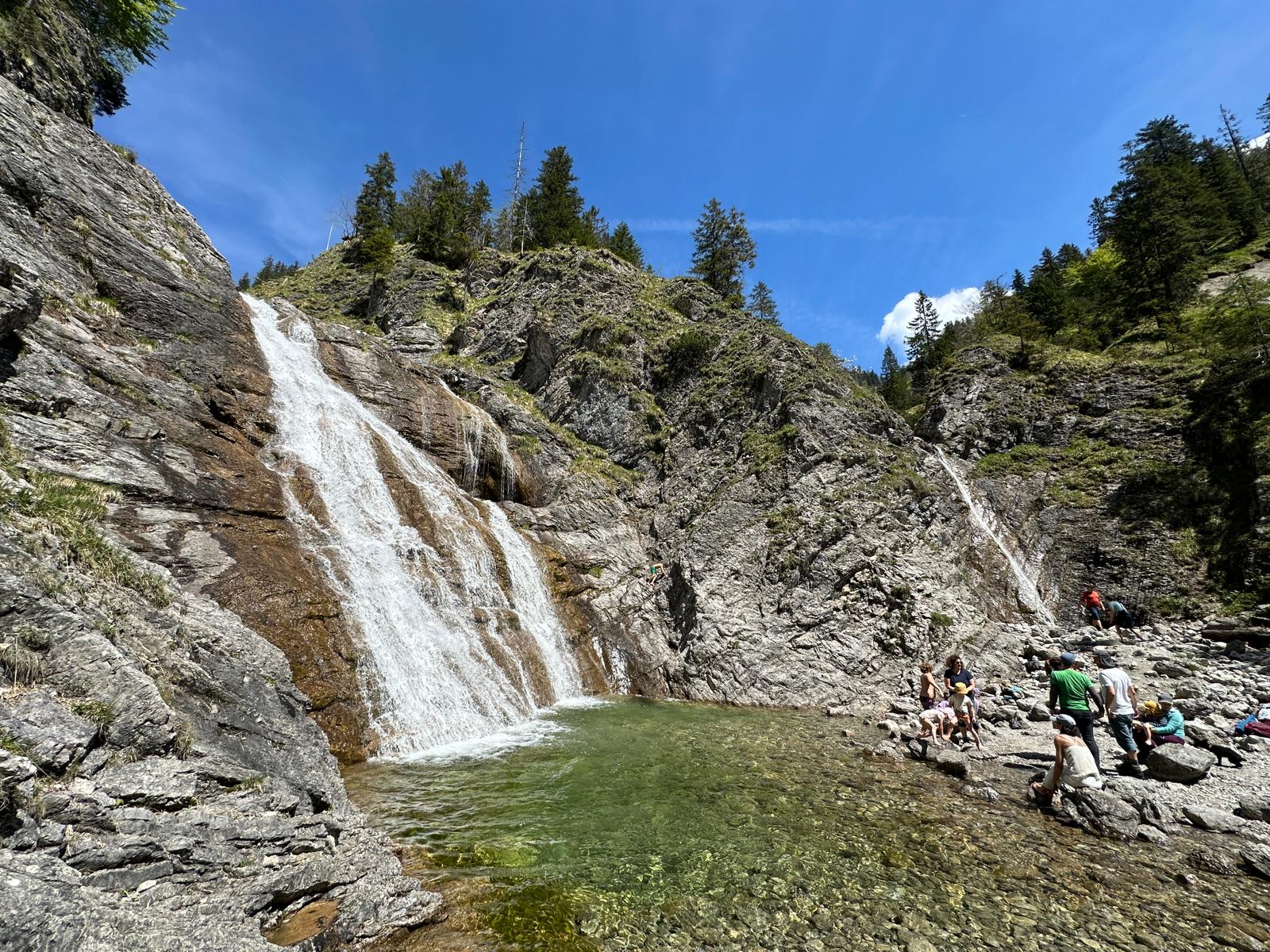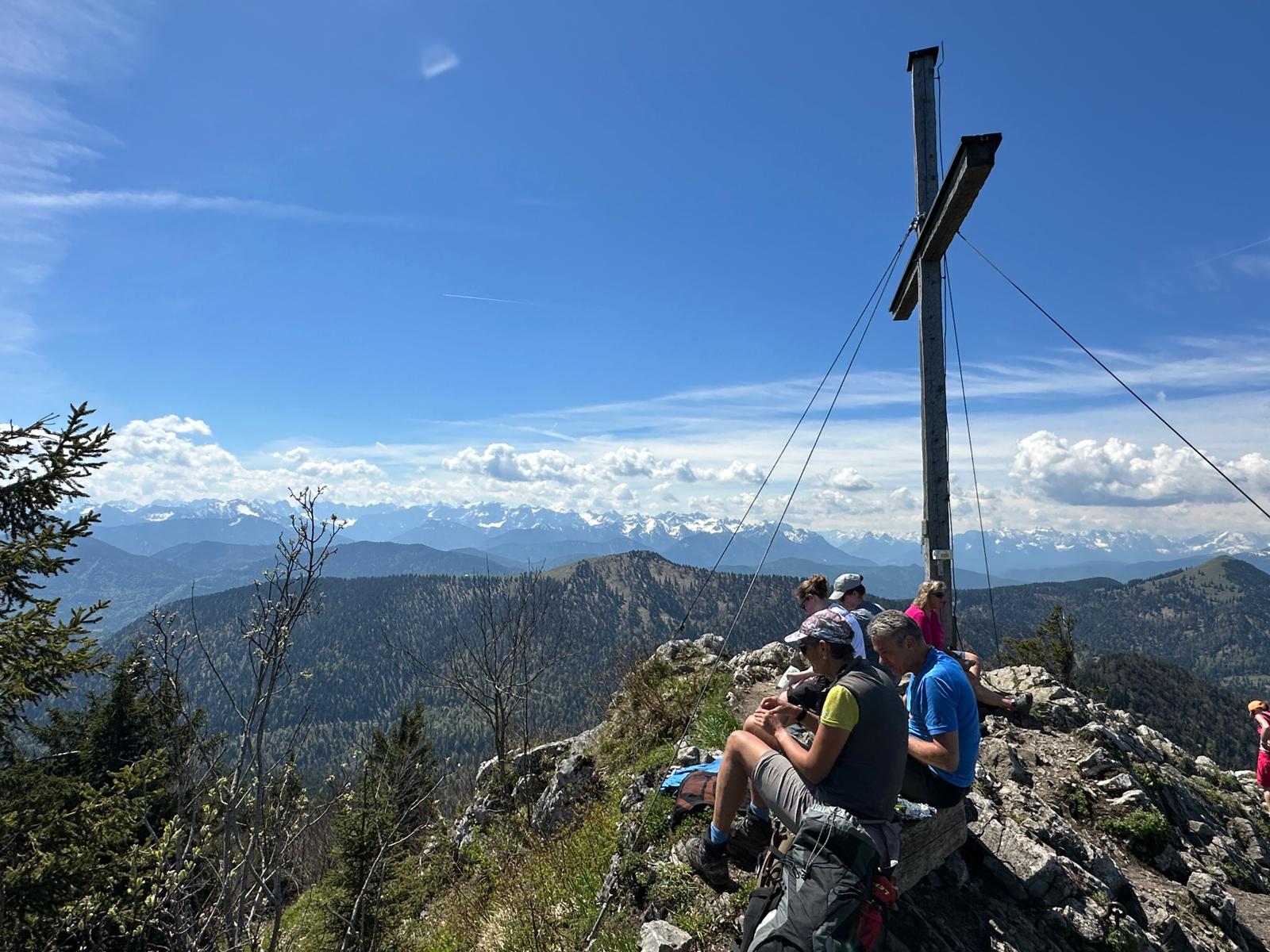 Auffahrt zur Staffelalm (war heute an Muttertag bewirtschaftet, Vieh kommt erst in 4-6 Wochen), Aufstieg zum Gipfel, Brotzeit mit toller Rundumsicht. Auf dem Rückweg noch ein kurzer Abstecher zum schönen Laintal-Wasserfall.
