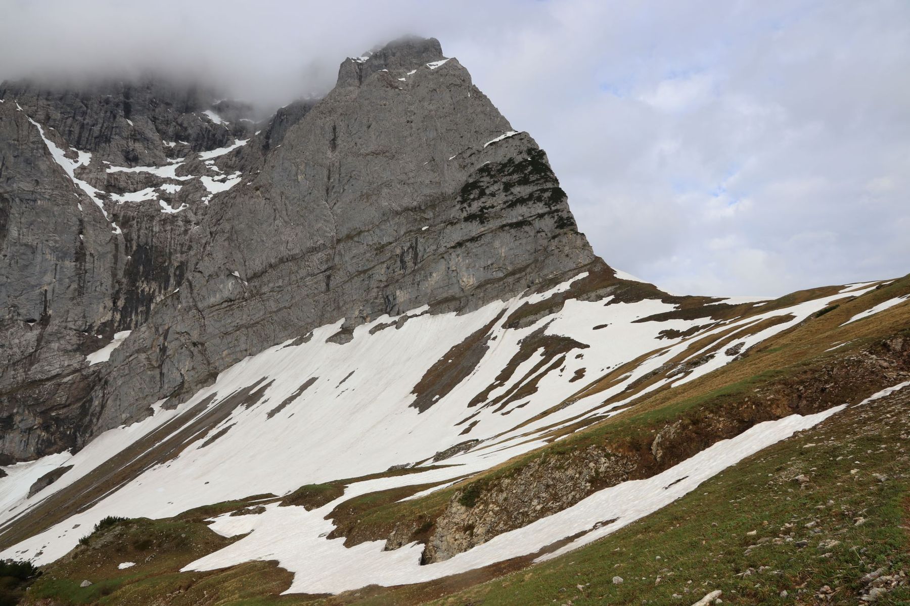 Auf dem Anstieg zum Hohljoch kein Schneekontakt. Die Querung unter den Laliderer Wänden zur Falkenhütet hat hingegen noch viel Schnee, wie von dort zu sehen war.