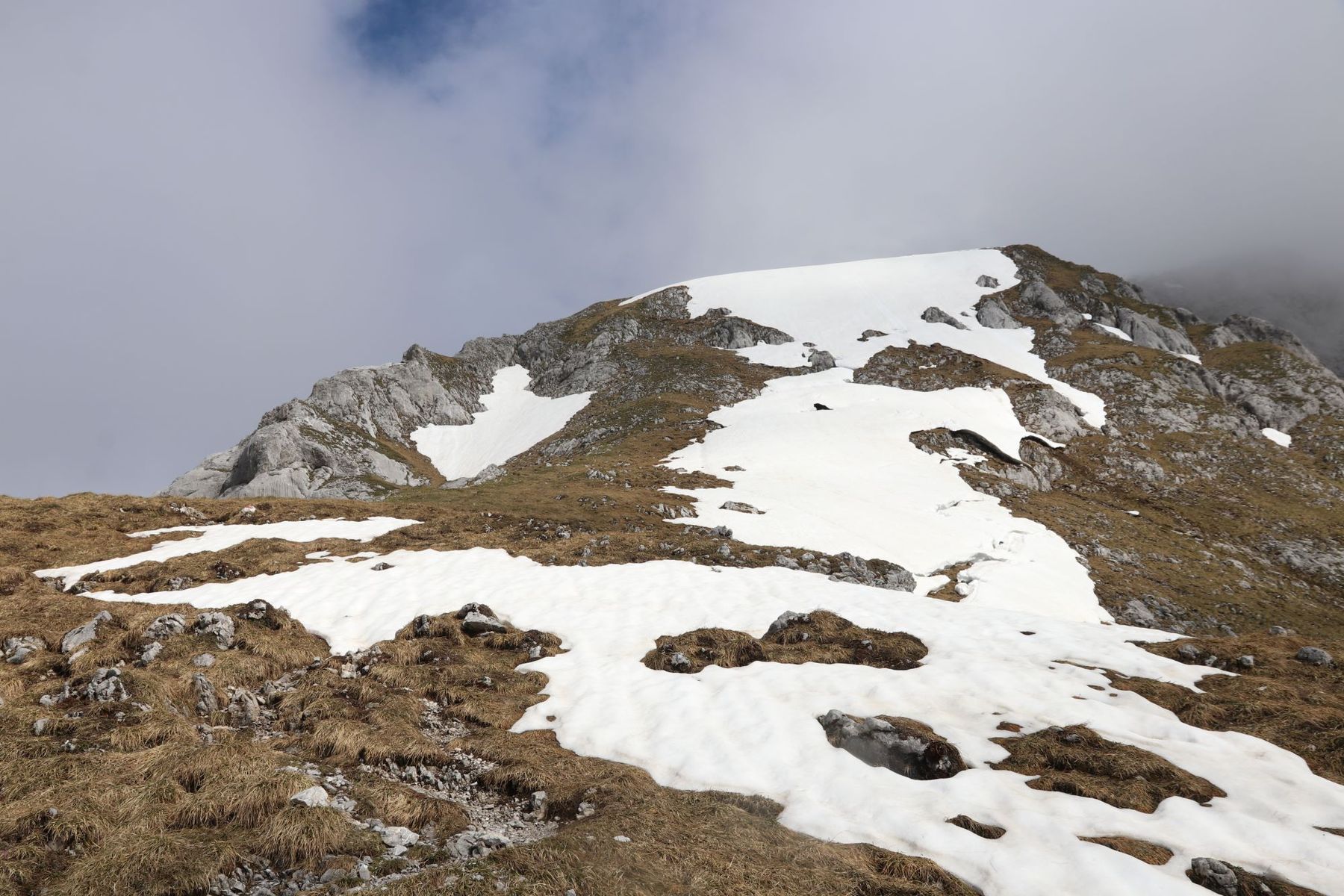 Auf der Querung zum Gumpenjoch auch fast kein Schneekontakt. Erst auf 2300 m, dort wo sich das Gelände an der "Gamssatt" zurücklegt, liegt noch ein richtig großes Schneefeld. Am Gipfelkamm liegt ein problemloser "Firnrücken".