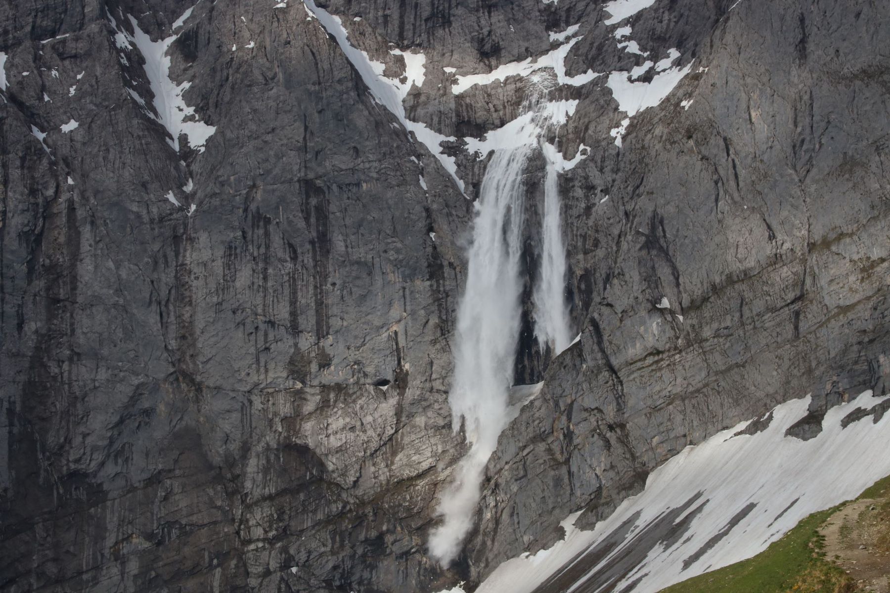 Beim Abstieg waren Gamaschen und Teleskopstöcke aber sehr hilfreich ... und zwar nicht nur für den Altschnee, sondern für den direkten Abstieg über den Gumpenbach mit seiner steilen Geröllrinne. Wie meistens nach dem Winter ist der Pfad hier stellenweise erodiert und der zu querende Bach hat auch jetzt während der Schneeschmelze recht viel Wasser.