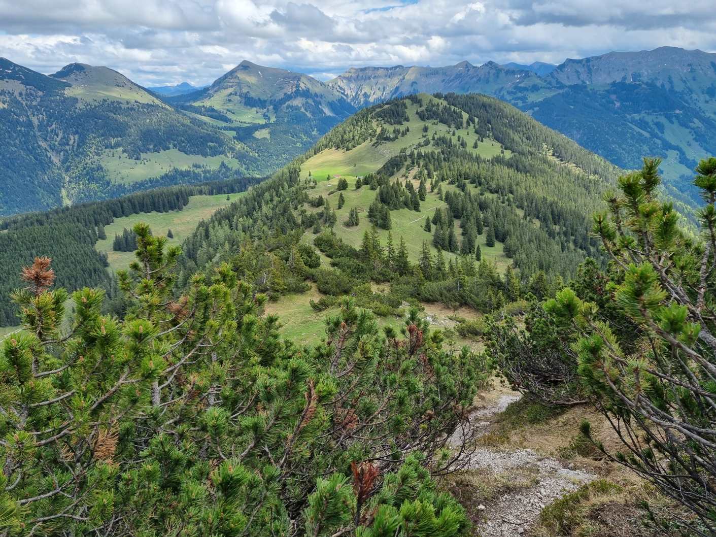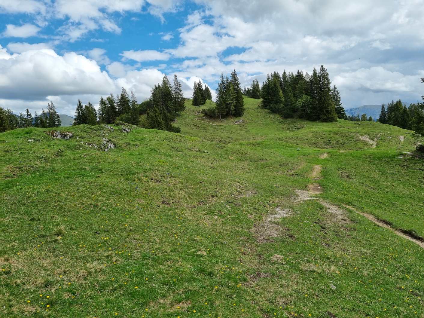 Vom östlichen Torjoch Abstieg nach Osten Richtung Lerchkogel. Bei Erreichen des flachen Grasplateaus muss man zum zweiten Mal aufpassen. Völlig unscheinbar zweigt links der Rückweg zur Ludernalm ab (auch hier Karte + GPS obligatorisch).