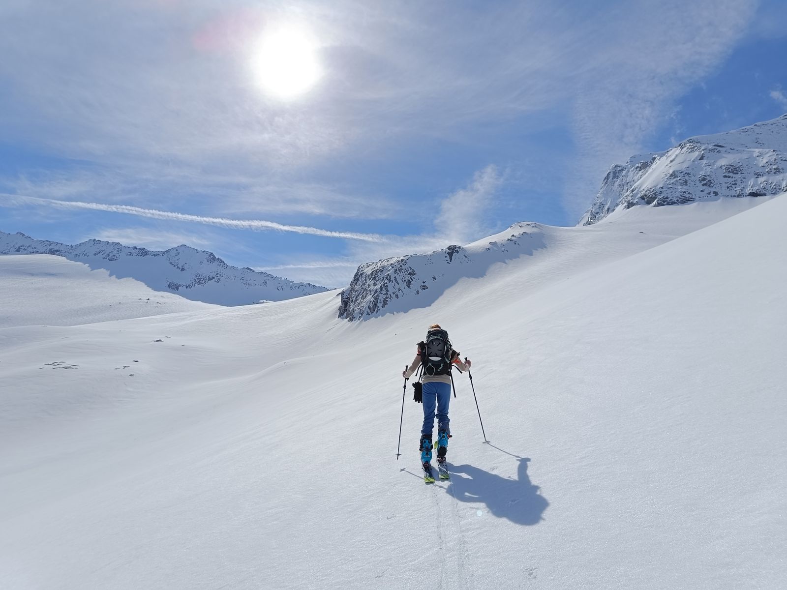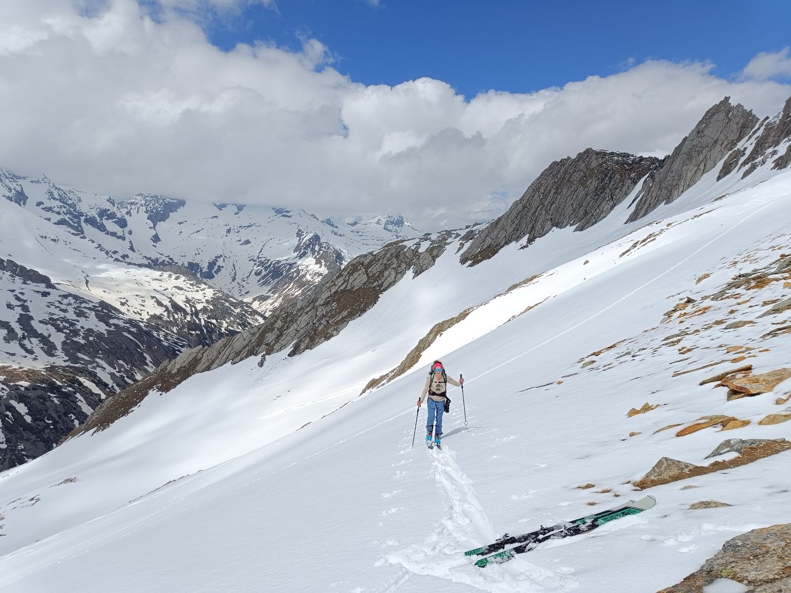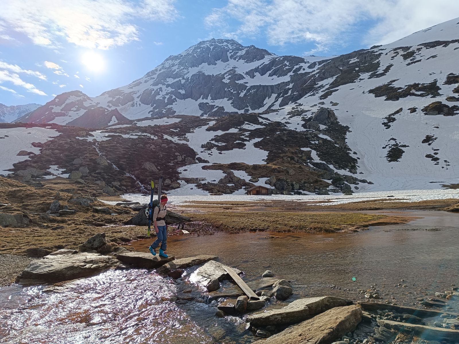 Nachdem wir dann um 5 wieder am PP waren, wurde der Rucksack flugs umgepackt und es ging Richtung Furtschaglhaus. Das ist jetzt der Part, wo mancher vielleicht den Kopf schütteln wird, denn der westseitige Aufstieg ist bis zur Hütte komplett schneefrei, was so etwa 2,5 h Tragen bedeutet. Aber der geniale Tag heute hat gezeigt, dass es diese Mühen wert war - der Wettergott hat uns dafür belohnt.