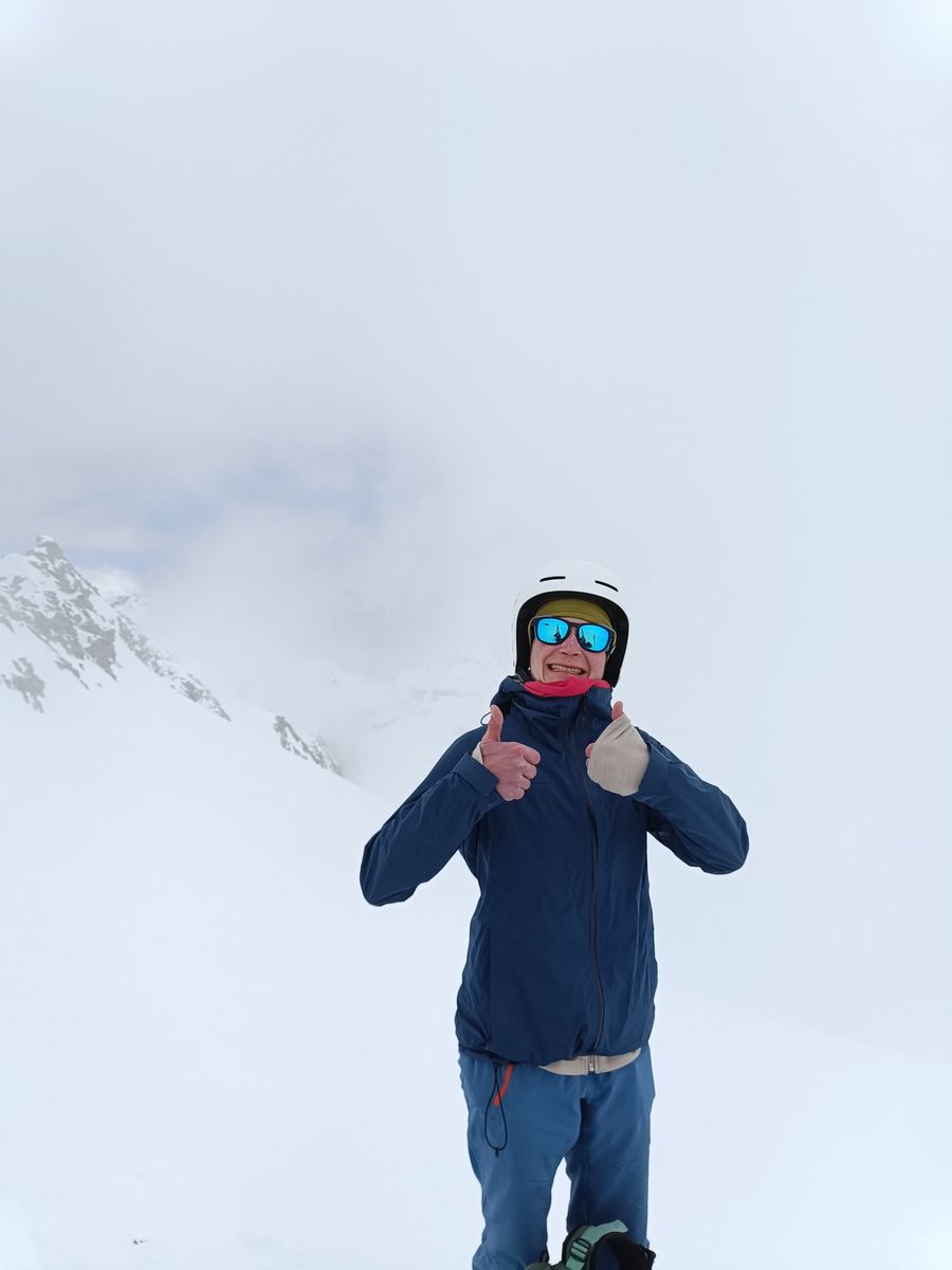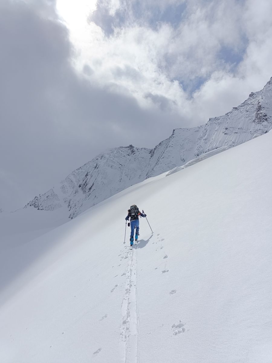 Los geht es mit Skiern am Rücken und am besten zunächst mit gemütlichen Wanderschuhen, denn erst nach der Lavizalm liegt Schnee. 45-60 Minuten Tragen also. Mit Skiern sind wir auf dem üblichen Weg via Stampflkees (spaltentechnisch harmlos) zur Hohen Wand bzw deren Vorgipfel, den wir zwar erst kurz vor 12 (das ist normalerweise viel zu spät wegen der Südost-Exposition) erreichten, was uns aber zum Vorteil gereichte: Etwa um 10 nebelte es total ein, was unseren Vorgängern wohl eine eher unspaßige Abfahrt bescherte, aber ich hatte zu Angie schon gesagt, dass die thermische Entwicklung voraussichtlich dazu führen wird, dass sich die Wolkendecke irgendwann plötzlich um 1000 Meter hebt. Und, was soll ich sagen...War genau der Fall als wir oben waren! Der Wettergott war uns eben hold.