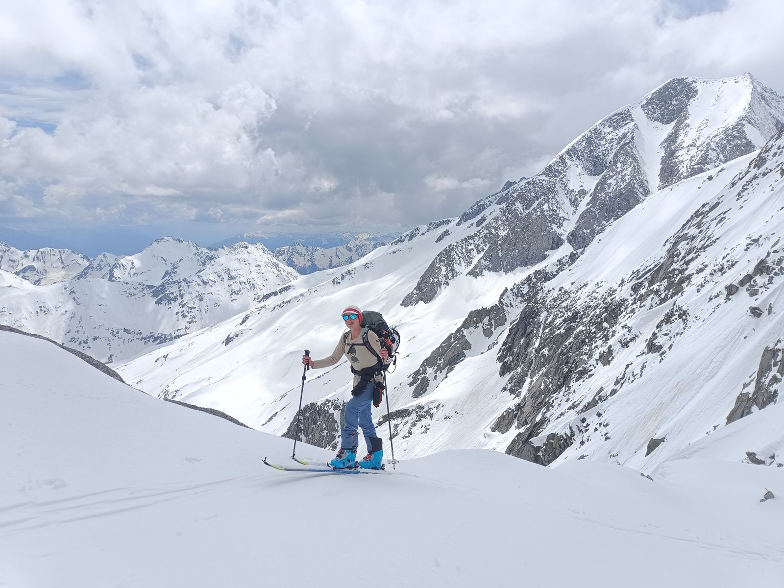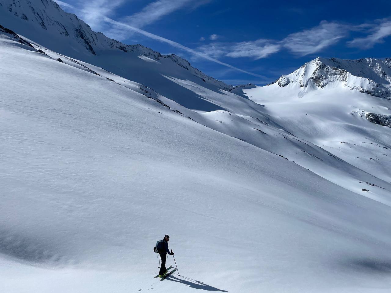 Die heutigen Ziele Schlegeisscharte und Muttenock sind alpinistisch sicher zweitrangig, bieten aber skifahrerisch echte Leckerbissen mit Riesenhängen in idealer Neigung von 800 Hm und mehr. Und: Totale Einsamkeit - auf dem Schlegeiskees völlig alleine unterwegs zu sein, ist einfach so ein feines Erlebnis!