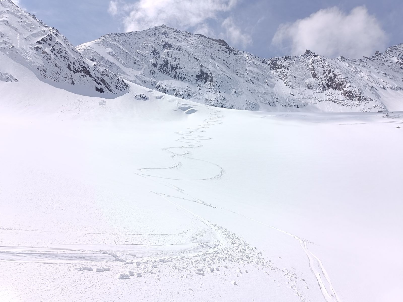 Zunächst sind wir wir von der Hütte (nun mit Ski) etwa 200 Hm aufgestiegen. Es folgt eine Querabfahrt (fast 200 Hm, Abfellen sehr sinnvoll) bis mittig unter den Breitnock. Nun sind wir zunächst zur Schlegeisscharte, obwohl der Weg dorthin viel weiter ist als zum Muttenock. Grund: Weg zur Scharte Ost bis Nordost; Muttenock voll Nord. Die Abfahrt von der Scharte - ein Gedicht: Oben Pulver, nahtlos in perfekten Firn übergehend. Anschließend hoch zum Muttenock, dem wahrscheinlich unscheinbarsten "Gipfel" der Zillertaler, der aber eine ganz tolle Abfahrt bereithält! Oben um 15 Uhr Firn, unterhalb 2500 Metern in Sulz übergehend.