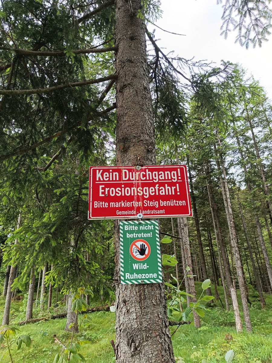 Hierzu ein paar Worte: Am Beginn warnt ein völlig sinnbefreites rotes Schild vor Erosionsgefahr; zudem wird auf einem zweiten Schild darum gebeten, hier wegen Wildschutz nicht zu gehen. Natürlich wollen da aber bloß die Jäger nicht gestört werden... Als ich vor ziemlich genau zwei Jahren (siehe Bericht hierzu von damals) hier das letzte Mal unterwegs war, versperrte ein fünflagiger, 1,5 m hoher Stacheldrahtzaun nach etwa 2/3 der Strecke den Weiterweg. (Bin damals dennoch drüber gekommen.) Seitdem scheint sich hier ein regelrechter Kampf zwischen den Jägern und (vermutlich einheimischen) Wanderern abgespielt zu haben, da der Zaun offensichtlich mehrfach durchschnitten wurde. Die Jäger gingen dabei sogar so weit, NATO-Stacheldraht (ja, richtig gelesen; das ist der mit den eingearbeiteten Rasierklingen!) zu verwenden, aber auch der wurde zerschnitten (siehe Bilder). Mittlerweile scheinen die Wanderer den "Kampf" gewonnen zu haben, da ein Durchlass durch den Zaun gebaut wurde. Das freut mich dermaßen! Dass die Leute sich halt doch nicht immer alles gefallen lassen und den Nepp mit dem Wildschutz (am Jochberg...pfff) durchschauen .Der mit Abstand schönste Weg auf den Jochberg ist also auch offiziell wieder machbar. Ich muss zugeben, dass ich heute selber Werkzeug dabei hatte, um mich durch den Zaun zu mogeln... War aber nur eine Kombizange, um den Draht von den Pfosten zu kriegen und dann drüberzusteigen.