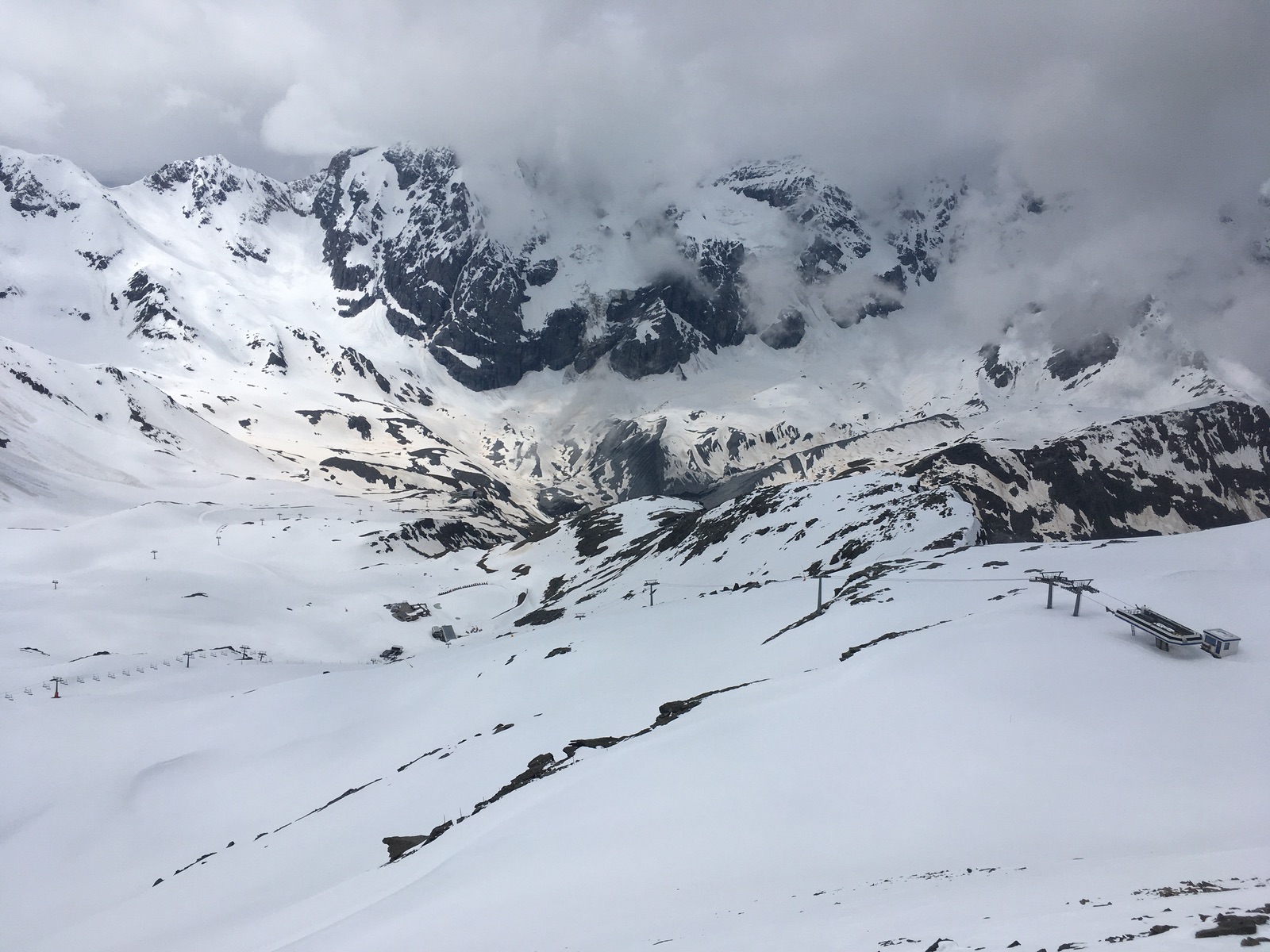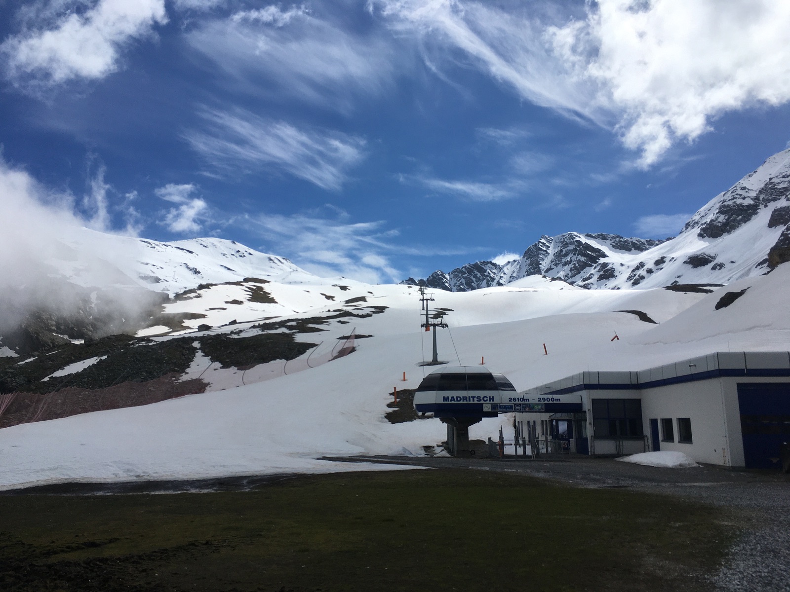 Blick von der Bergstation auf den weiteren Anstieg (vorne ist es aper, weil ausgeschoben wurde - auf der Höhe liegt noch viel Schnee!):