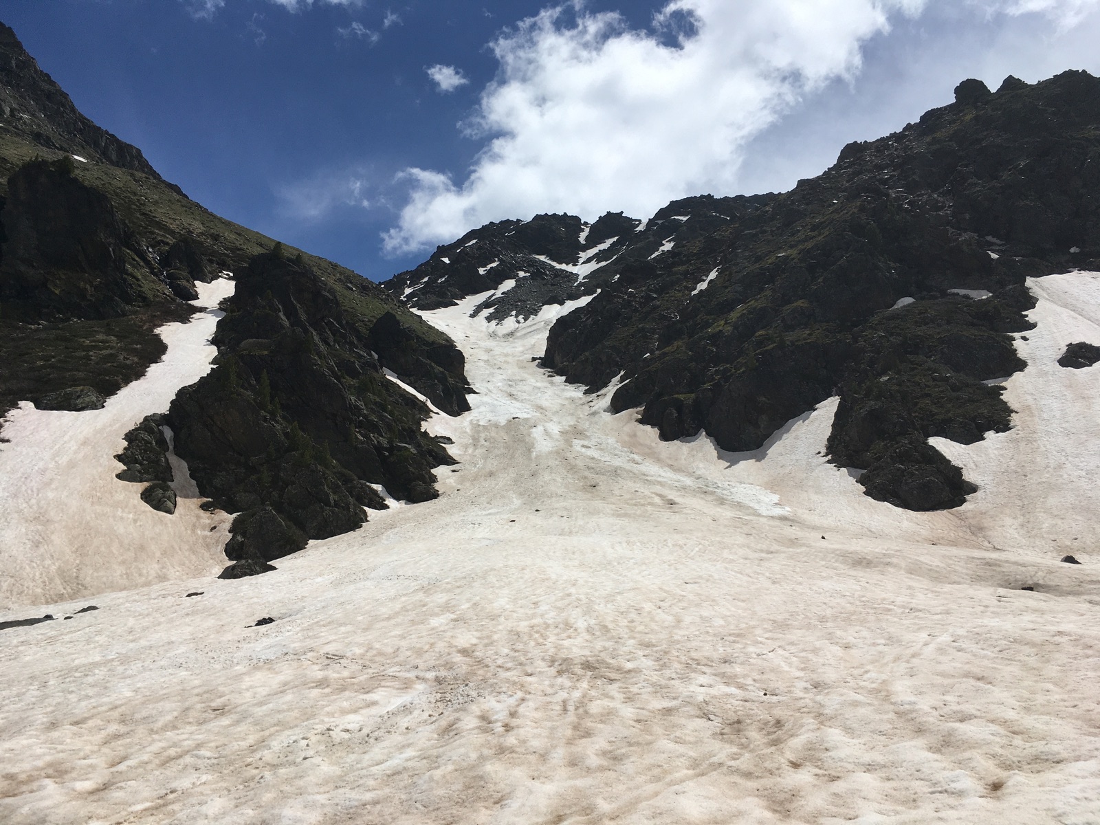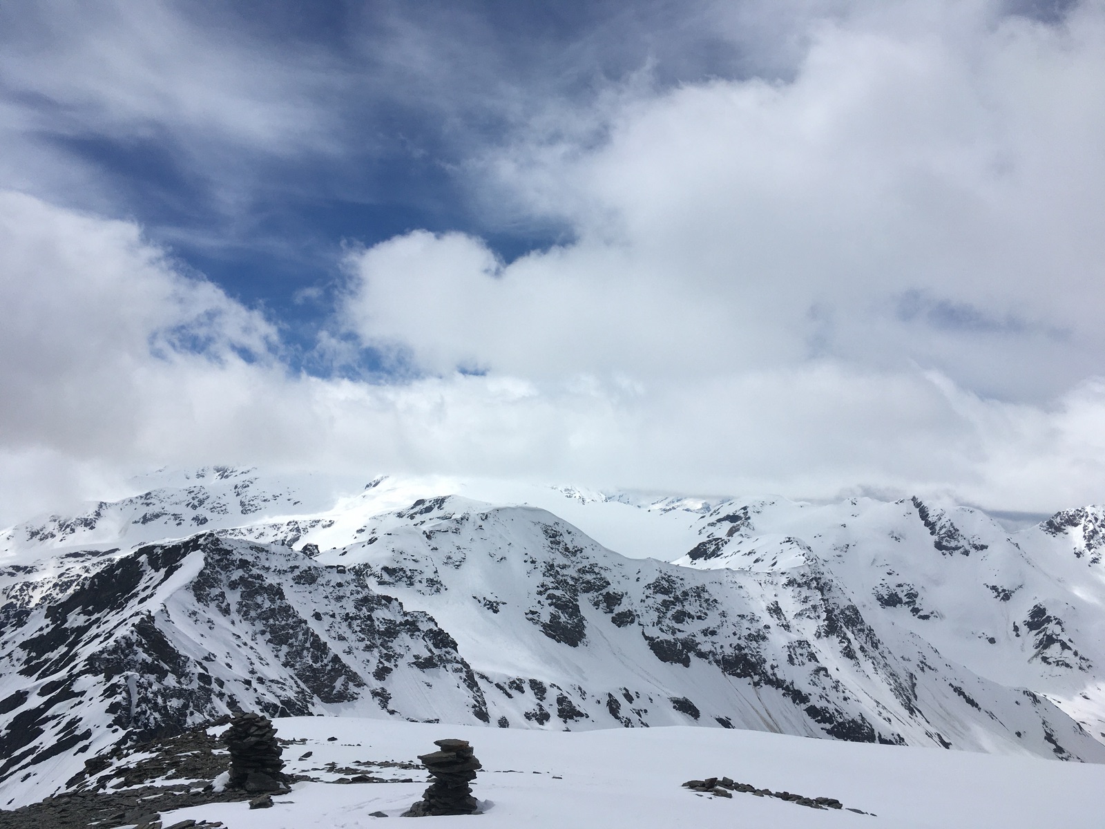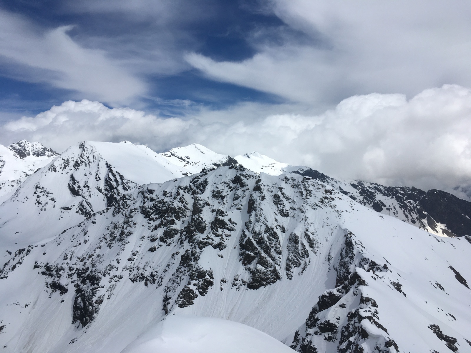 Abfahrt direkt vom Gipfel entlang des Kamms / in der Nordflanke zur Bergstation der Schöntauf II-Sesselbahn und bis zur Madritschhütte - fahrbarer tiefer Schnee (der Neuschnee oben ist noch nicht umgewandelt - dürfte in den kommenden Tagen besser werden). Kurz hinter der Madritschhütte ging es dann durch den Bachtobel direkt hinab (das ist wohl die sogenannte Kanonenrohr-Abfahrt, Skiroute Nr. 5). Hinter sehr schöner Sommerschnee. Es ging bis etwas unter 2.300 m perfekt hinab. Ältere Skier allerdings zu empfehlen, da doch schon einige Steine herumliegen. Zuletzt über den Wanderweg ins Tal (sehr schön), allerdings fehlt kurz vor dem Parkplatz die Brücke. Das Durchwaten des Baches ist zur Zeit eine Herausforderung! Man kann aber auch einfach noch kurz zum Fahrweg absteigen und dort über die Brücke.