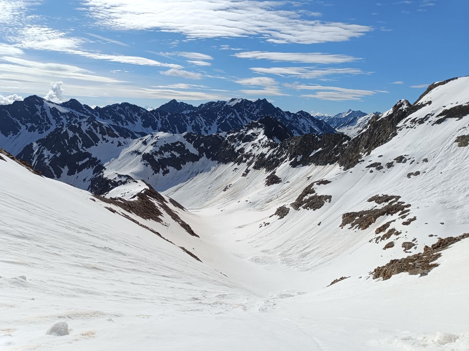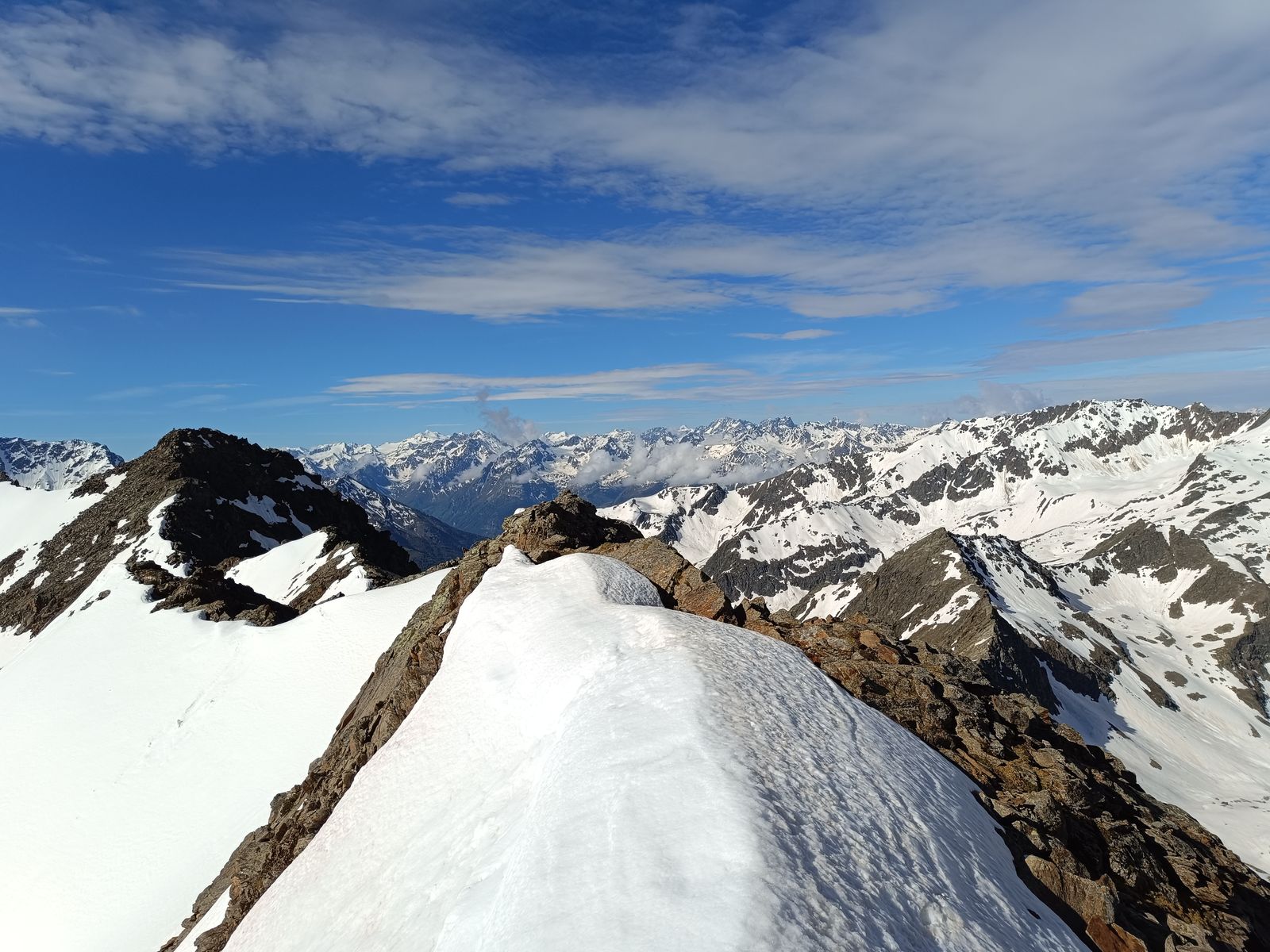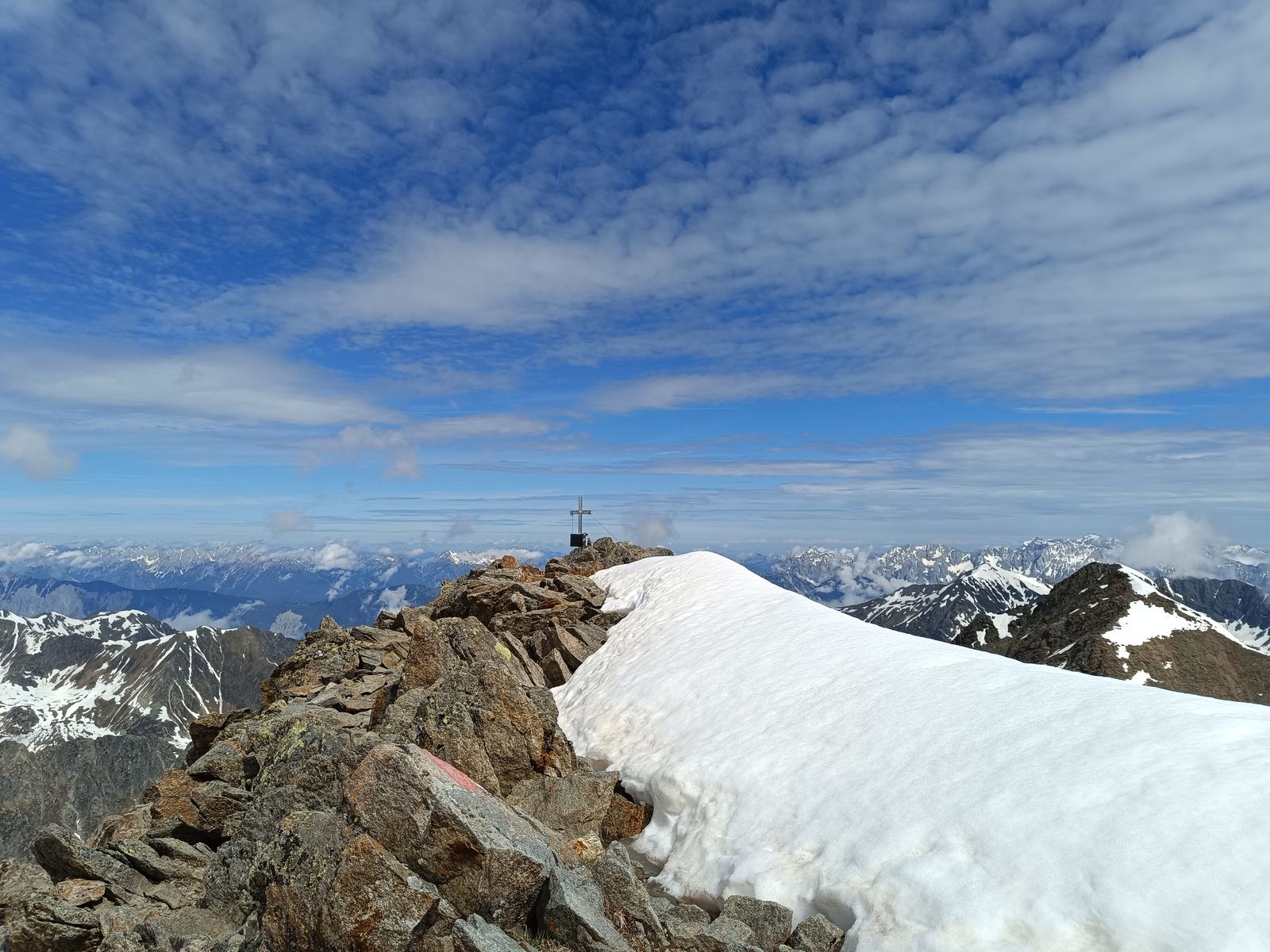 1) Der Blick vom Gipfel zeigte mir, dass heuer bei entsprechender Motivation noch lange Skitouren möglich sind, da die Schneelage oberhalb 2500 Metern einfach beeindruckend ist. Auch im Juli wird's da mancherorts noch gehen. Ich bin übrigens grundsätzlich kein Freund der "Saison-Abschluss-Skitour". Das schleicht sich bei mir dann eher so aus, aber ich setze nie den Punkt "So, itz is es guat". Der Berg und die Verhältnisse sind entscheidend.