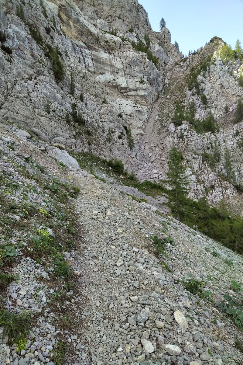 Etwas bröslige Rinne auf dem Weg zur Liftstütze der Tiroler Gondel. Es sieht von der Ferne aber wilder aus als es ist, und der Steig führt nicht die ganze Rinne hoch (sondern zweigt rechts ab):