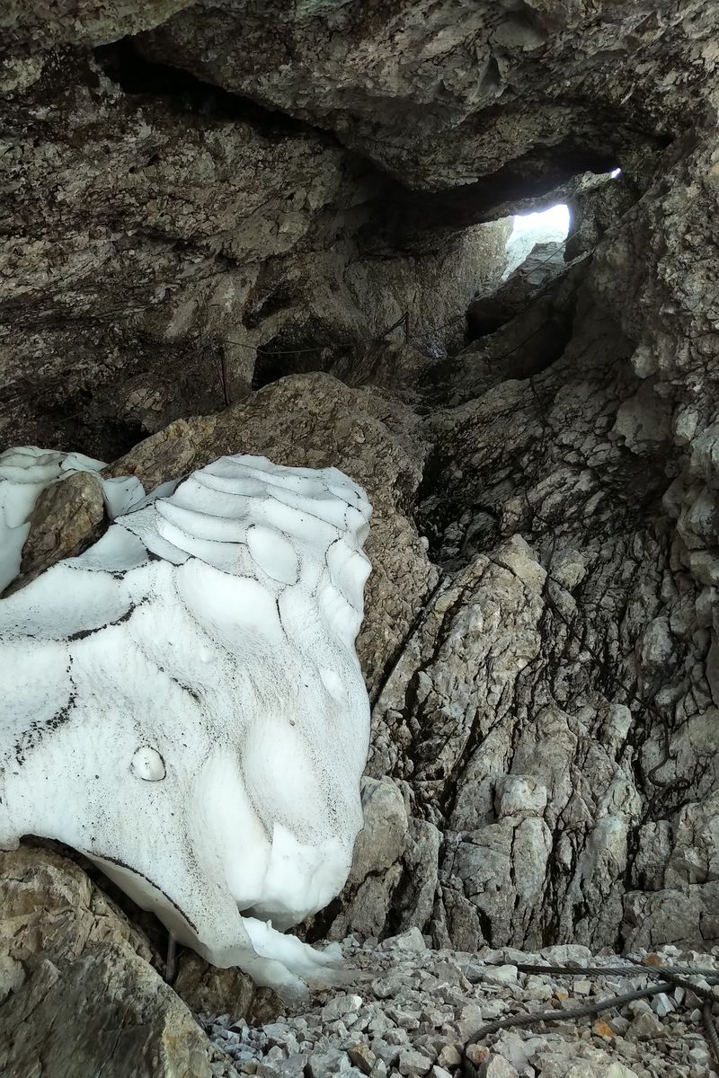 Auf der Aufstiegsroute von der Knorrhütte muss man einen Schneekolk umgehen. Aktuell bleibt man am besten nah am Fels und umklettert den Kolk neben dem Schnee über eine kurze 1er-Kraxelstelle: