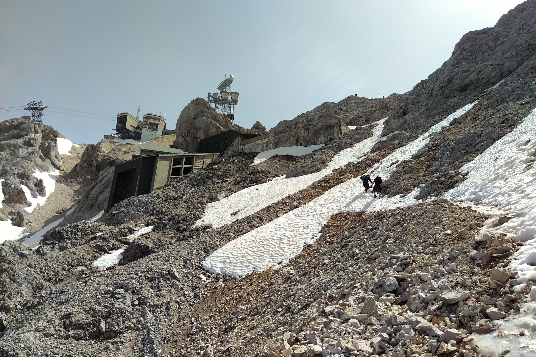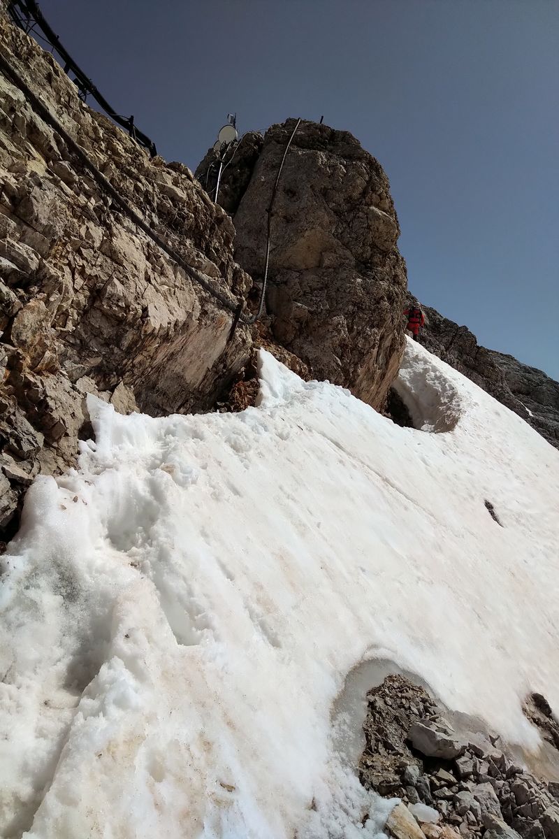 Es kamen später ein paar Leute im Abstieg entgegen, die vorher auf der Höllental-Route waren. Den Erzählungen nach sind dort die Drahtseile mittlerweile zu 95% frei. Ob die anderen 5% problematisch sind, kann ich schwer abschätzen, ohne selbst dort gewesen zu sein. Die Verhältnisse sind wahrscheinlich etwas besser geworden seit dem Warnhinweis. Trotzdem scheint die Höllental-Route immernoch anspruchsvoller zu sein, als sonst um diese Jahreszeit.