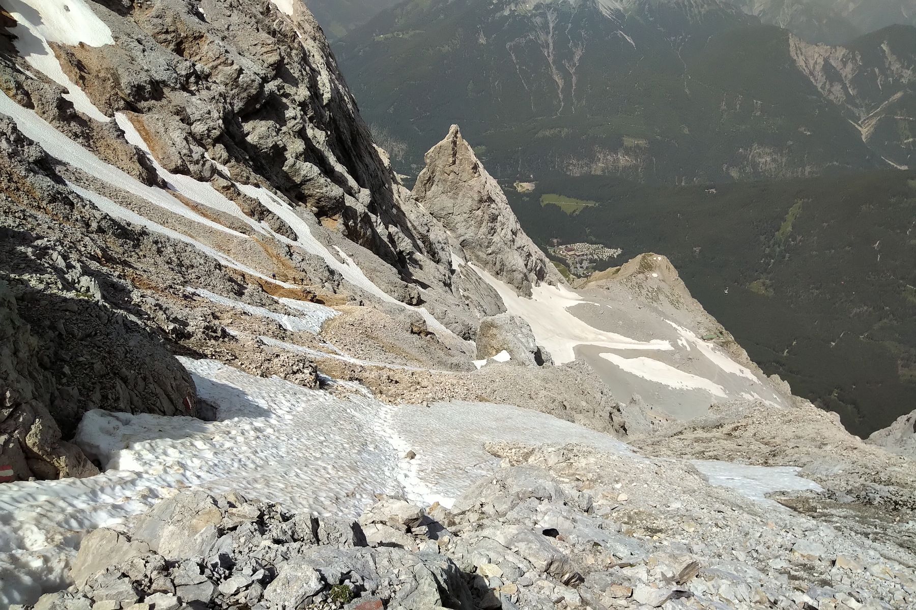 Blick zurück von der Beton-Plattform kurz unterhalb vom Grat. Unten die Talstation von der Tiroler Zugspitzbahn, rechts davon unter dem Vorgipfel die gemütliche Wiener Neustädter Hütte: