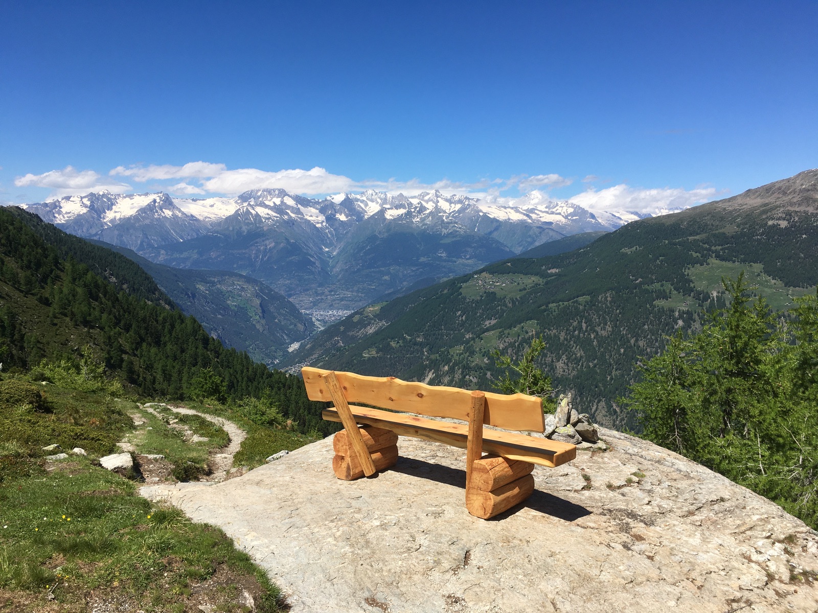 Schönes Rastbankerl auf dem Höhenweg Saas-Fee - Grächen mit Blick zum markanten Bietschhorn: