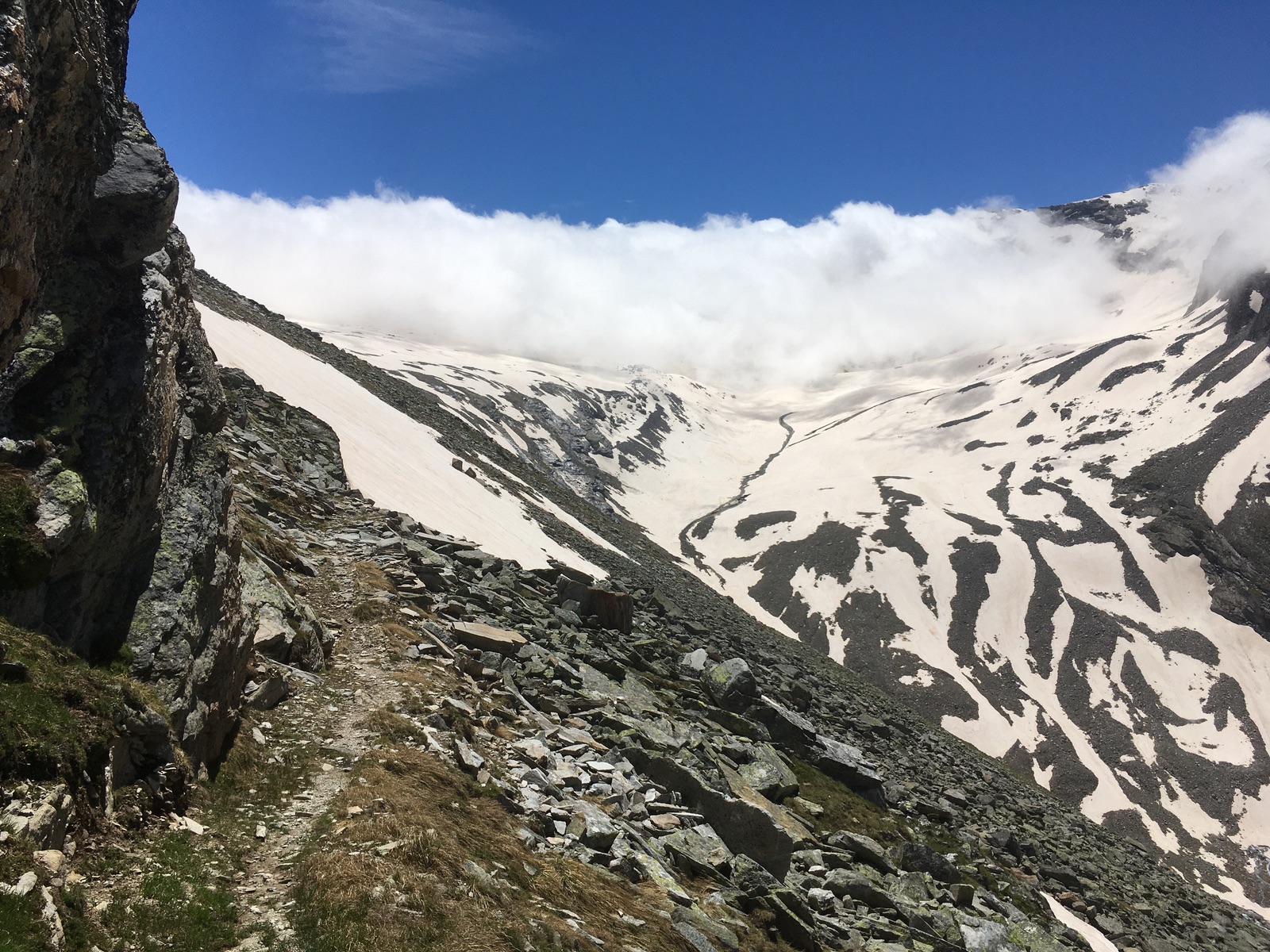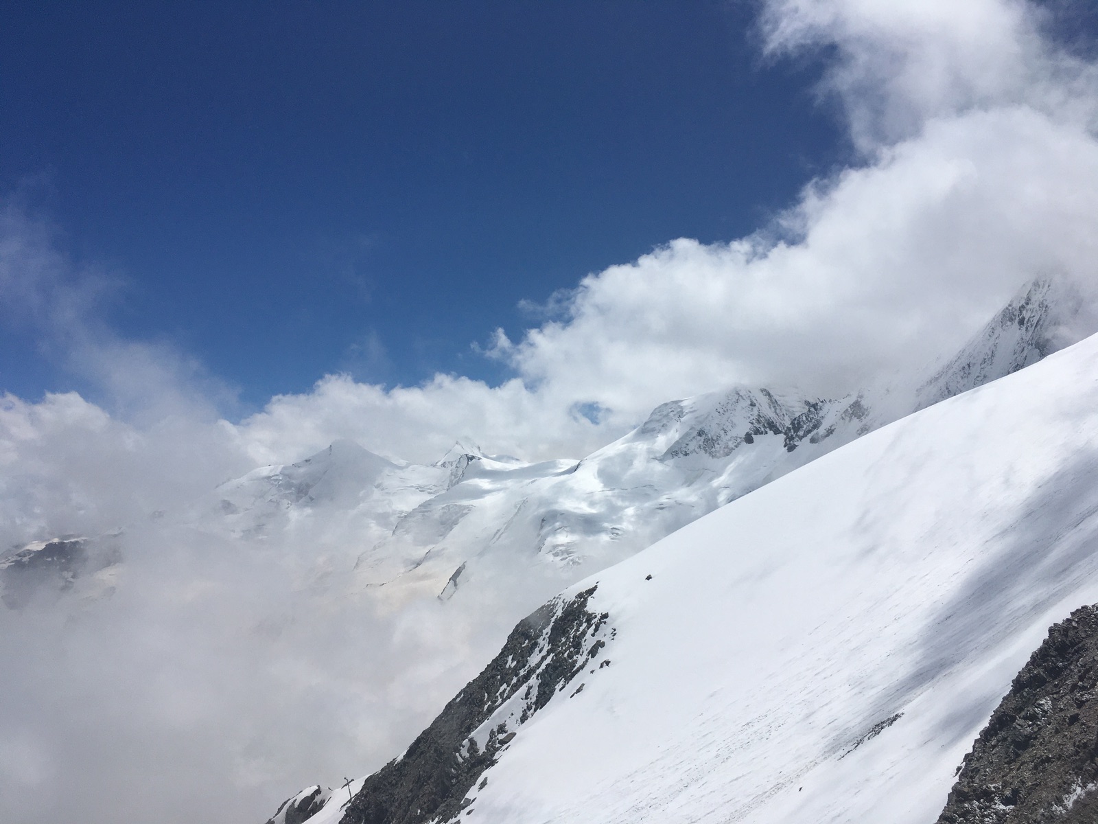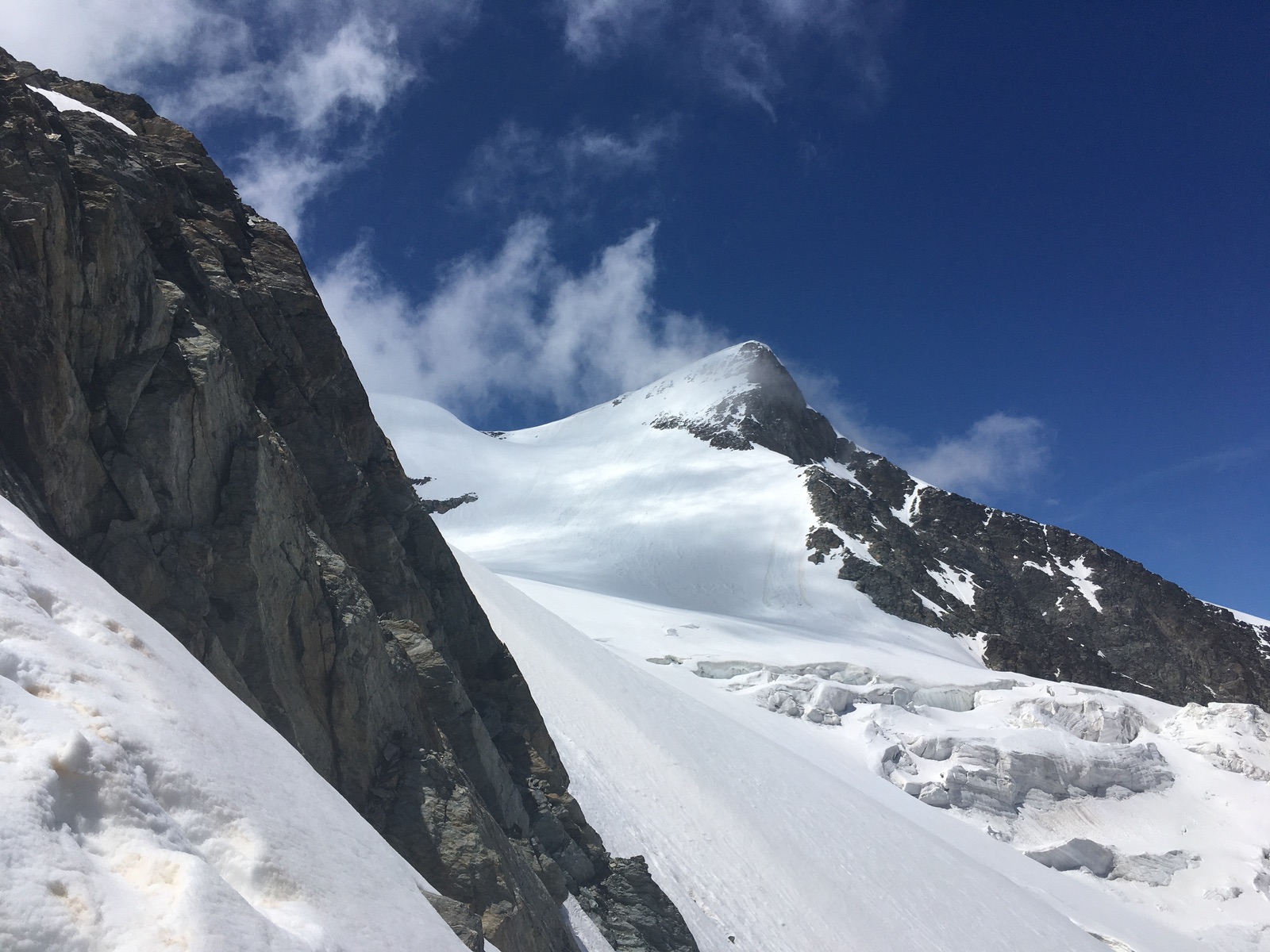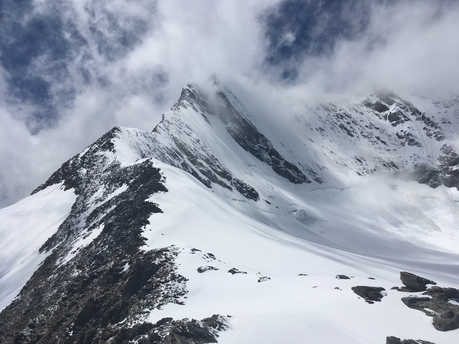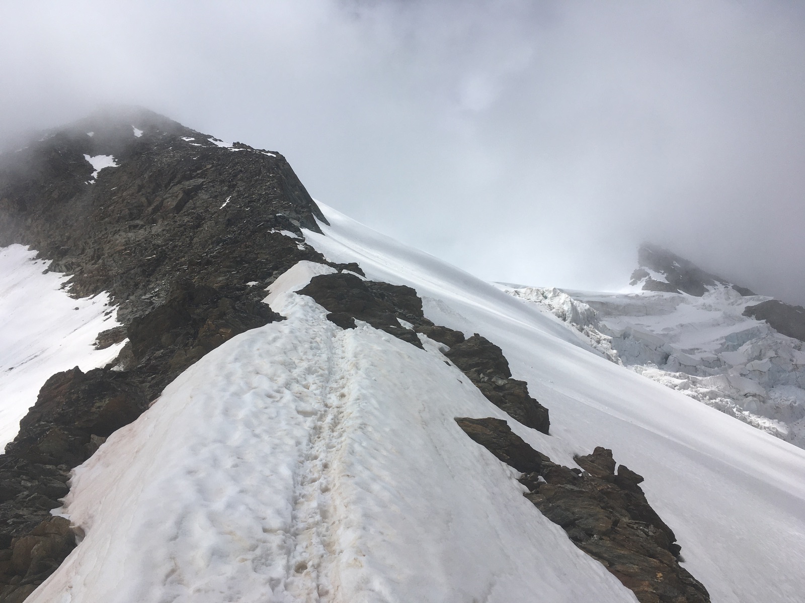 Heute ging es bei anfangs ziemlich wenig einladendem Wetter von der Bergstation Hannig zur Mischabelhütte und noch etwas weiter auf das Schwarzhorn (P. 3.618 m). Beim Torrenbach ist die Brücke weg. Es geht zur Zeit aber noch etwas oberhalb über ein Schneefeld. Alternativ der offiziellen Umleitung über die untere Brücke folgen (einige Minuten und Höhenmeter Verlust). Beim weiteren Anstieg unter den Distelhörnern liegen noch Schneefelder - hier genau auf die Spur achten, ich bin im Nebel einigen älteren Spuren folgend zu weit nach links gekommen (mehreren Spuren nach war ich da nicht der einzige mit einem Verhauer; ist aber nicht ganz angenehmes Gelände). Der Weiterweg ist dann eine Zeit lang unangenehm erdig. Ab Erreichen des "Klettersteigs" wieder gut. Von der Hütte zum Schwarzhorn ging heute auch gut. Gletscher Richtung Windjoch scheint gut eingeschneit zu sein. Der direkte Grat zur Lenzspitze sah recht "schneeig" aus.