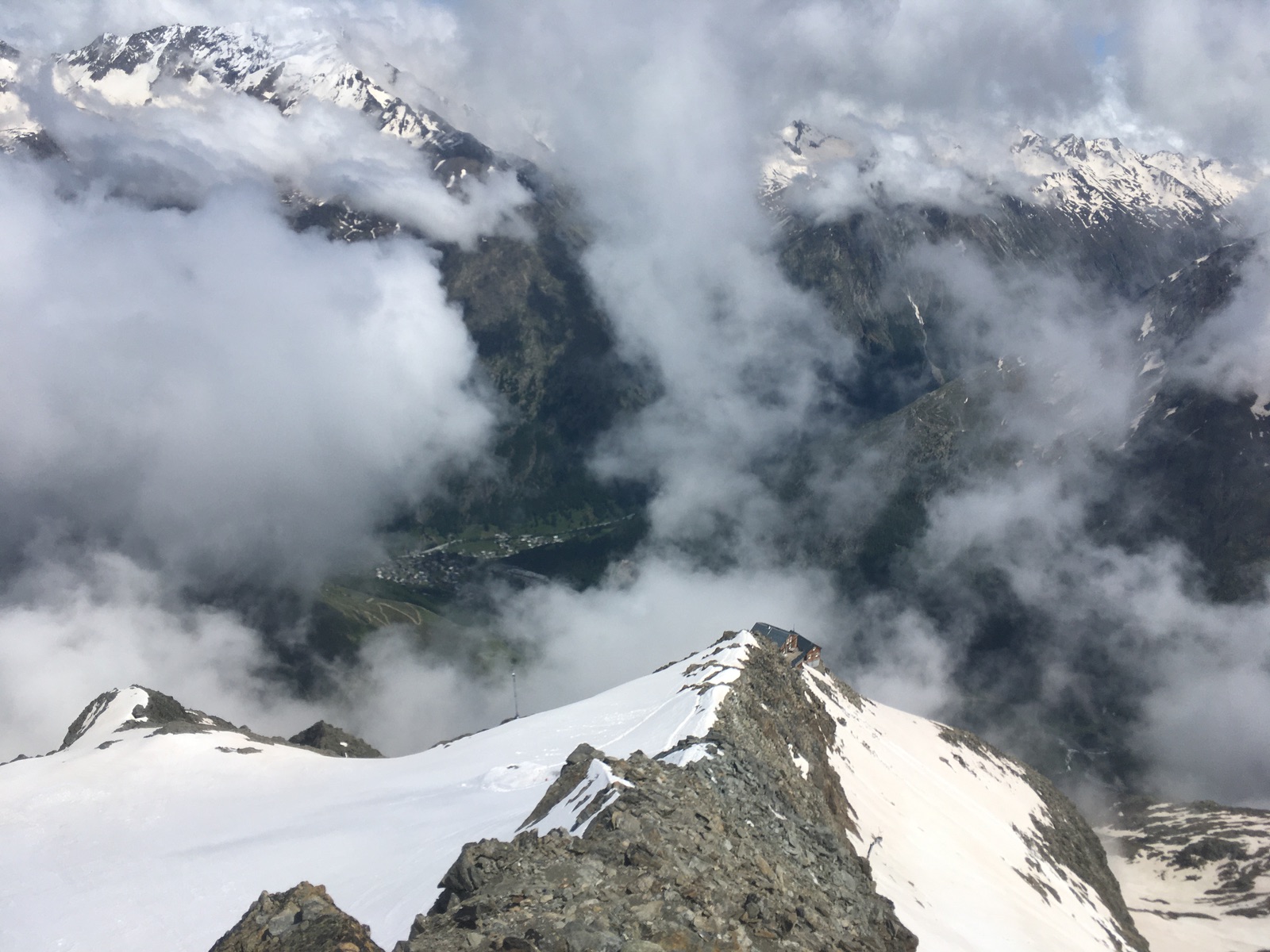 Tiefblick über die Mischabelhütte nach Saas-Fee (überwiegend im Nebel, links davon Saas-Grund):
