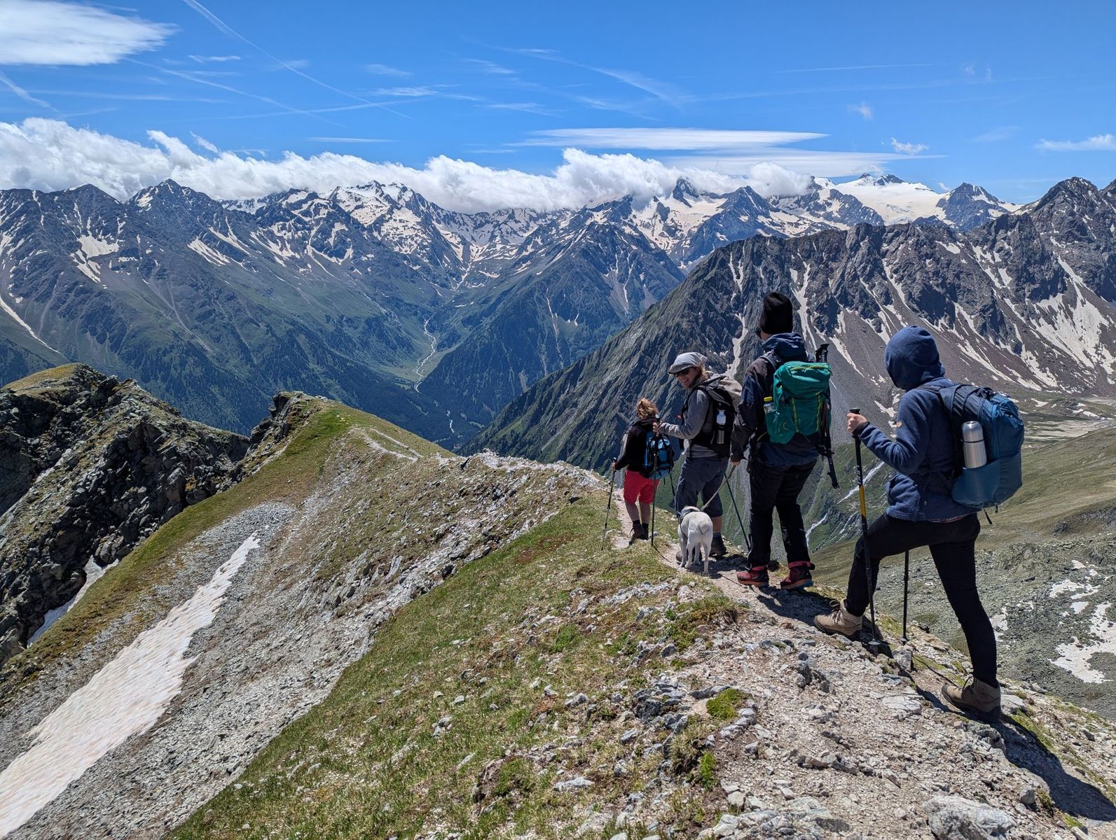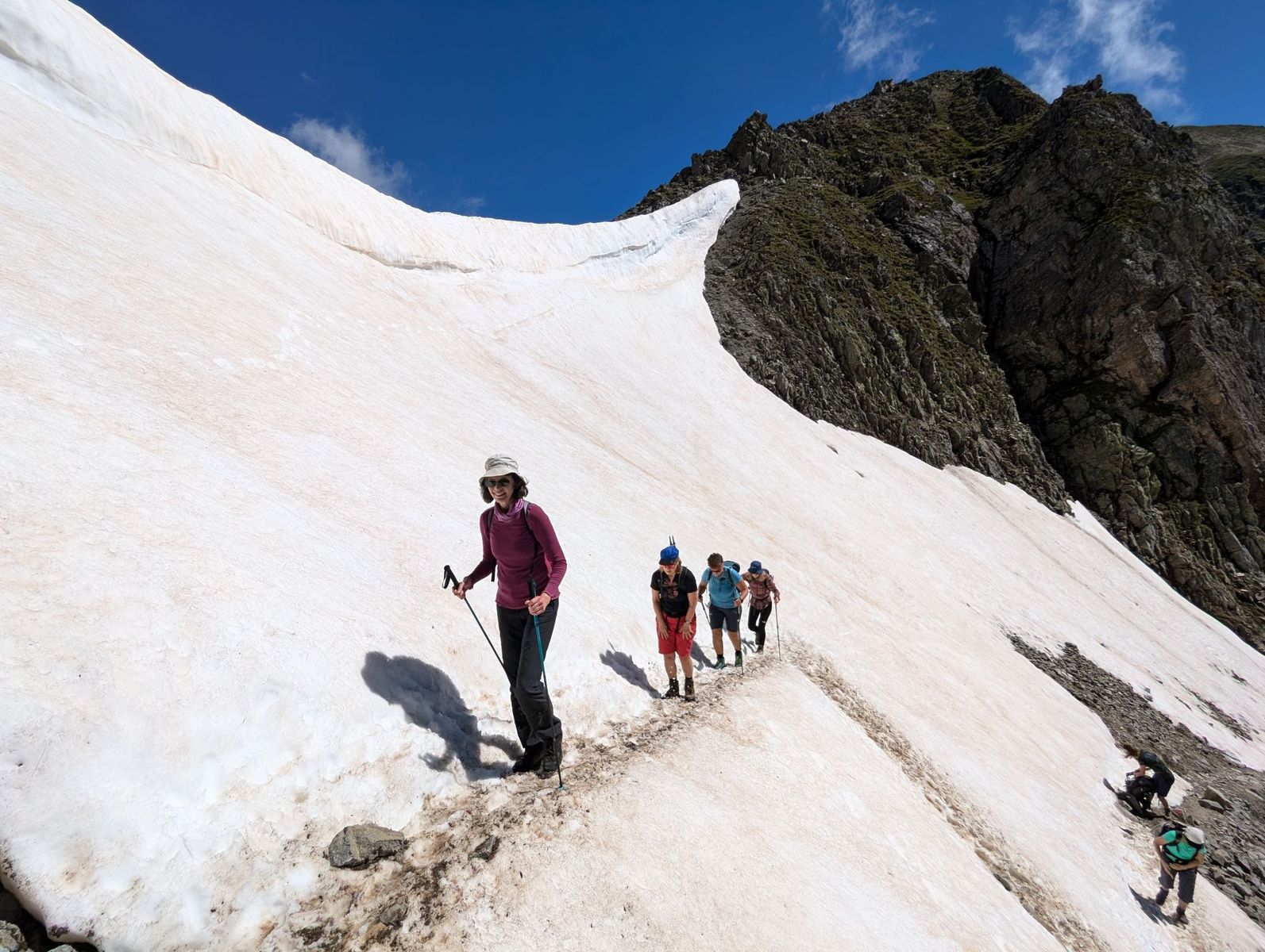 Auf dem Anstieg zum Schrimmennieder Sattel ist ein unproblematisches Altschneefeld zu queren, Die große Wechte am Sattel kann links (also dort war ohnehin die Stahlseile sind) schneefrei umgangen werden. Im weiteren verlauf sind zwei unproblematische Schneefelder zu queren. Ansonsten war alles trocken und schneefrei.