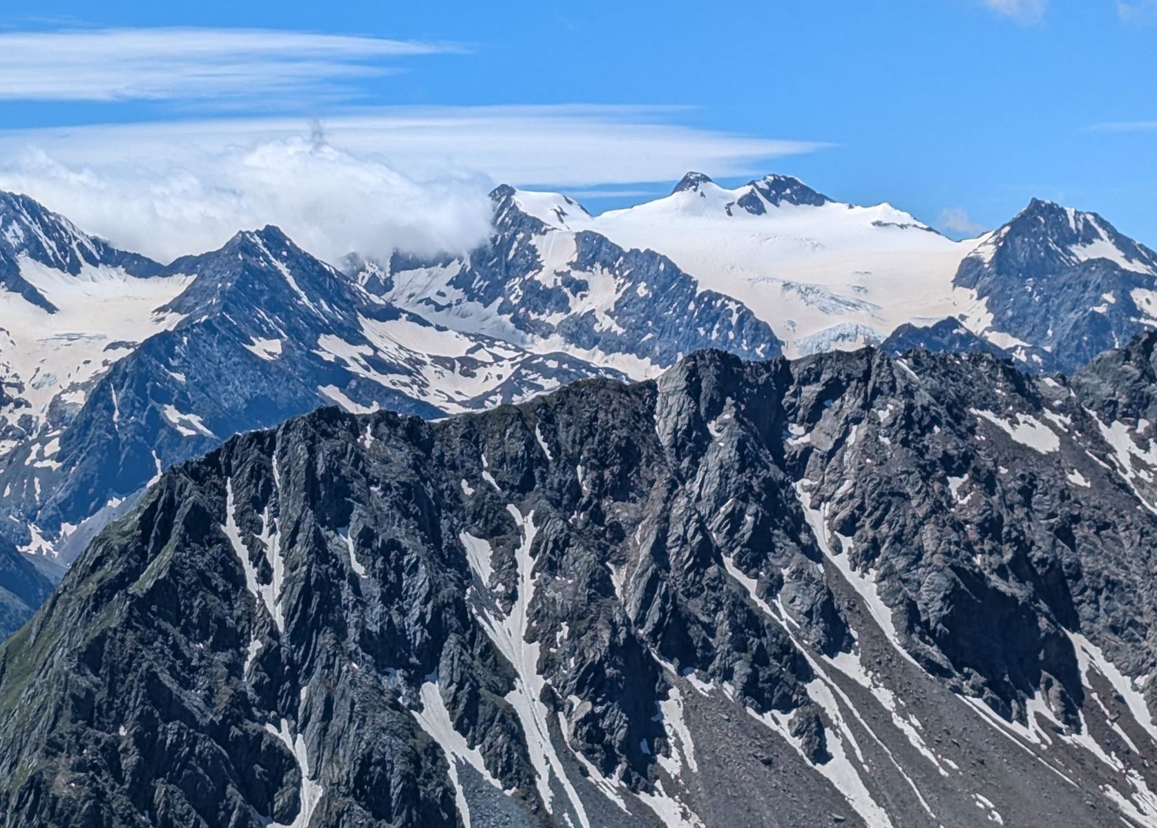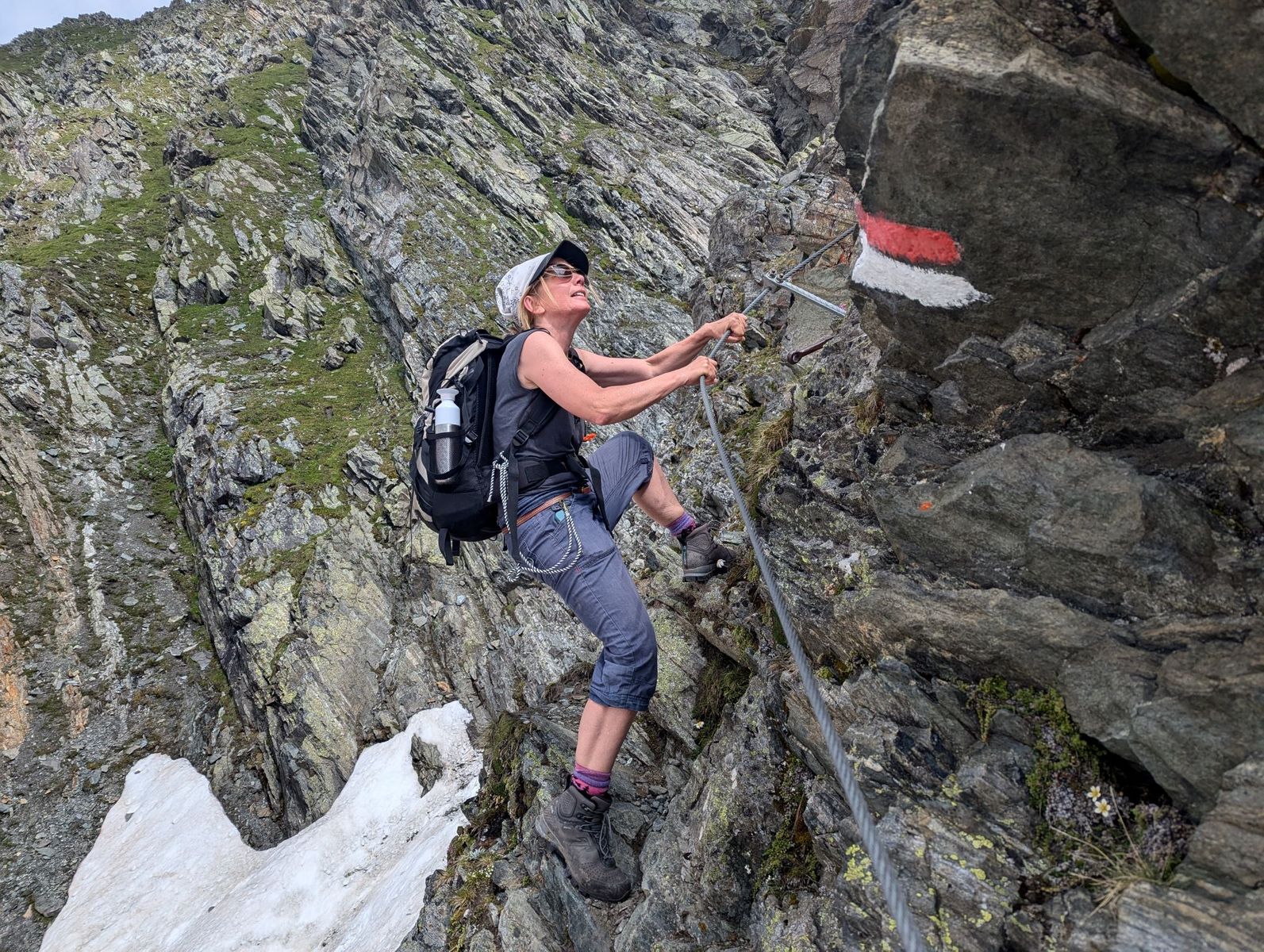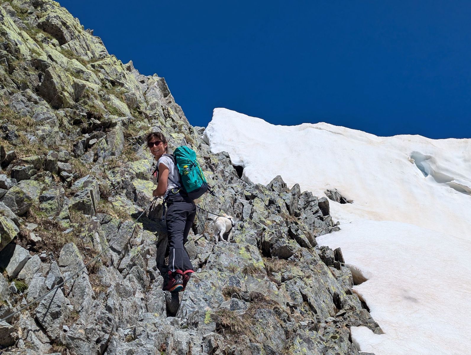 Vor dem Beginn des steilen Gipfelaufbaus muss man zwei große Altschneefelder queren, die aber gut zu begehen waren. Am steileren Geröllhang vor den ersten Versicherungen ist der Weg vom Altschneeteils verdeckt. Hier muss man mühsam im Geröll ansteigen. Ansonsten war alles trocken und schneefrei.