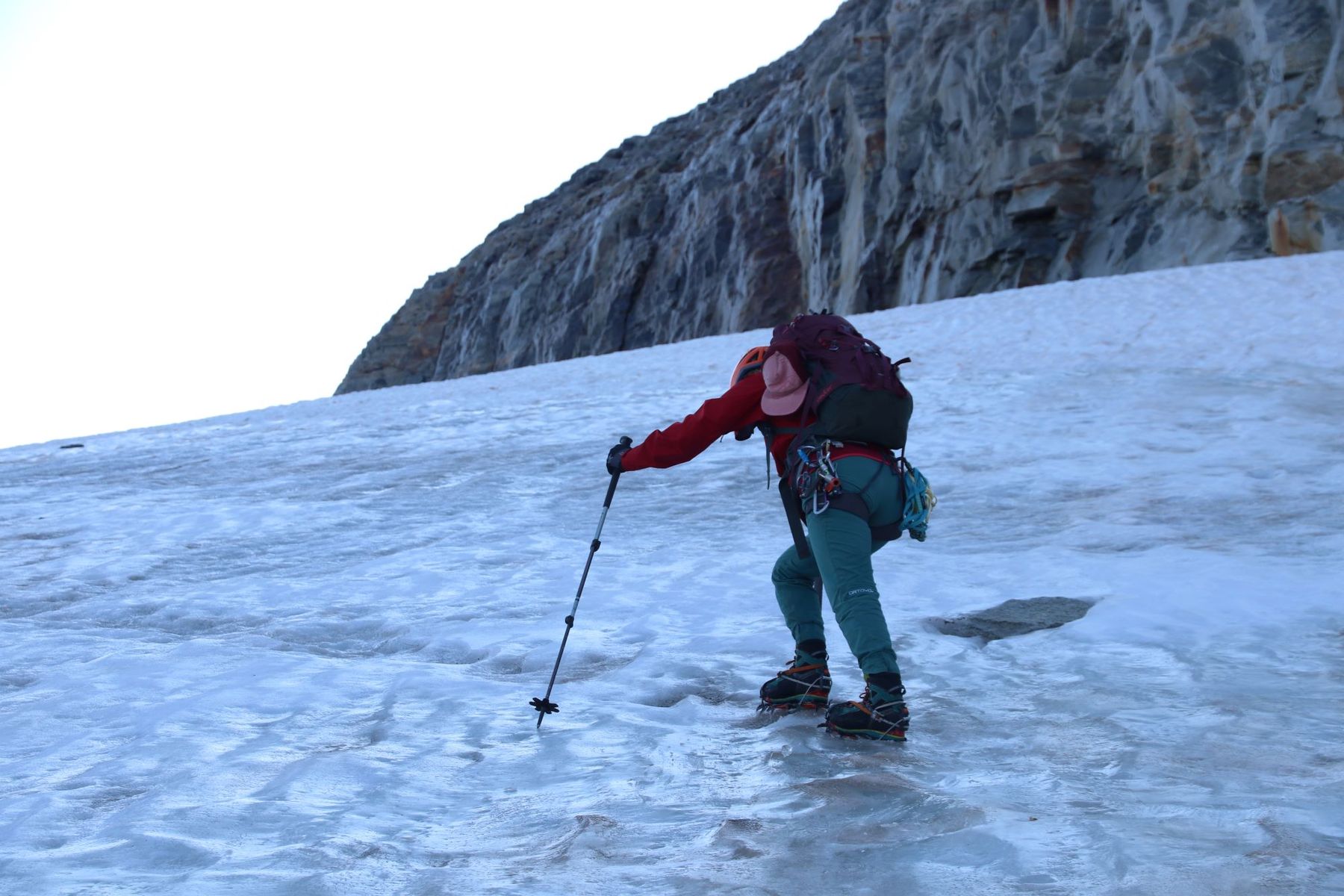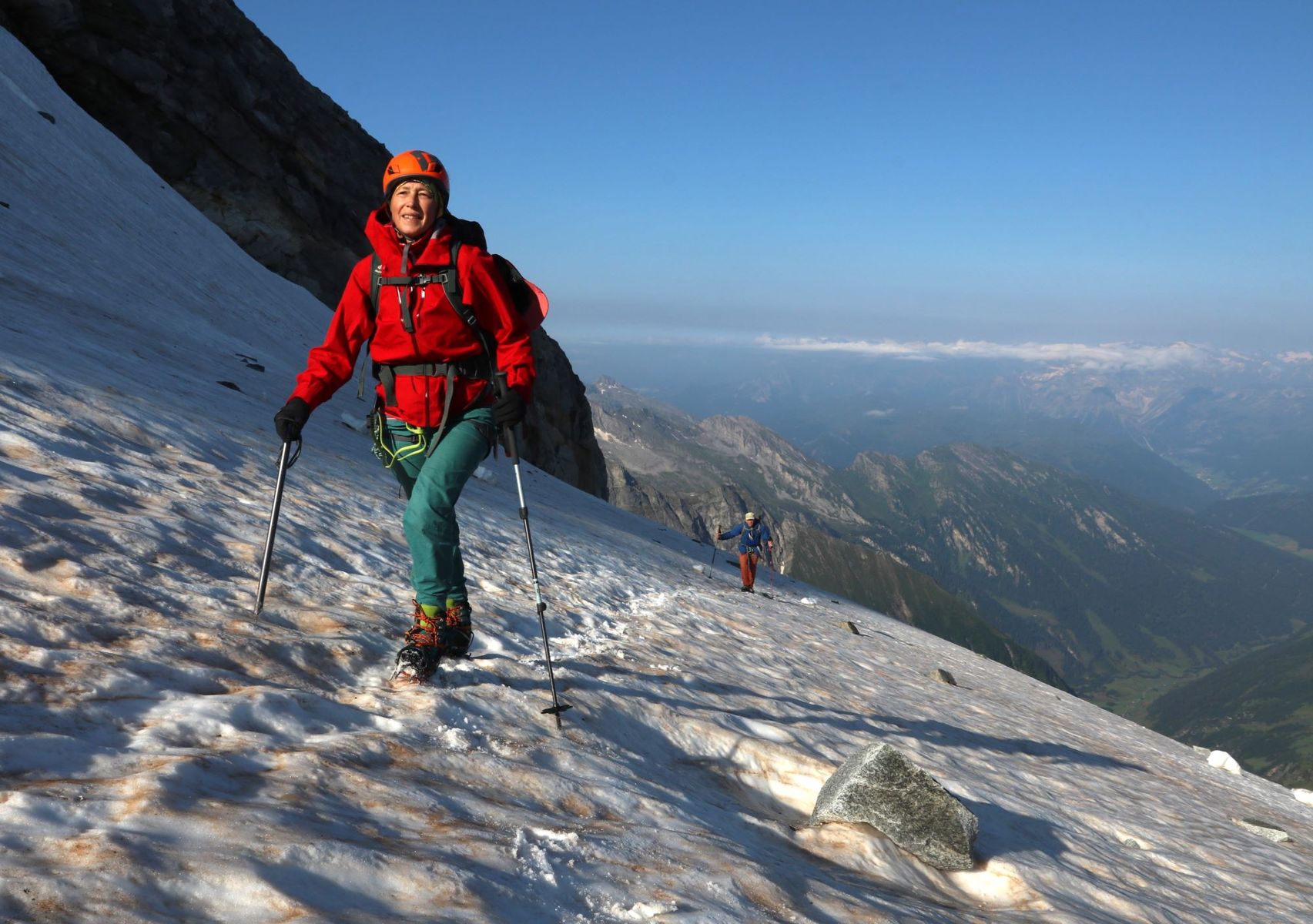 Aber erst ging es von der Geraer Hütte natürlich auf den Olperer. Auf dem zunächst vollkommen einsamen Anstieg lag am Großteil des (restlichen) Olpererferners guter, fester Trittschnee. Nur oben, bei der Querung zur Wildlahnerscharte ist eine Blankeispassage zu queren. Der steilere, zum Grat führende Gletscherhang hat wieder guten Altschnee und nicht den geringsten Bergschrund.