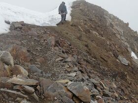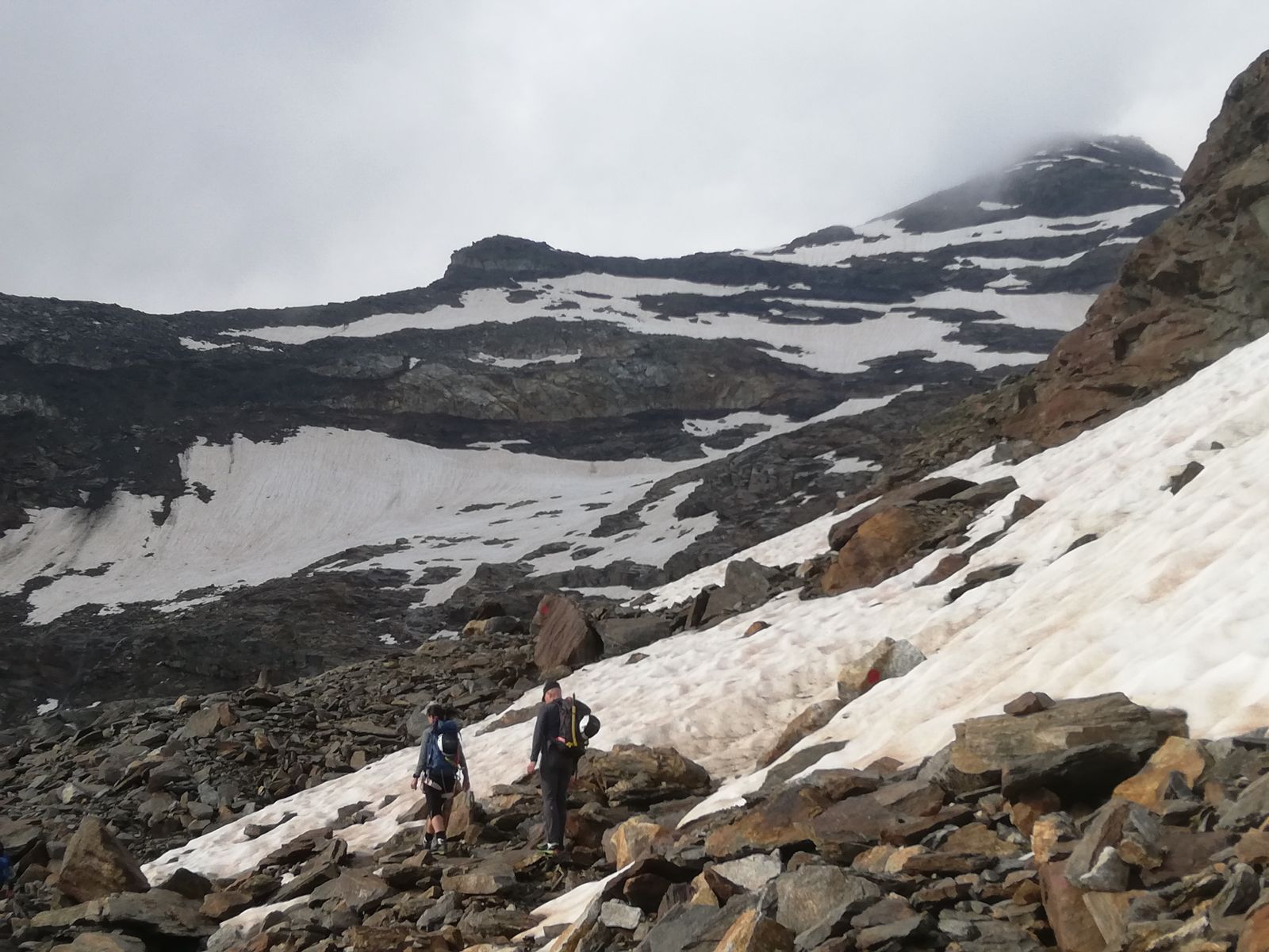 Abstieg vom Magerstein ziemlich gerade nach Norden hinab, zunächst über den noch komplett schneebedeckten Rieserferner, weiter unten über noch vorhandene, große Schneefelder so weit wie möglich hinab, Ab Schneeende faktisch weglos über Geröll weiter, bis man auf den Steig (Nr. 4) zwischen Kasseler Hütte und Antholzer Scharte trifft. Über diesen Steig zurück zur Hütte.