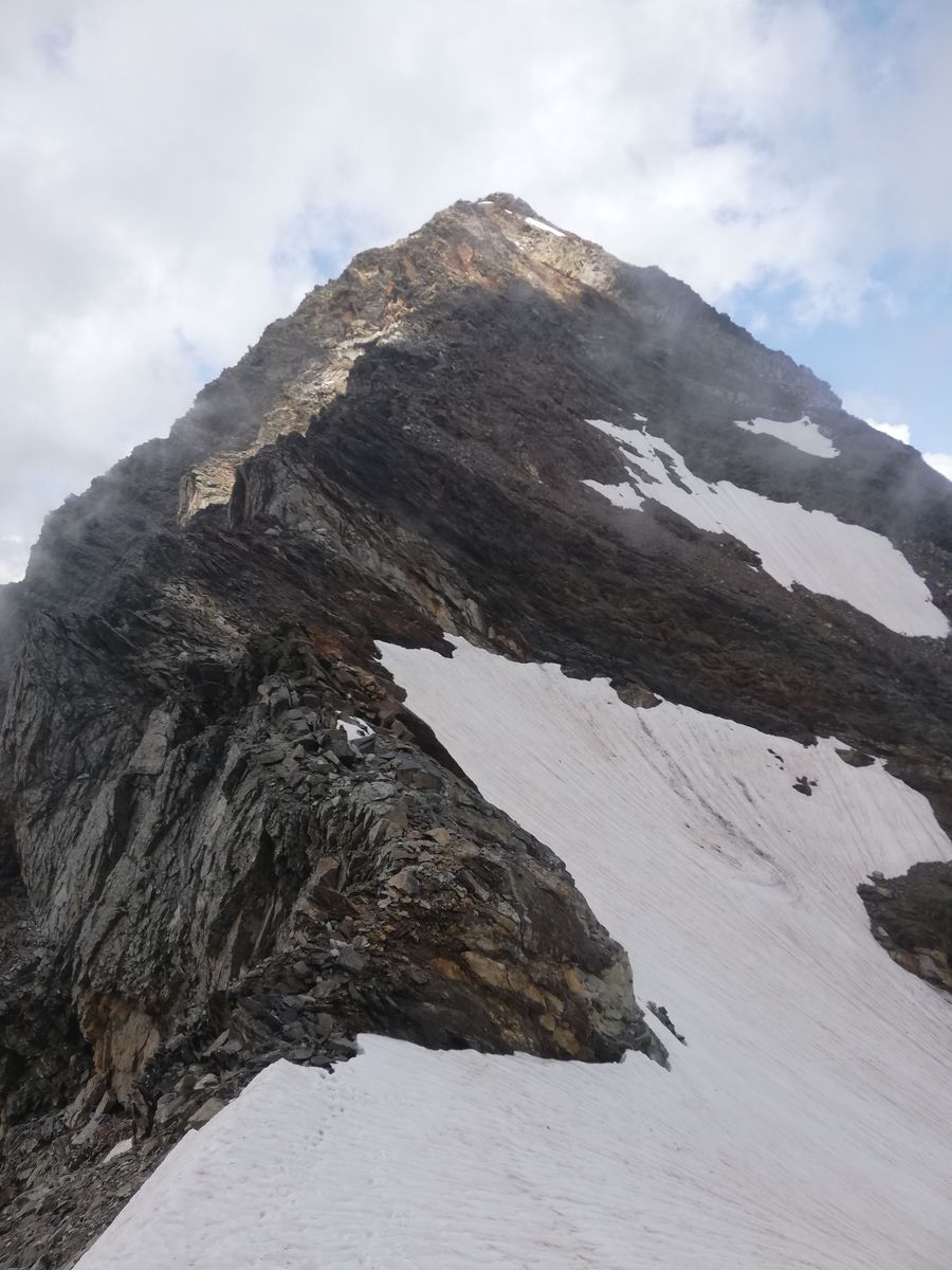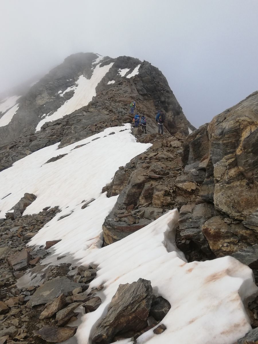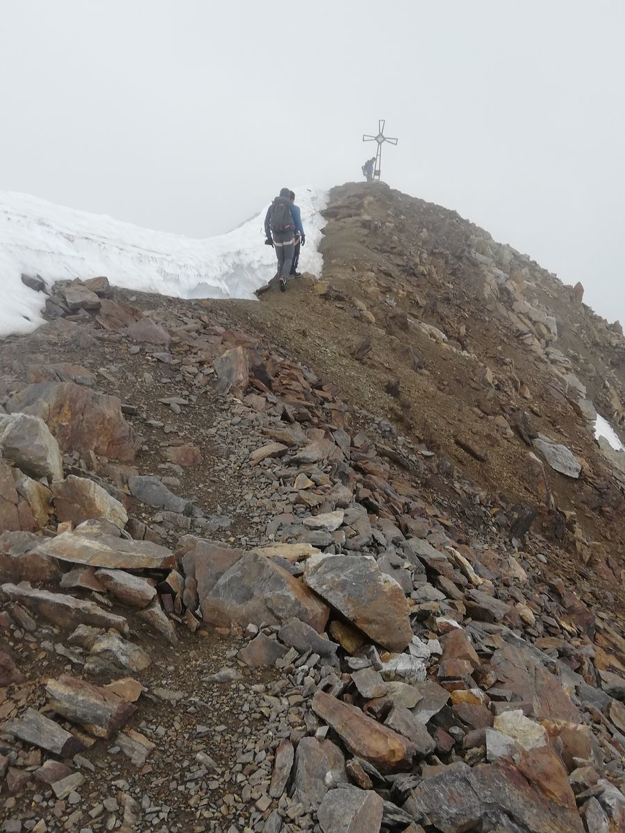 Von der Jausenstation "Säge" bei Rein in Taufers auf markiertem Weg zur Kasseler Hütte. Von der Hütte auf markiertem Weg Nr. 1 Richtung Malersee. Bei einer Weggabelung dann links Richtung Schneebiger Nock (Wegweiser, markiert). Nun auf dem Steig immer am rechten Rand des großen Kars, das vom Gipfelaufbau herabzieht, weit hoch, ab und zu kurzzeitig noch im Schnee. Später dann Querung - derzeit noch über ein großes Schneefeld - nach links zum dort parallel hochziehenden Nordgrat und über diesen weiter zum Gipfel. Viel plattiger Fels und Gletscherschliffe. Wir haben den Gipfel dann zum Magerstein hin überschritten. Dazu zunächst den Südgrat durch Schutt und erdiges Gelände wenig schön hinab, bis ein kurzer Klettersteig (durchgehende Kette) steil, kurzzeitig senkrecht, zum obersten Rand des Rieserferners hinab leitet. Weiter zunächst über Schnee, dann über den Blockgrat mit nochmaliger kurzer, senkrechter Klettersteigeinlage (durchgehende Kette auch hier), anschließend einfach zum Fernerköpfl und weiter über den Blockgrat über eine kleine Erhebung drüber und zuletzt über Schnee zum Magerstein.