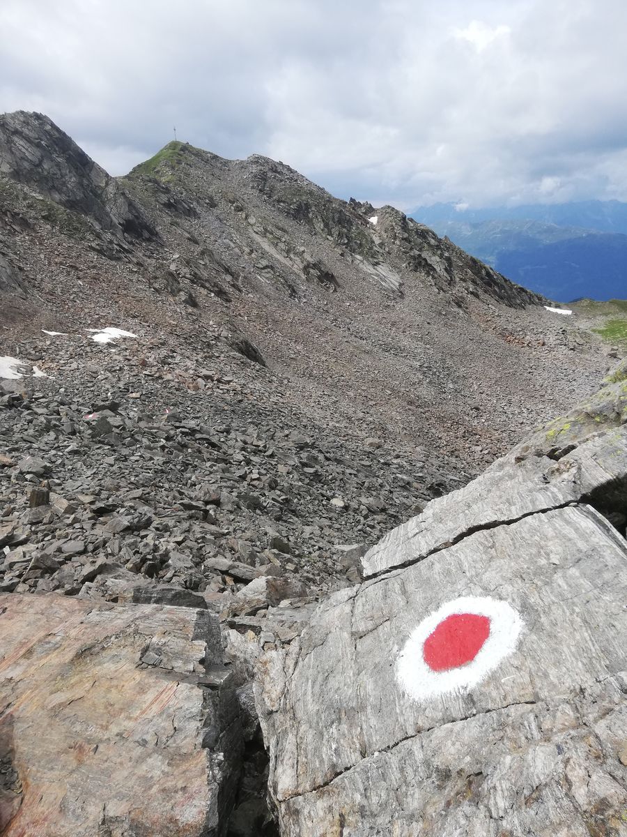 Von dort auf markiertem Weg zum Lehnerjoch und weiter unschwierig auf kleinem, markierten Steig zum Schafhimmel. Eine kurze Stelle, an welcher der Weg in der Ostseite des Grates führt, ist mit Stahlseil gesichert. Aber auch ohne Stahlseil allenfalls I.