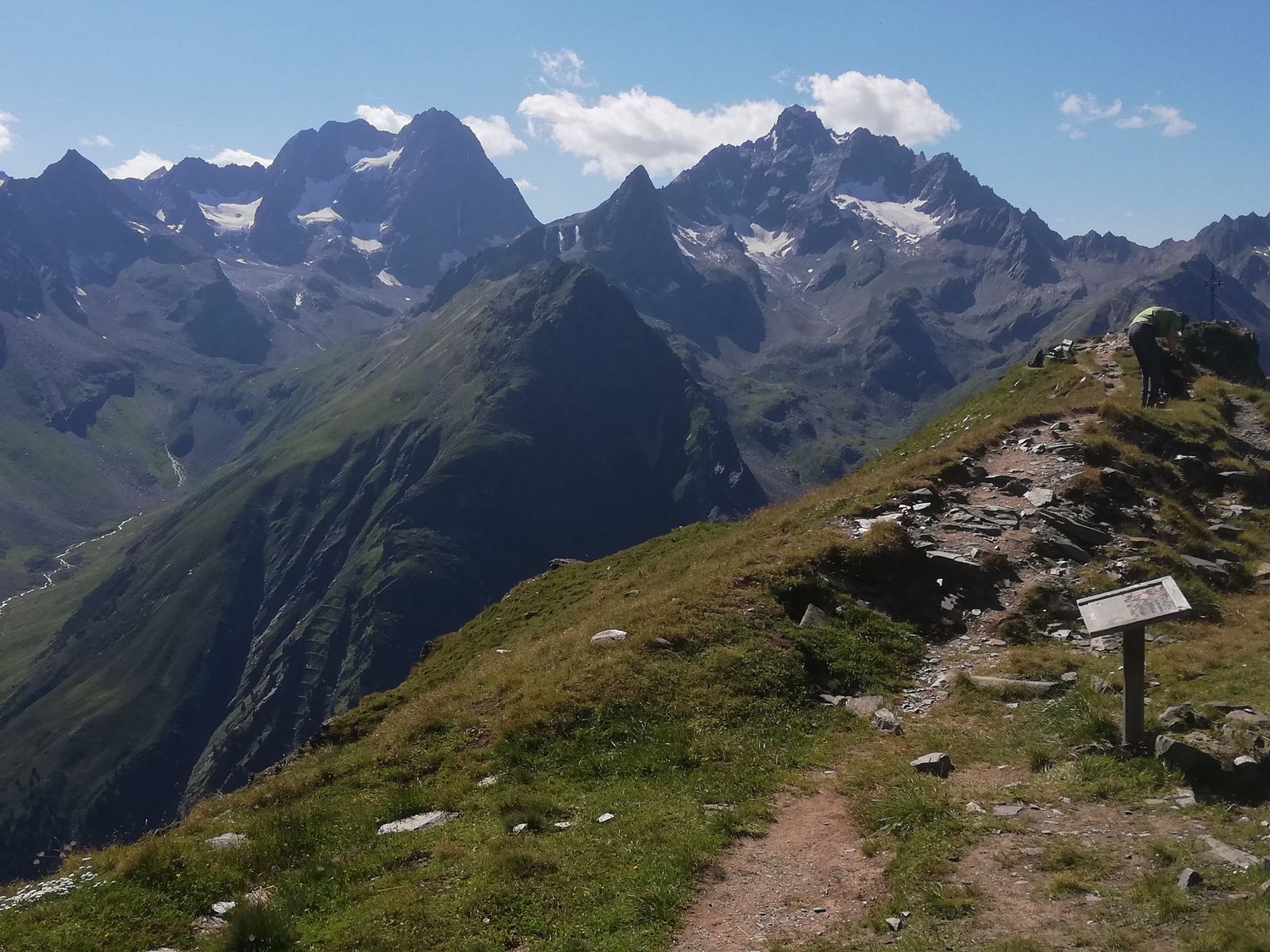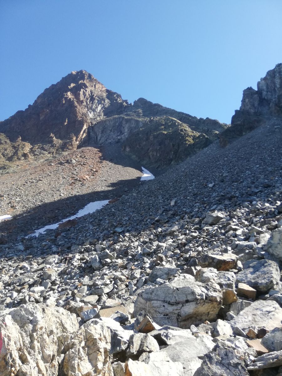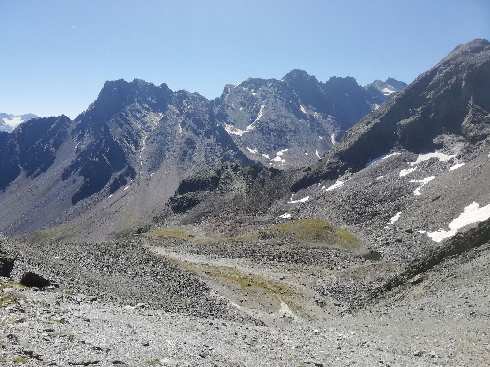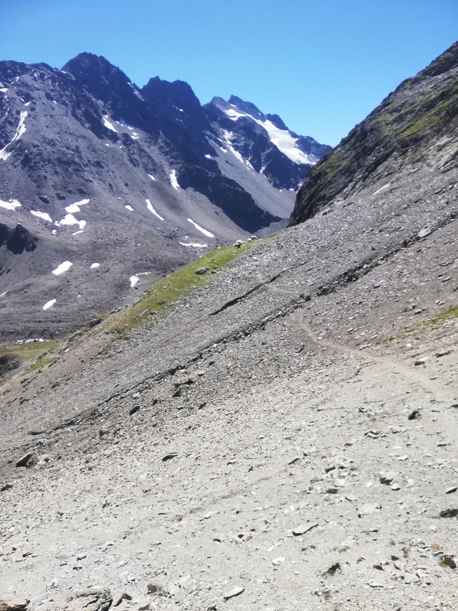 Auch auf dieser Etappe ist der Steig stets markiert und gut erkennbar, selbst bei dem grausligen Abstieg von der Luibisscharte. Keinerlei Schneekontakt. Auch für diese Etappe sind acht Stunden Gehzeit angegeben, wir waren mit Pausen und Gipfel über zehn Stunden unterwegs. Das mehrfache Auf und Ab in der prallen Nachmittagssonne forderte bei den herrschenden Temperaturen seinen Tribut (Möglichkeiten, (Gletscher)wasser nachzufüllen, gibt es).