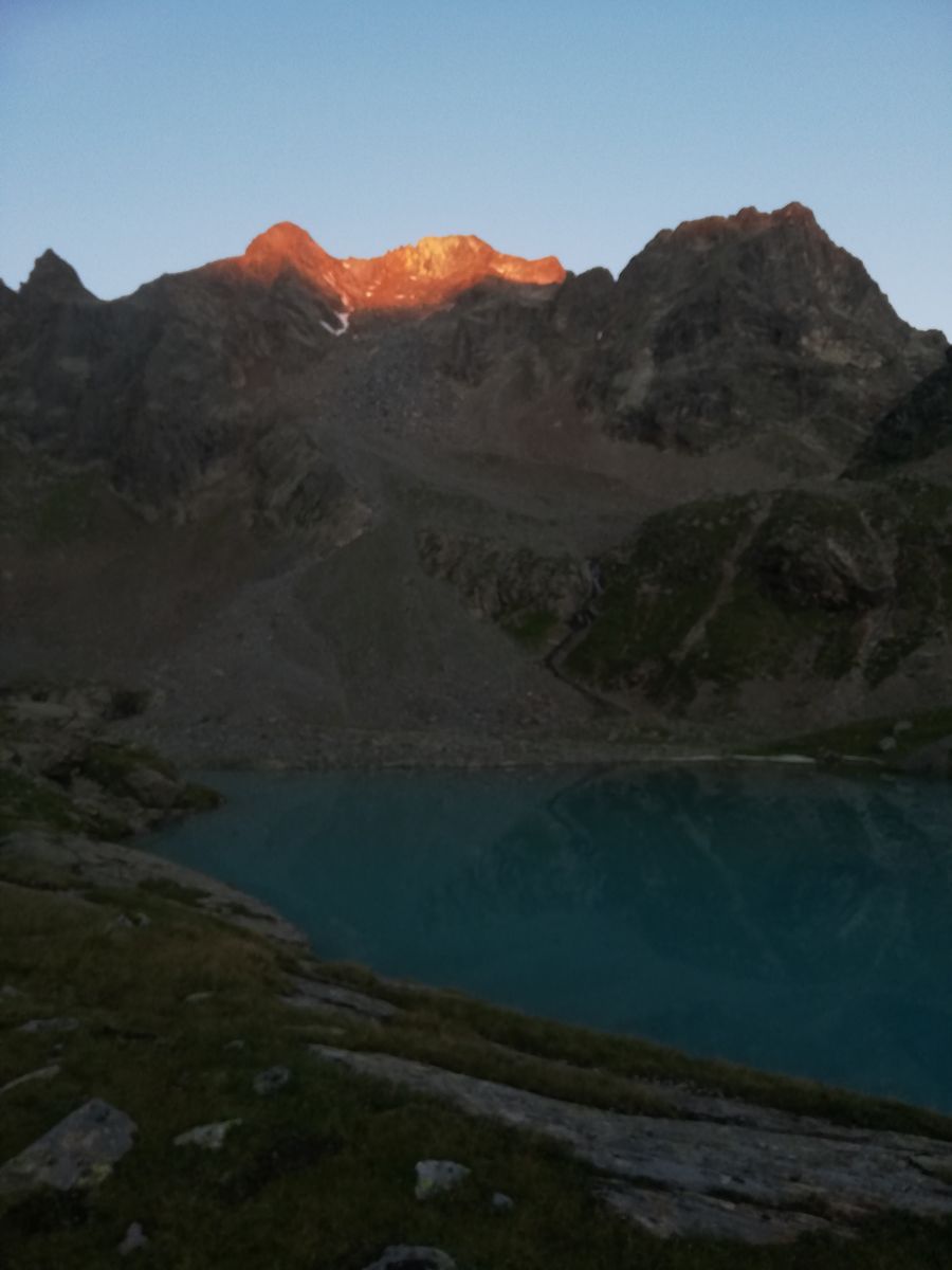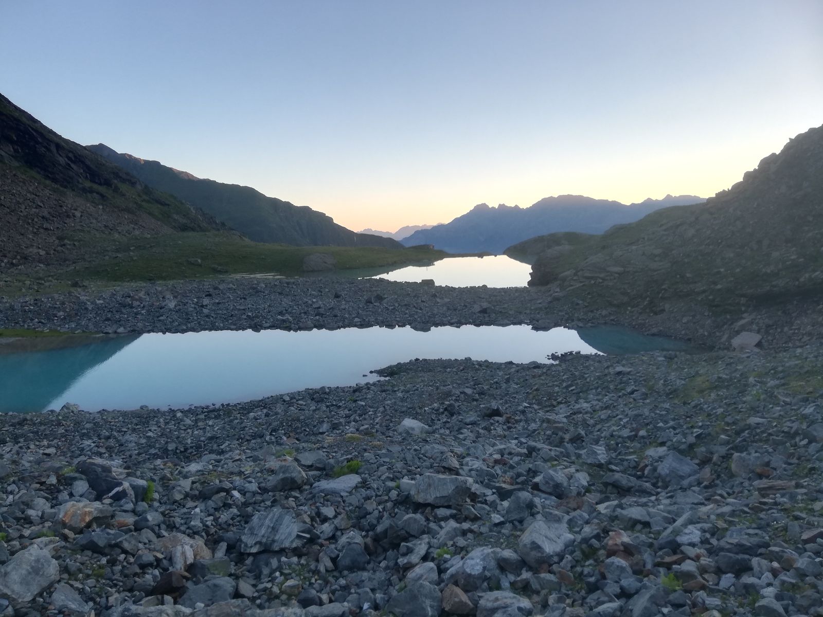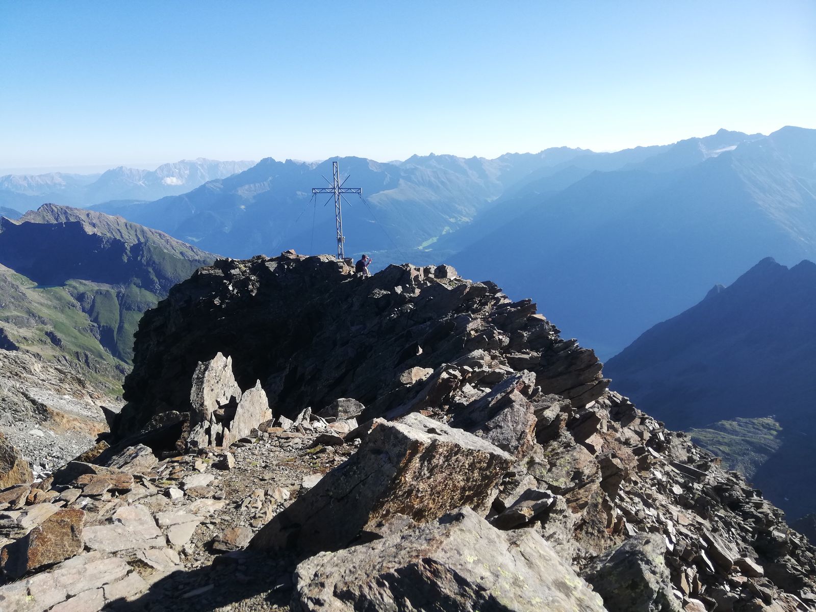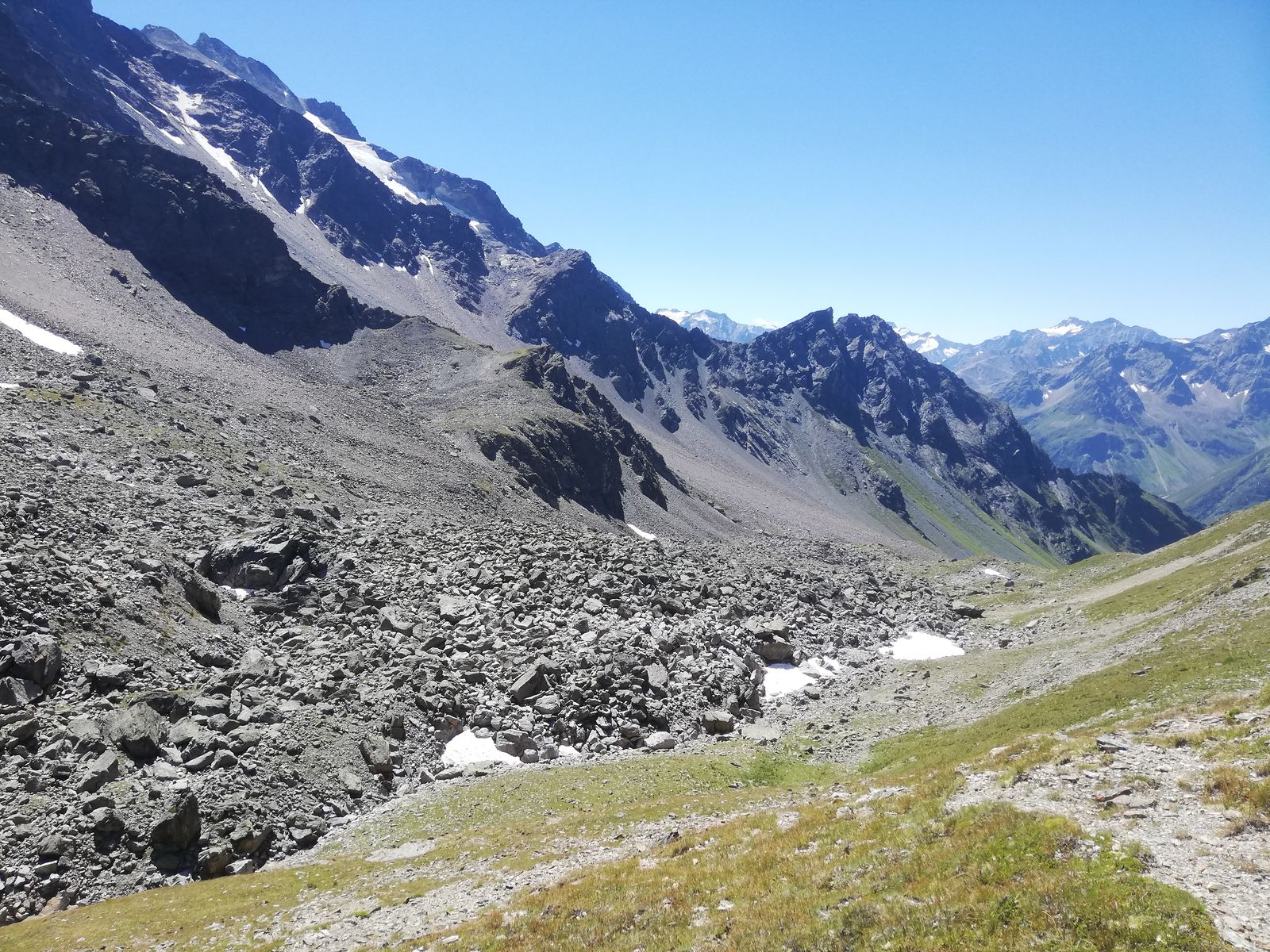 Auch auf dieser Etappe ist der Steig stets markiert und gut erkennbar, selbst bei dem grausligen Abstieg von der Luibisscharte. Keinerlei Schneekontakt. Auch für diese Etappe sind acht Stunden Gehzeit angegeben, wir waren mit Pausen und Gipfel über zehn Stunden unterwegs. Das mehrfache Auf und Ab in der prallen Nachmittagssonne forderte bei den herrschenden Temperaturen seinen Tribut (Möglichkeiten, (Gletscher)wasser nachzufüllen, gibt es).