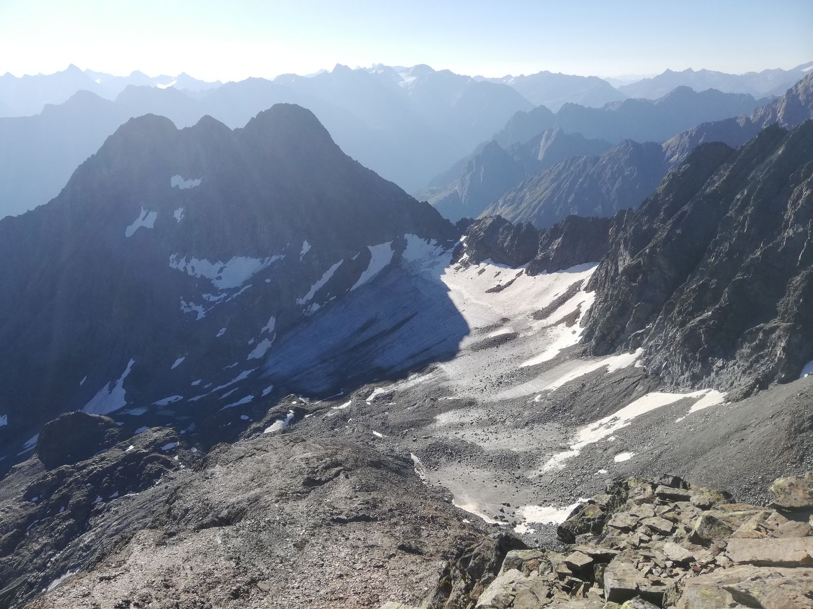 Bild 7: Blick vom ersten (= Sand) Joch auf den Weiterweg, ganz hinten die Hohe Geige, deren Westgrat man zum Schluss quert