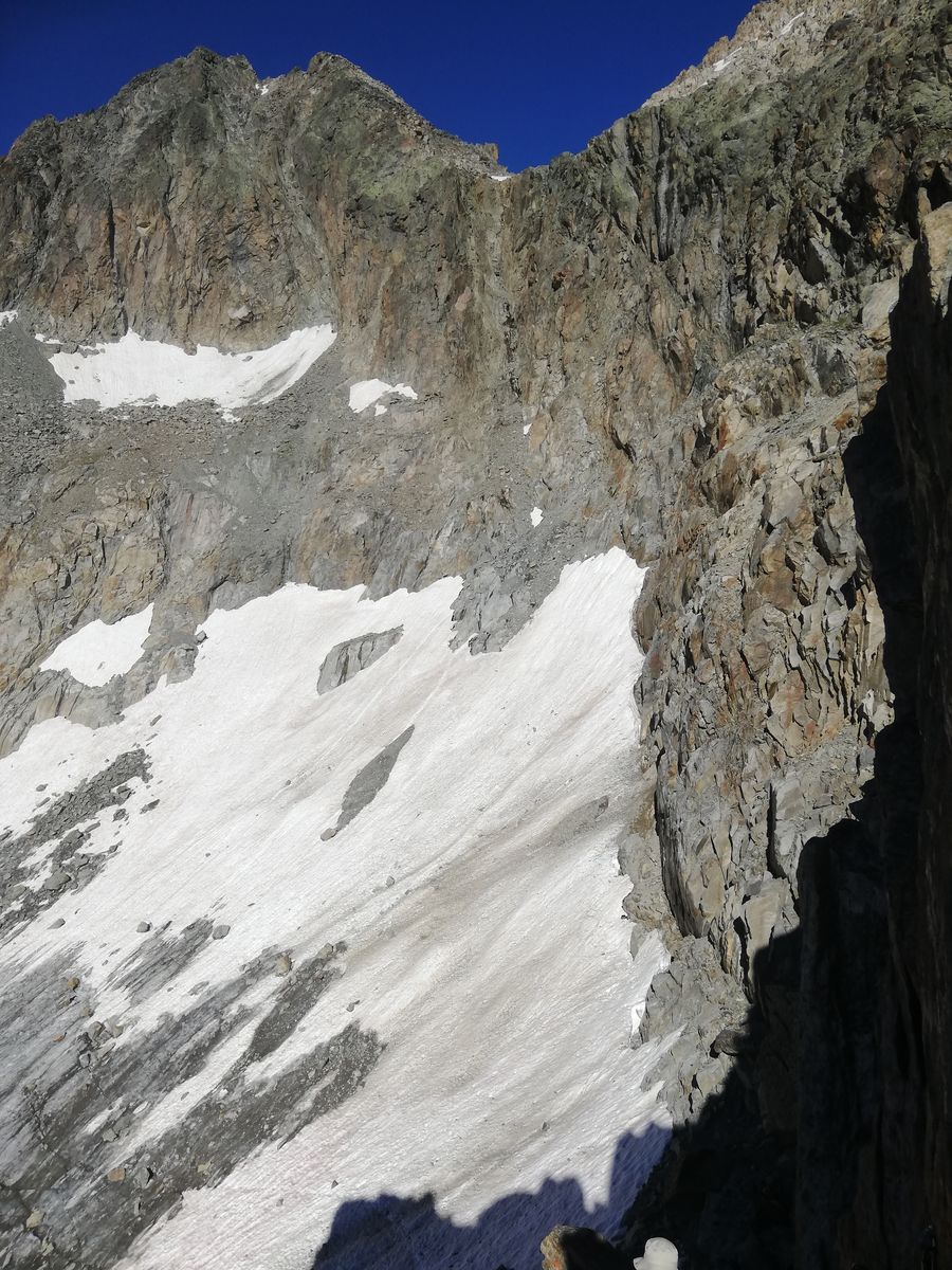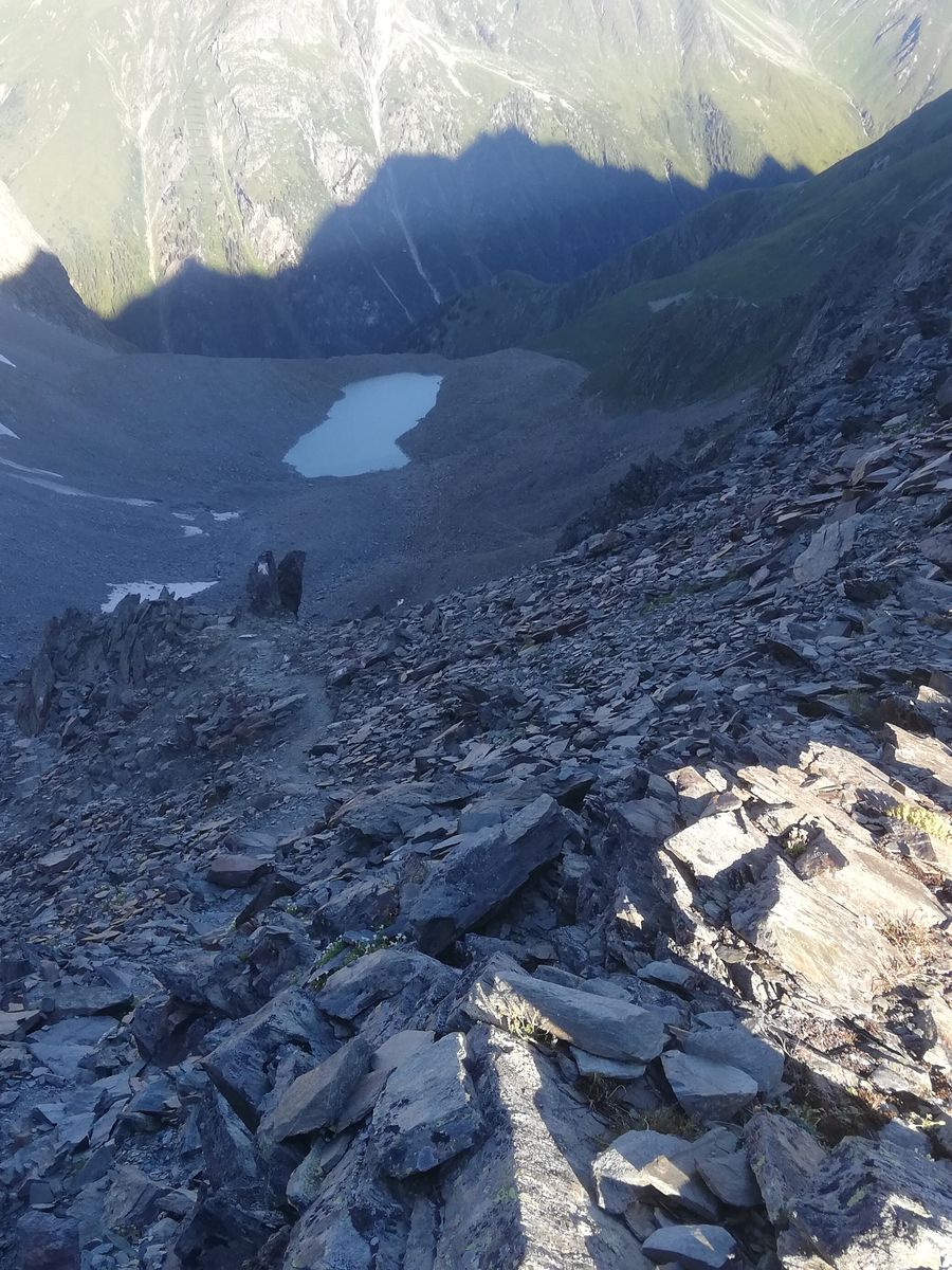Am Ende des Plateaus ("Frühstücksplatz") geht es rechts hoch zum Puitkogel (roter Schriftzug am Fels), der Höhenweg führt steil zunächst durch eine Rinne, dann eine Wandstufe bergab (mit Ketten als Sicherung) zu den Resten des Südlichen Puitkogelferners. Den zu queren ist nicht so einfach, denn hier ist auch Blankeis. Wer ihn wieder möglichst ohne großen Höhenverlust queren will - den folgenden Markierungen entsprechend - muss hier aufpassen, denn der Firn wird täglich weniger. Grödeln (oder Leichtsteigeisen) sind hier kein Luxus, mit Vorsicht geht es gerade noch ohne. Man kann das Eis aber auch unterhalb umgehen und muss dann am Ende wieder durch Schutt zu den Markierungen aufsteigen - so haben es zwei andere gemacht. Auch hier wird die Orientierung bei schlechter Sicht schwierig werden. Man quert dann weiter in der Flanke unter dem Sonnenkogel durch und steigt nach Querung dessen Ostgrates ein Kar (derzeit noch ein großes Schneefeld) hoch bis zum Hauptgrat. Auf oder knapp daneben weiter zum Gipfel des Wassertalkogels mit seiner Biwakschachtel (Rheinland-Pfalz-Biwak).