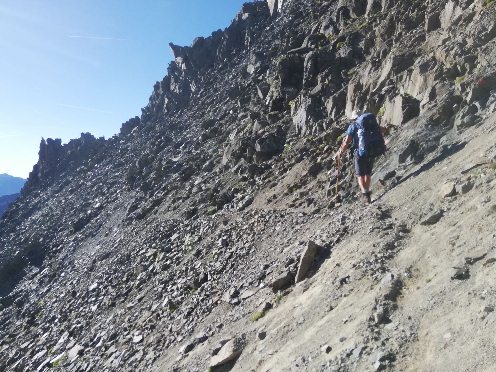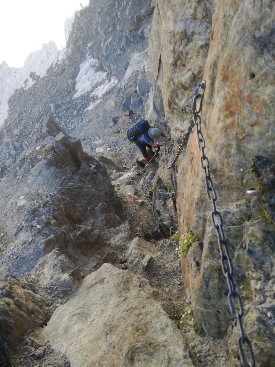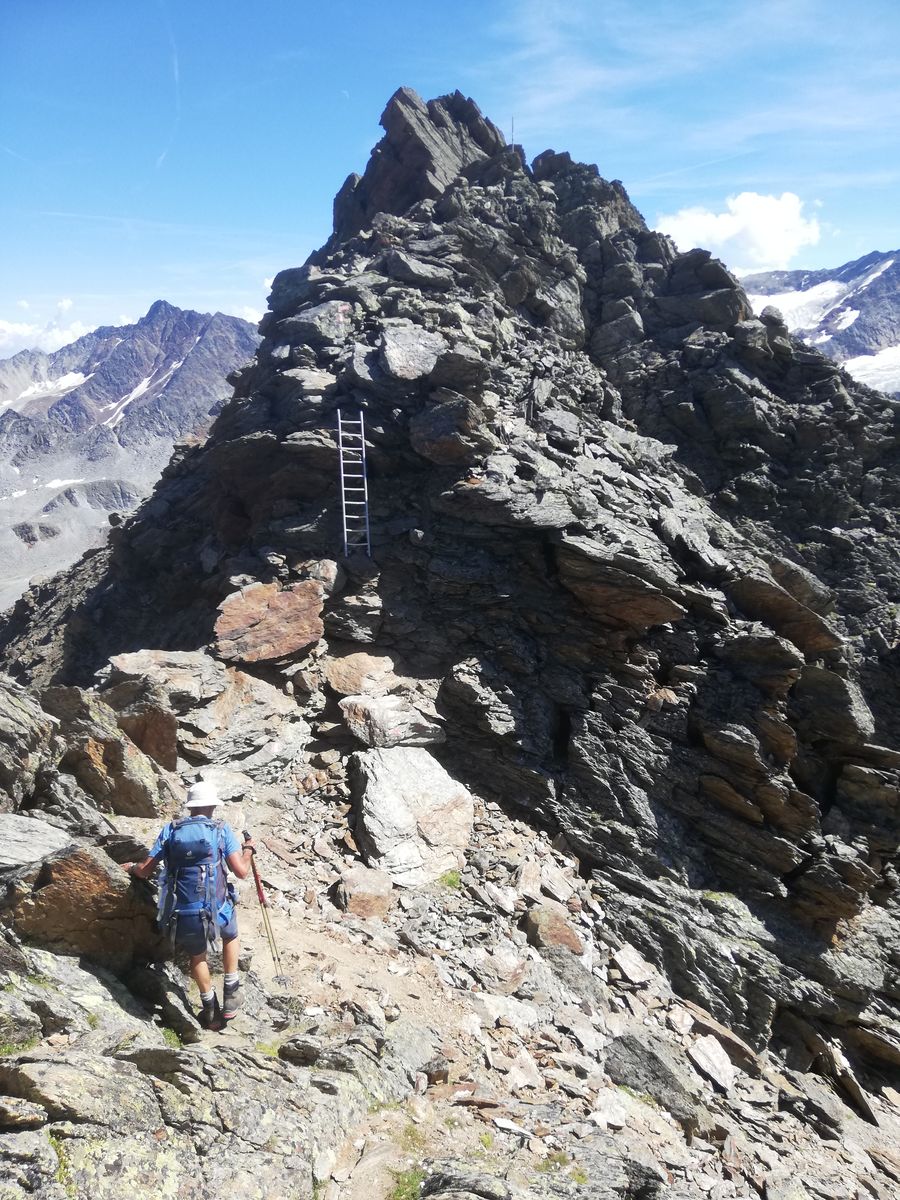 Von nun an geht es zwar ganz überwiegend bergab, aber es ist noch elend weit und der Steig führt stets auf oder knapp neben dem Gratrücken durch grobes Blockwerk. Einen Steig gibt es hier nicht, nur Markierungen. Nennenswert bergauf geht es noch auf den Gschrappkogel, die anderen Erhebungen sind kaum der Rede wert. Irgendwann kommt man in einen weiten Sattel (Nördliches Pollesjoch) und es teilt sich der Weg. Die längere Variante ("Retenbach", soll etwa eine Stunde länger dauern als der nach unten abzweigende, wohl erst in den 2000er Jahren neu angelegte Steig) führt nochmals nach oben (und ins Gletscherskigebiet), die kürzere (= Franz-Auer-Steig) bergab. Dieser Steig ist aber auch nur eine Steigspur und führt nochmals rund 120Hm bergab und dann wieder hoch, zunächst durch Schutt, dann - ziemlich unerwartet - ein Stück annähernd senkrecht am Stahlseil, die Füße in einer kleinen Schuttrinne... Ob das zwingend so sein muss oder die Erbauer hier zwanghaft eine Klettersteigstelle einbauen wollten - ich weiß es nicht. Wegen des Schutts muss man Deckung suchen, bis ein etwaiger Vorgänger die etwa 10-20m hohe Stelle passiert hat. Obwohl also der Steig jetzt nicht so toll ist, er ist ca eine Stunde kürzer und das ist ungemein hilfreich. Nach der Klettersteigeinlage führt der Steig auf den Grat hoch und von dort - nun als sehr guter Steig - zur nahen Braunschweiger Hütte, wo man einen "Kulturschock" erleiden kann, denn man taucht aus der Einsamkeit des Höhenwegs ein in den Massenbetrieb der E5-Begeher, welche die große Hütte füllen.