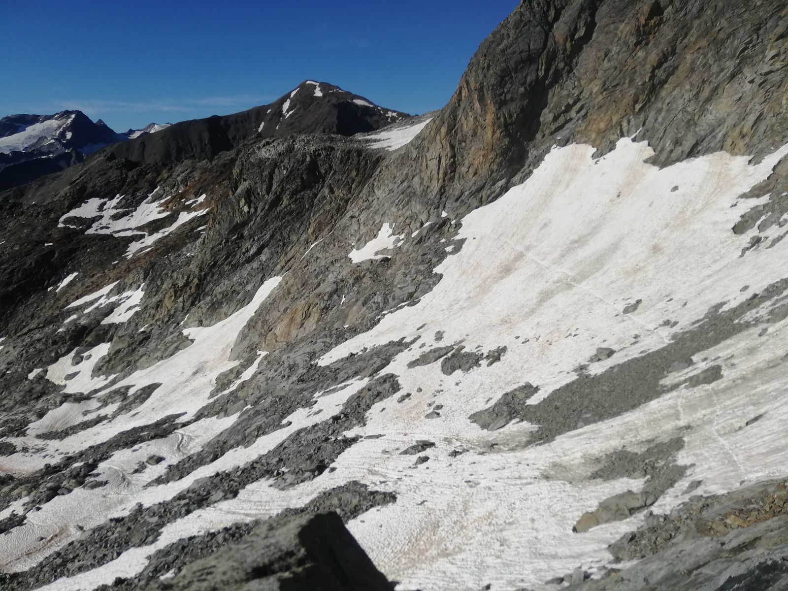 Das lange Gehen im groben Blockwerk ist überdurchschnittlich ermüdend, die warme Witterung tut derzeit ein Übriges; Wasser zum Nachfüllen gibt es auf der ganzen Tour allenfalls in Form von Schnee.