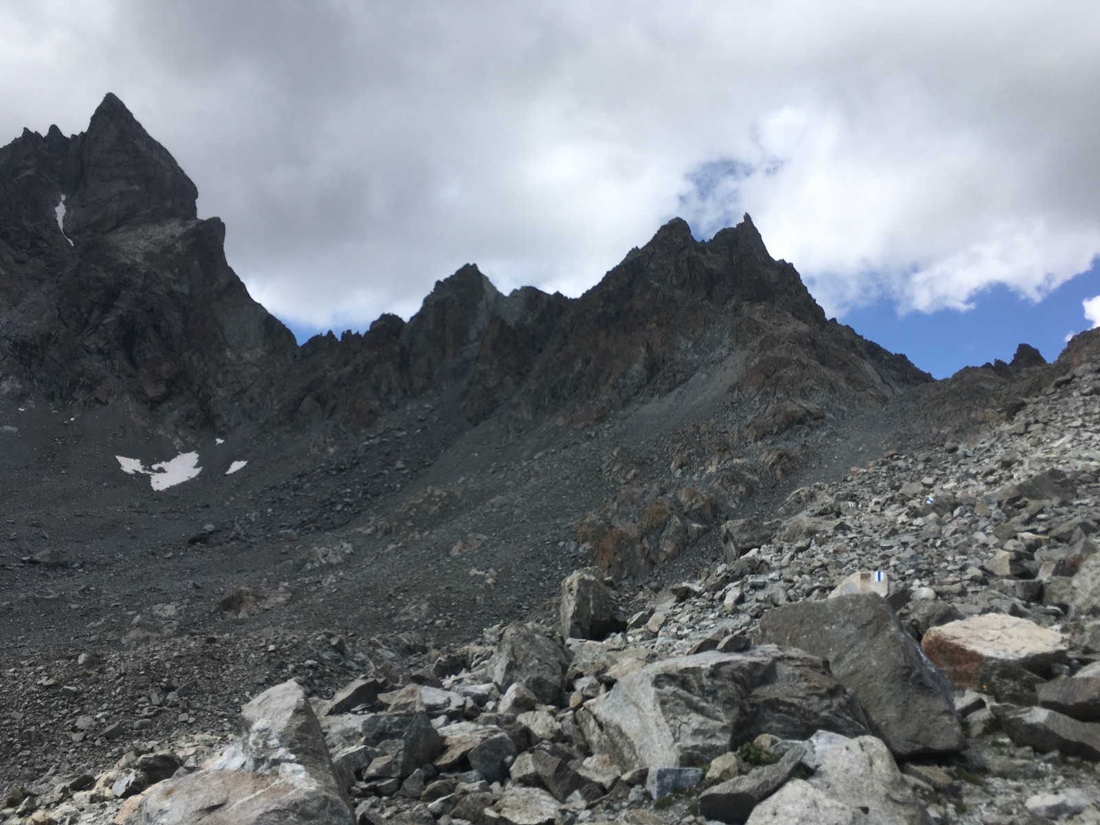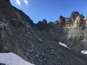 Durch Blockgelände geht es zu einer Art Mini-Scharte am rechten Bildrand hoch: