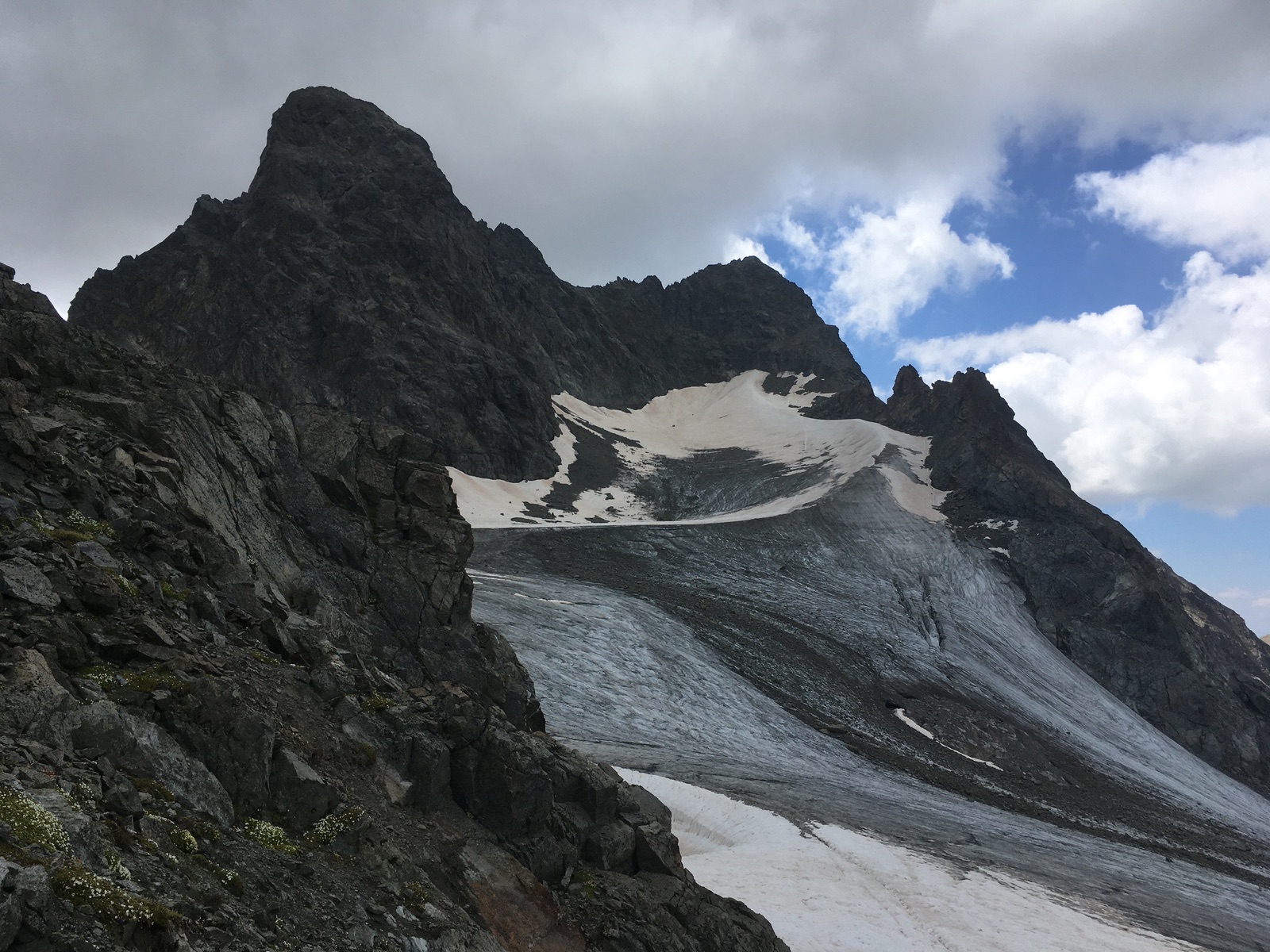 Bis zur Chamanna d'Es-cha ist es ein gut ausgebauter Wanderweg, den auch viele Familien als Tagesausflug zur Hütte machen. Also Einsamkeit wird man hier zu dieser Jahreszeit nicht finden. Eventuell wäre die höhenmetermäßig längere Route von Madulain etwas einsamer. Hinter der Hütte geht es noch etwas auf einem Wanderweg weiter, bevor man in ausgedehnte Blockhalden und zuletzt Bröselgelände zur Porta d'Es-cha kommt (Helm zu empfehlen). In der Querung von einer Art Mini-Scharte zur Porta d'Es-cha darf man sich nicht von den Markierungen oben im Fels verwirren lassen - die Steigspuren sind weiter unten (vielleicht stammen die Markierungen noch aus einer Zeit, als der Fels unterhalb nicht abgerutscht war oder da ein dauerhaftes Schneefeld / Gletscher war?) Zur Porta d'Es-cha geht es zuletzt an Ketten im Bröselfels herauf und dann einige Meter auf der anderen Seite wieder herunter. Der Porchabella-Gletscher ist stark zurückgegangen und bis auf ca. 3.000 m hinauf bis auf wenige Meter aper. Dann geht es über eine Art Schneegrat zum Einstieg in den Felsteil. Ich hatte die komplette Gletscherausrüstung mitgenommen, würde das aber bei solchen Verhältnissen nicht mehr machen - Steigeisen oder evtl. sogar nur Snowlines dürften reichen. Persönlich neige ich da aber immer dazu, eher mehr Material (schwer) mitzuschleppen, als einmal das benötigte Material / Sicherheitsausrüstung nicht dabei zu haben. Wenn der gesamte Gletscher aper ist, ist der oberste Teil etwas steiler.