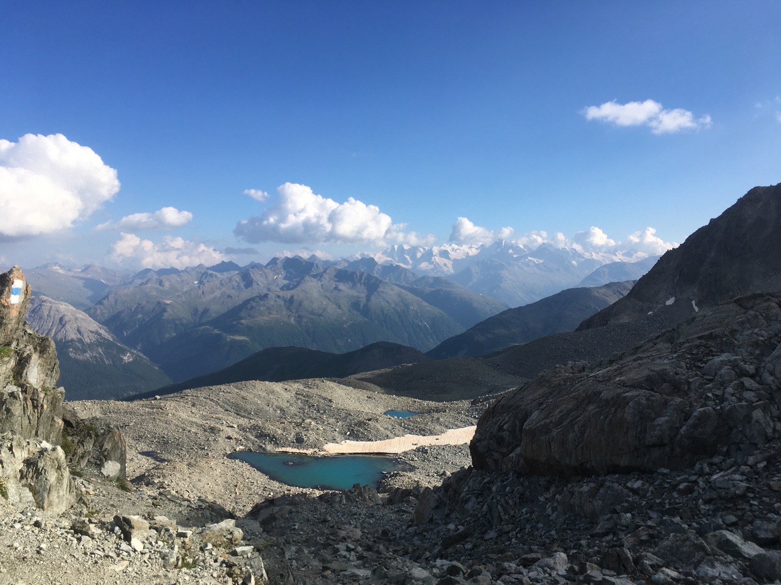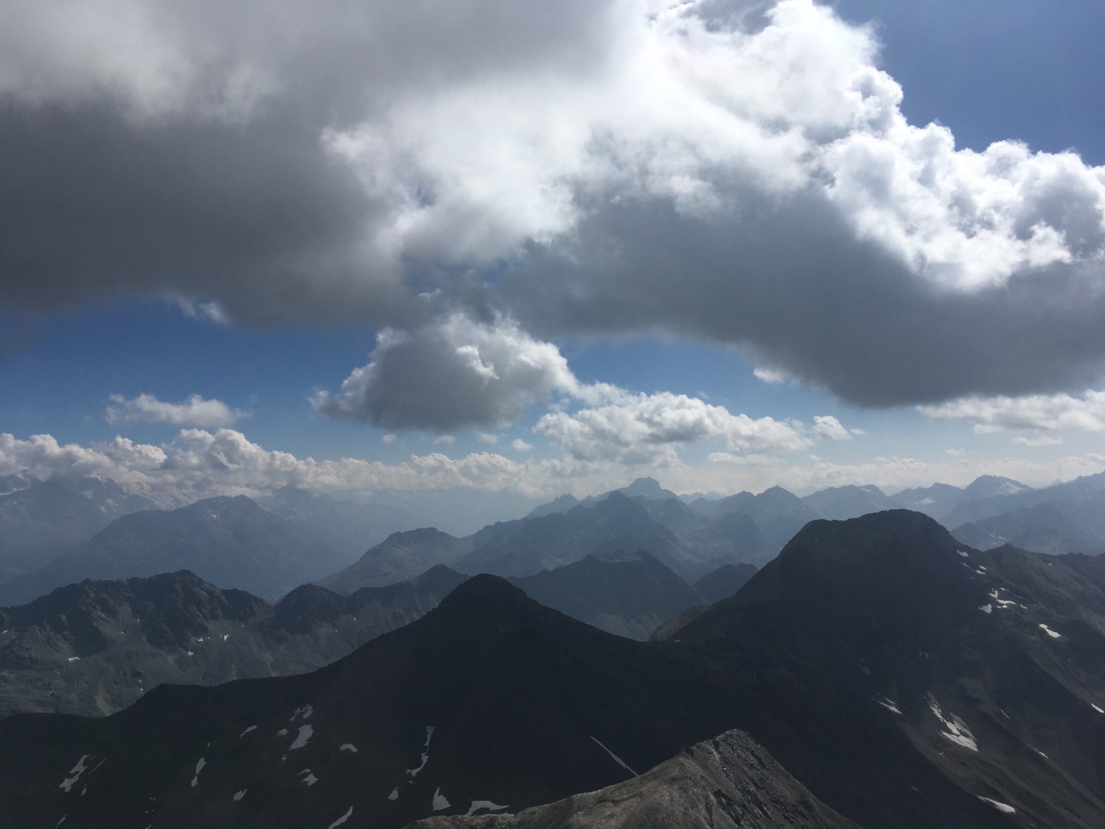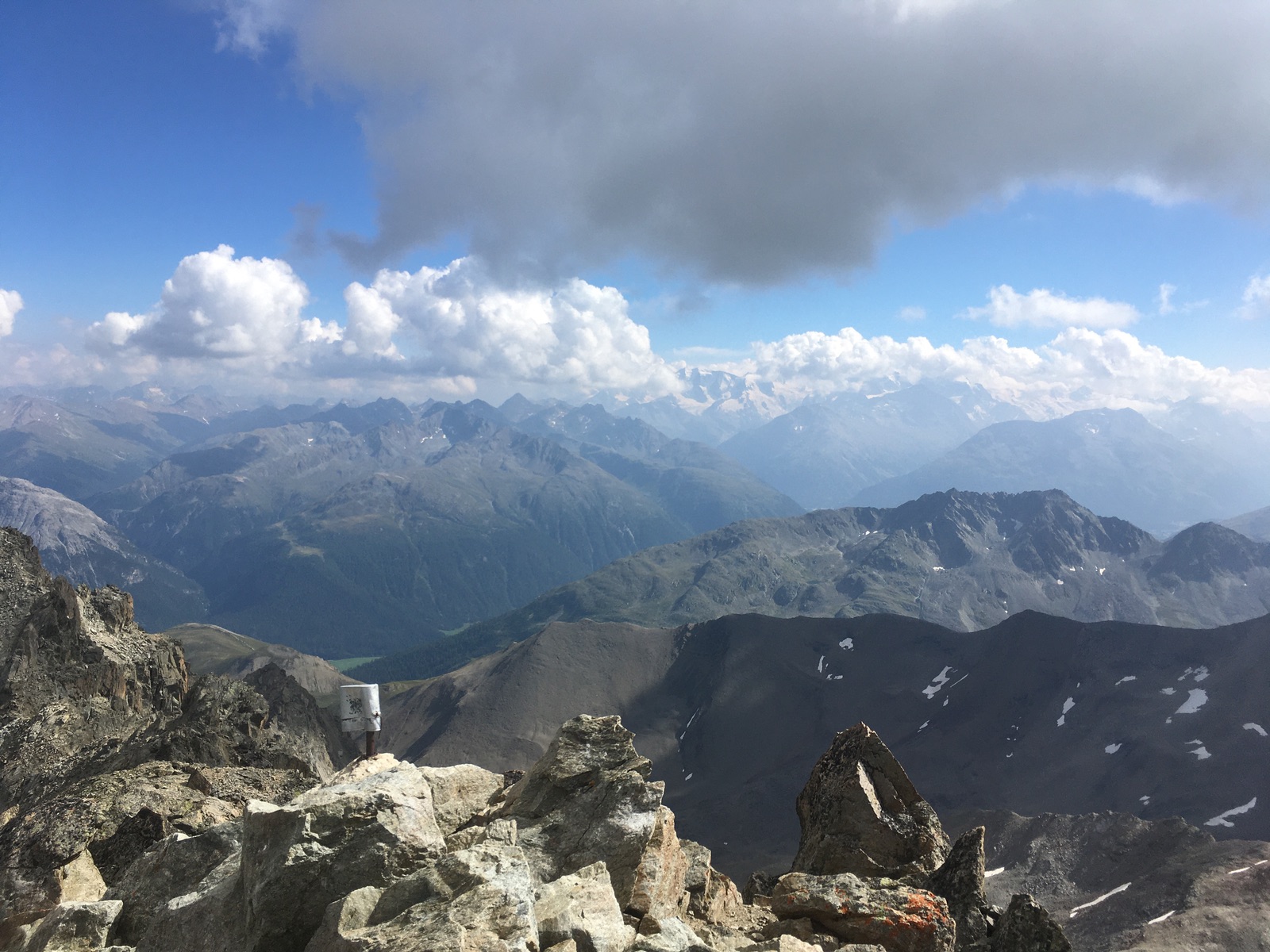 Auf dem kreuzlosen Gipfel des Piz Kesch mit Blick zur Bernina-Gruppe - häufig Wolken, wobei man schön Bellavista und den Biancograt sah (kommt auf dem Foto wohl nicht heraus):