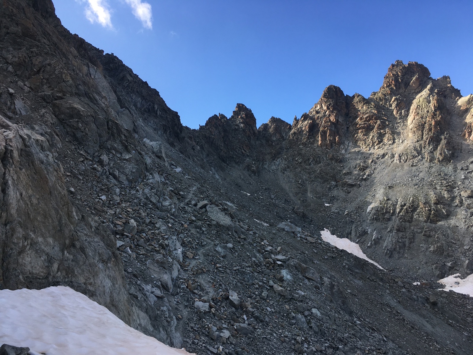 Im Internet wird in fast allen Beschreibungen vor der massiven Steinschlaggefahr am Gipfelaufbau gewarnt und so überlegte ich im Vorfeld länger, wie man das am sichersten machen könnte: Die Idee war, spät aufzusteigen, um dann allein zu sein, nachdem alle Hüttenübernachter schon wieder unten sind. Um es kurz zu machen: Der Plan ging auf, aber dafür hätte ich dennoch nicht (ungeplant) erst nach dem Mittagsläuten in der Hitze starten und dann mich ziemlich spurten müssen.