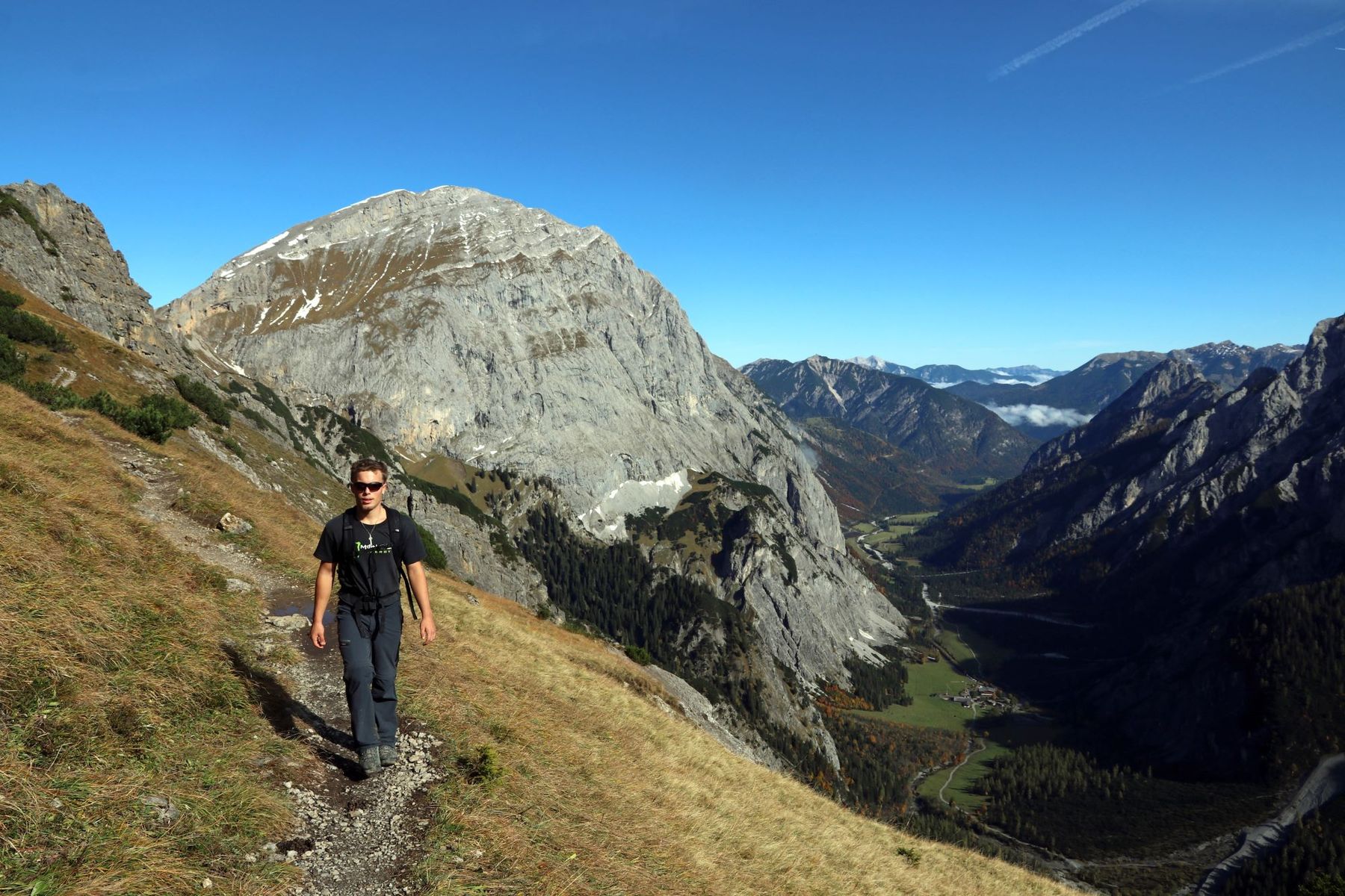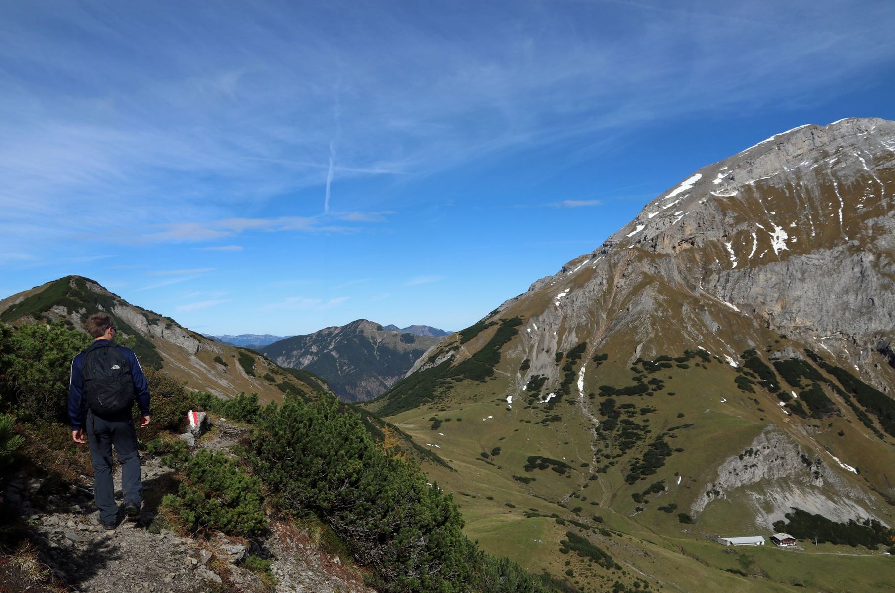 Der Anstieg von der Eng zum 2050 Meter hohen Hahnkampl ist komplett schneefrei und auch das gegenüberliegende Sonnjoch (2458 m) kann man südseitig fast bis auf Gipfelniveau schneefrei besteigen. Im nordseitigen Hochglücklkar hat sich der Septemberschnee hingegen festgesetzt. Hier dürfte die Schneegrenze bei etwa 2000 Metern liegen.