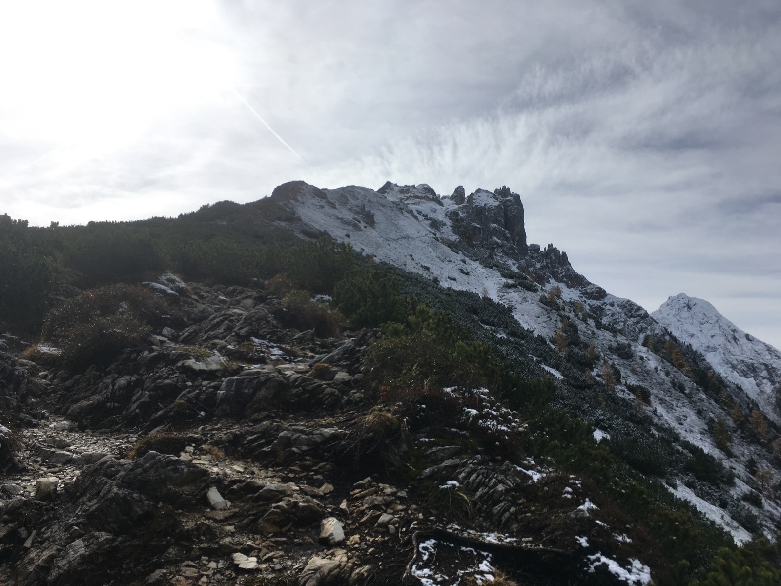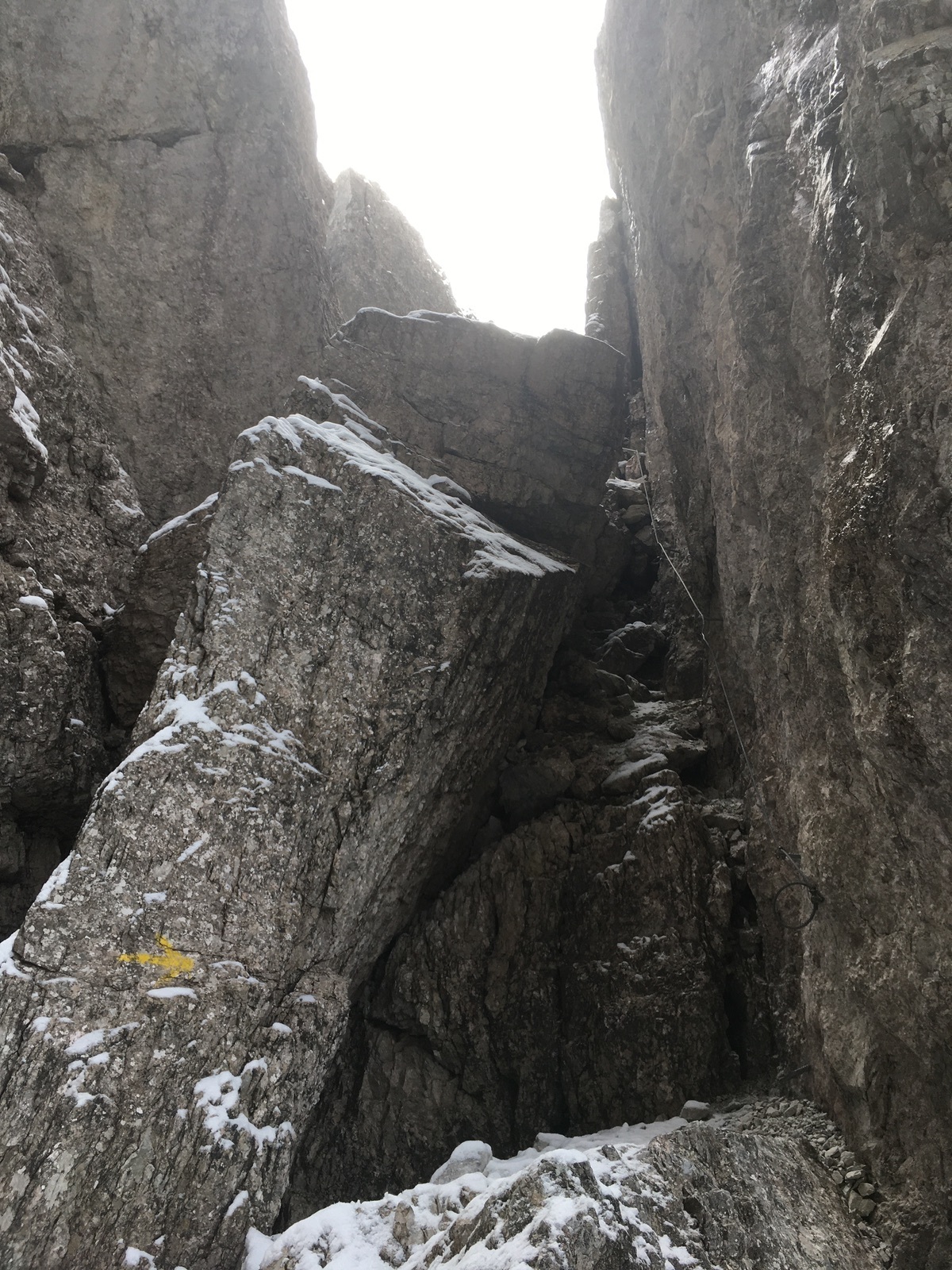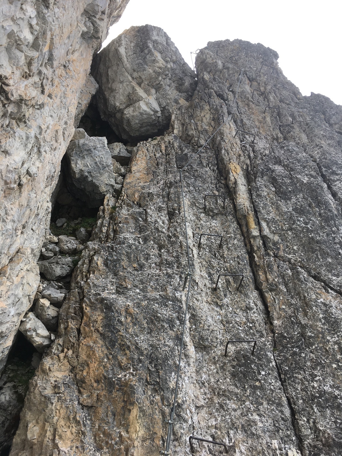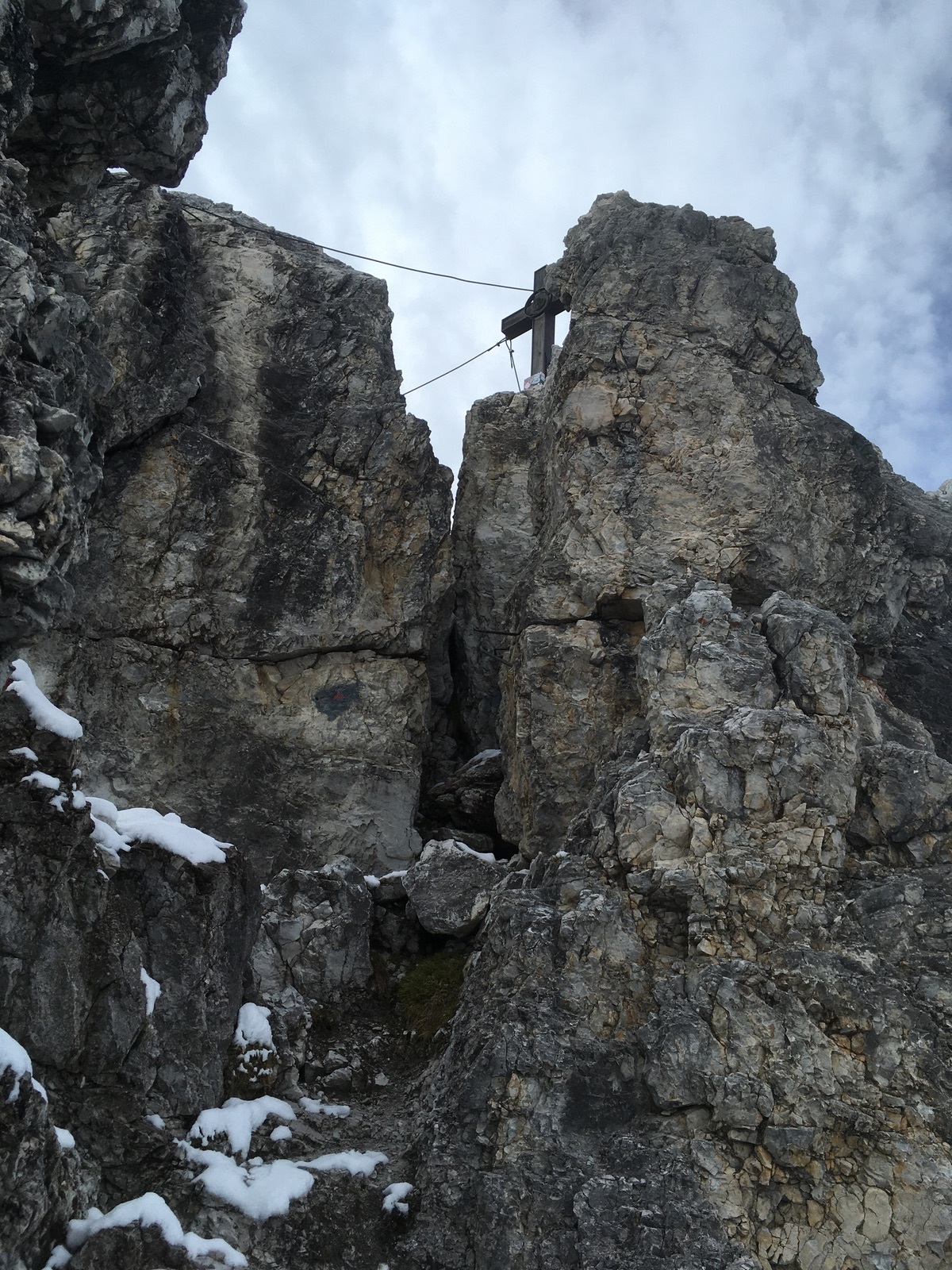 Insgesamt bei diesen Verhältnissen deutlich anspruchsvoller als sonst. Dadurch aber praktisch auch kein Andrang. Soweit der Elfer-Nordwand-Klettersteig für Kinder empfohlen wird, wundert mich das etwas: Er ist doch anspruchsvoll, zudem muss man an einigen Stellen große Schritte machen (oder es wird schwieriger). Dort, aber auch am Elferkofel-Klettersteig gibt es übrigens mehrfach die Besonderheit, dass das Drahtseil 1-2 m über dem "Boden" endet. In Abstiegspassagen und erst recht bei Nässe dadurch herausfordernd.