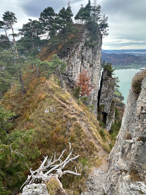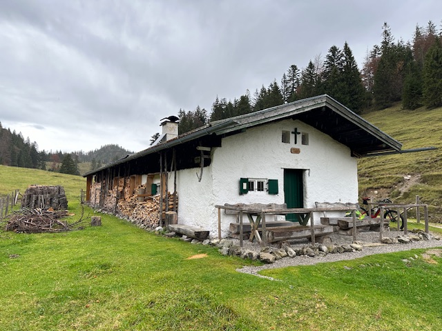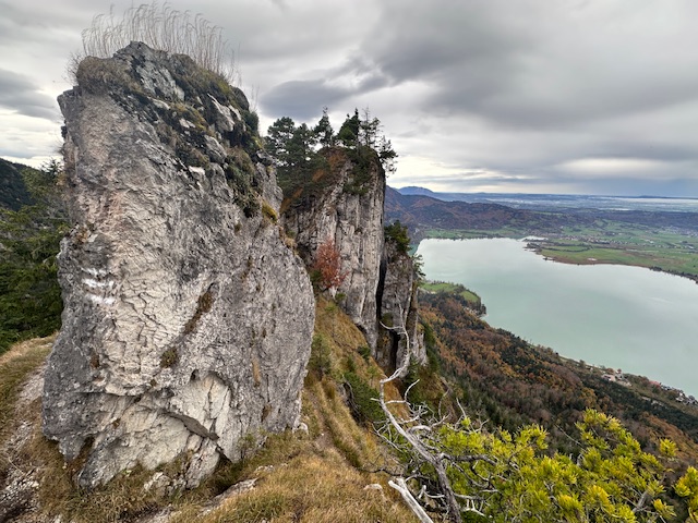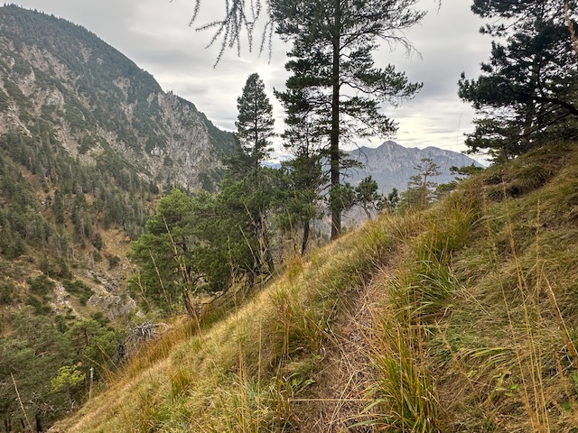 Zu Fuß nun auf dem schmalen Pfad weiter, bis es rechts steil raufgeht zum Graseck, das ich von Osten her erreichte. Beim Felstürmchen nahm ich versehentlich die schwierige Variante (T5, echt sehr exponiert), der Rest war gemütlich. Abstieg nach Westen, dann zurück zum Bikedepot. Als nun am späten Vormittag Regen einsetzte, nutzte ich auf dem Rückweg das Vordach der Kotalm zur Brotzeit.